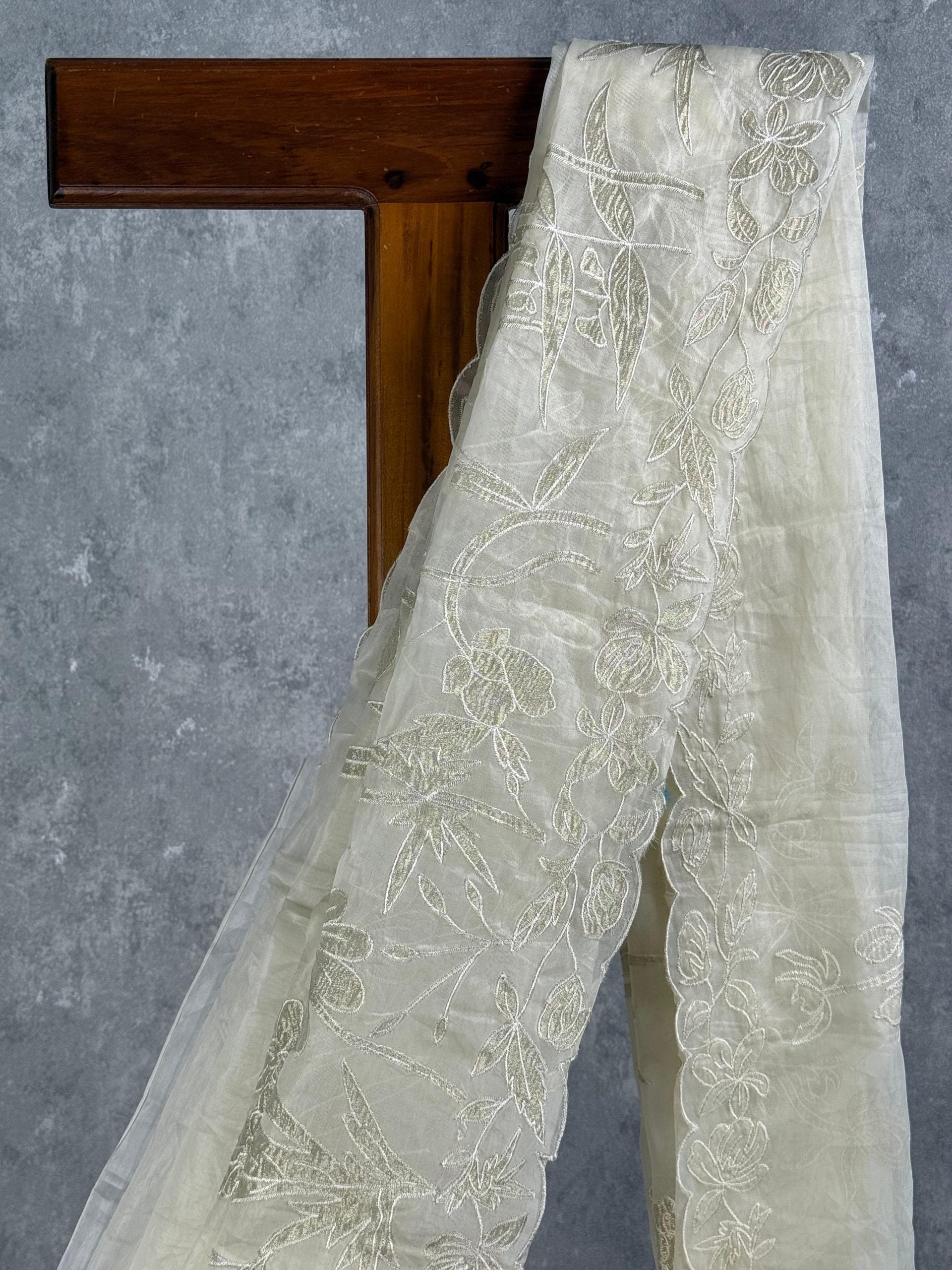 This semi organza tissue appliqué embroidery saree is a stunning piece of traditional Indian attire. The saree features a beautiful cream color with intricate floral patterns embroidered throughout, adding a touch of elegance and sophistication. The appliqué embroidery work adds a delicate and intricate detail to the overall design, making this saree a true masterpiece. The saree comes with attached self color blouse piece.