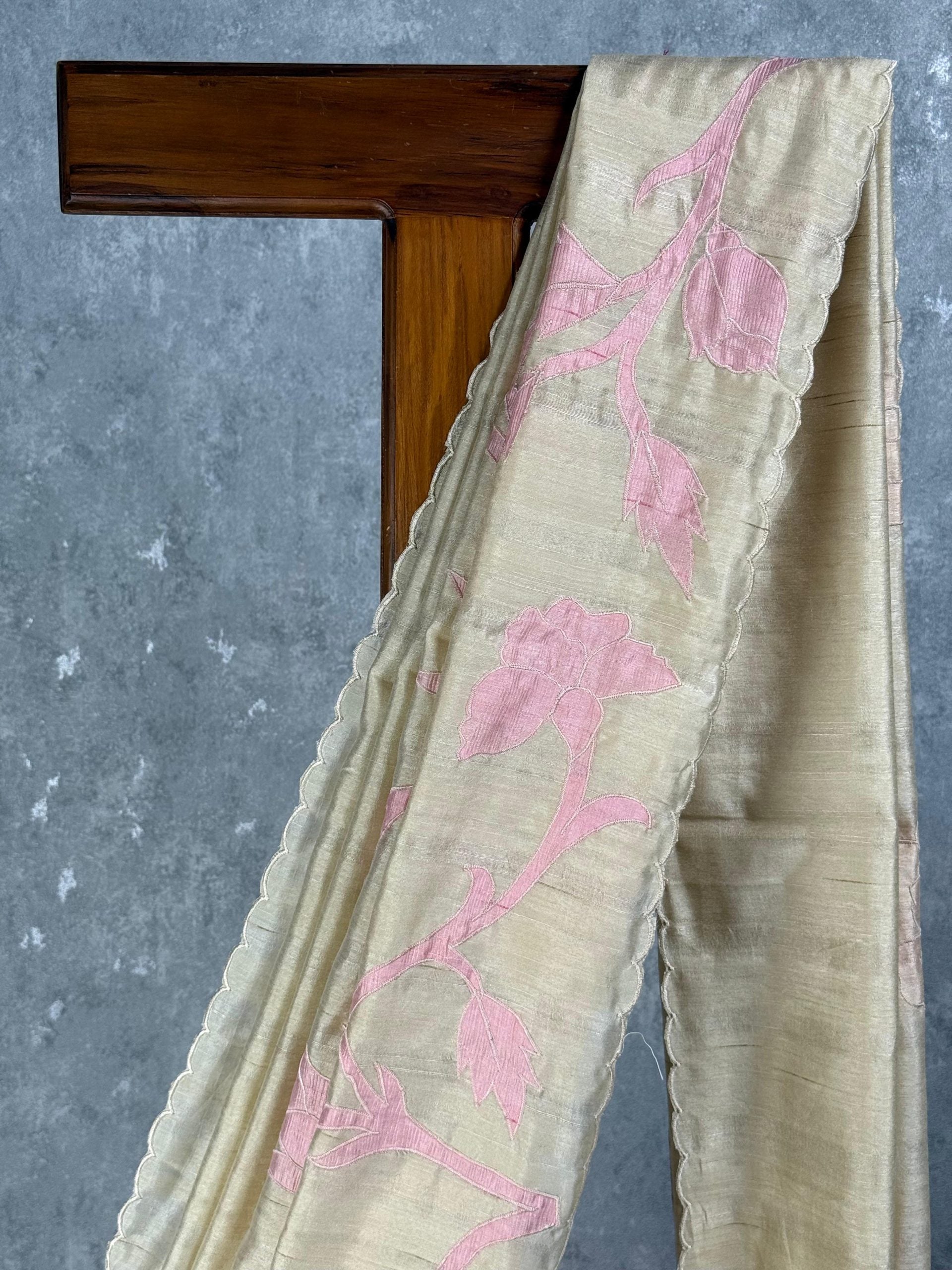 This semi Tussar appliqué embroidery saree is a stunning piece of traditional Indian attire. The saree features a beige base colour with intricate pink floral embroidery along the border, adding a touch of elegance to its overall design. The scalloped edges of the saree further enhance its beauty, making it a perfect choice for formal occasions. The combination of beige and pink creates a harmonious contrast that is both visually appealing and sophisticated. The saree comes with attached blouse piece.