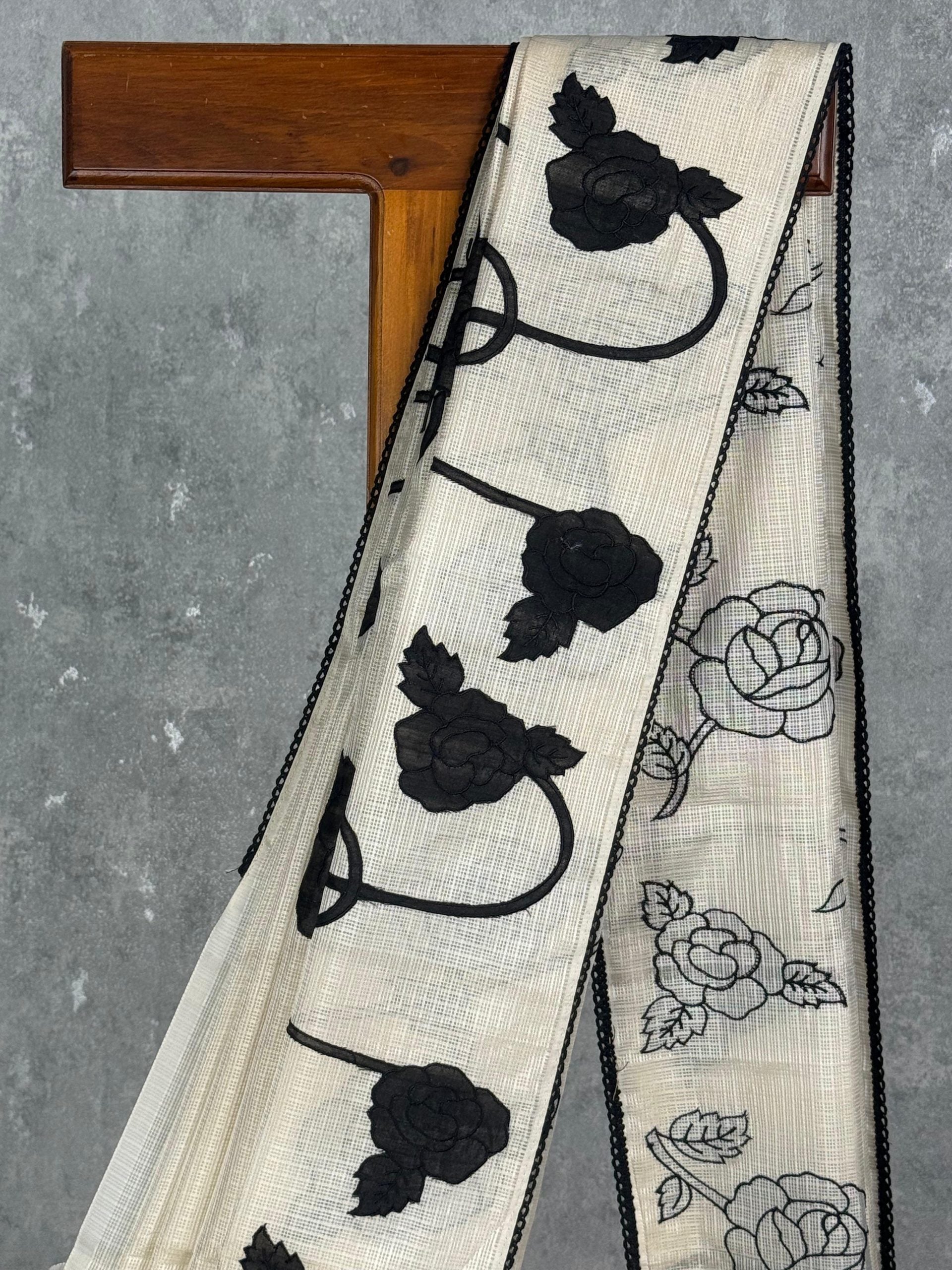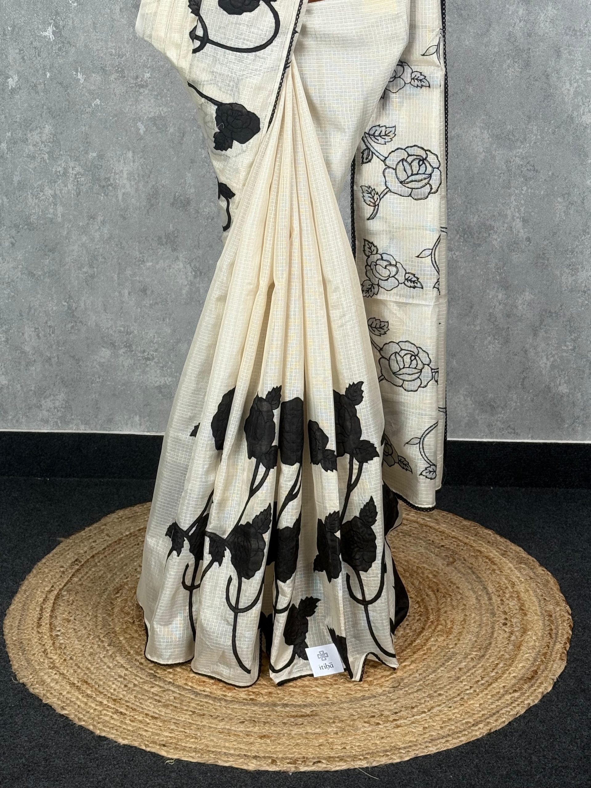 This elegant saree stands out with its ivory base adorned with bold black floral motifs, creating a striking contrast. The intricate design adds a modern artistic touch to its traditional charm. Perfect for both formal and festive occasions, it exudes sophistication with a contemporary flair.