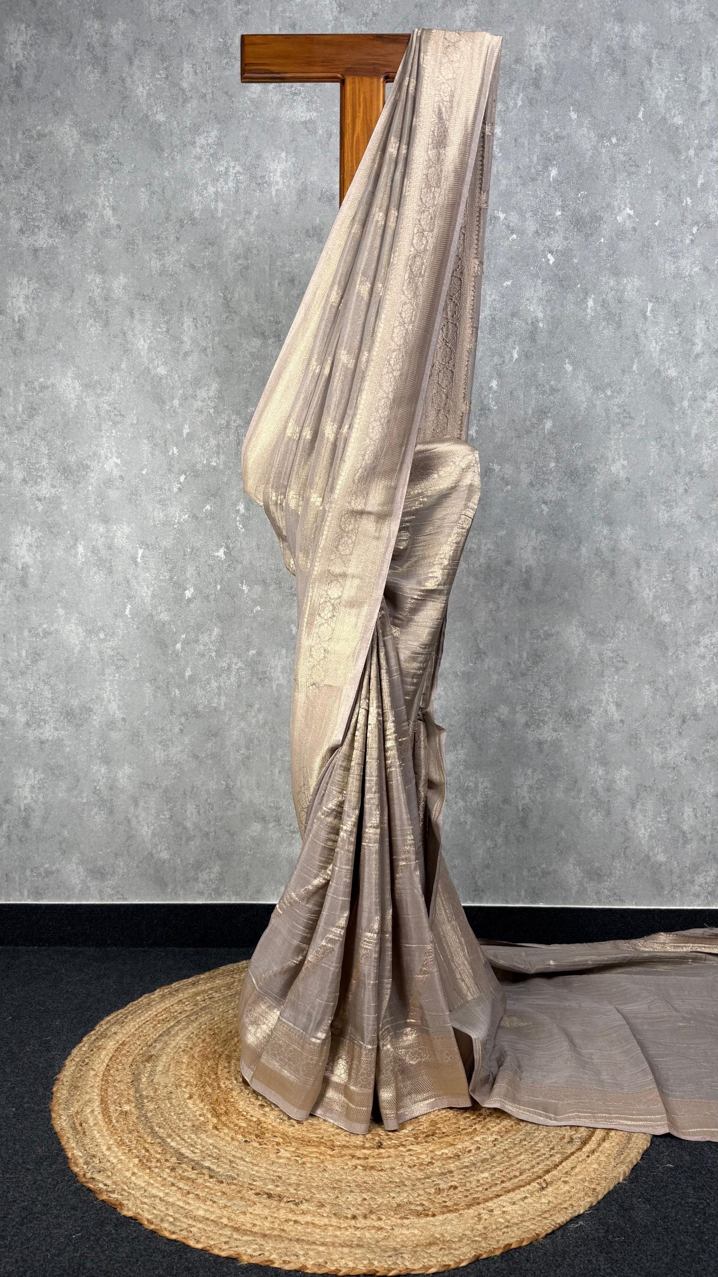 This is a graceful crushed tissue silk Banarasi saree in a beautiful champagne shade. It features delicate golden zari weaving along the border and pallu, adding a touch of elegance. The crushed texture enhance its traditional charm. The saree comes with self color blouse piece.