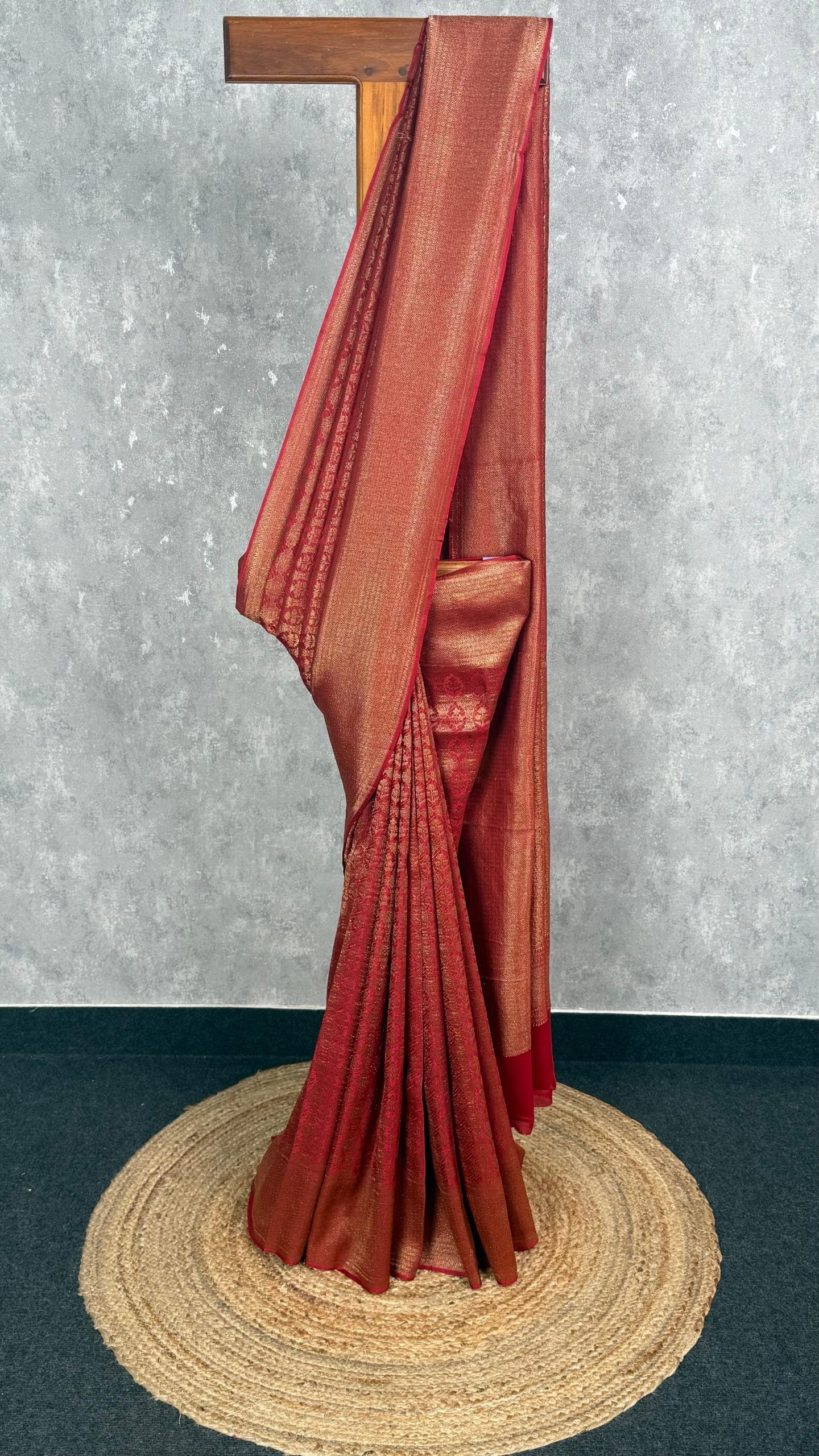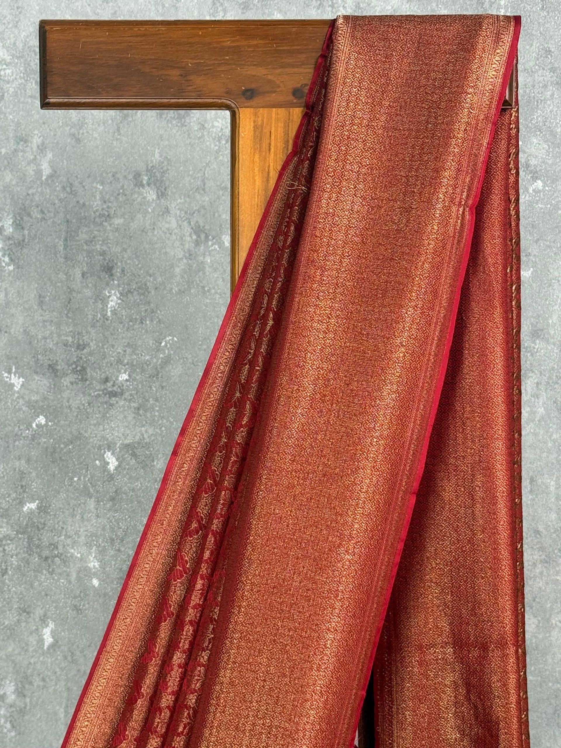 This saree features a beautiful blend of copper-red tones highlighted with a soft golden shimmer, giving it a rich and graceful appearance. The subtle woven motifs across the body add refined texture, while the smooth pallu enhances its elegant drape. Perfect for festive and traditional occasions, it exudes timeless sophistication and warmth.