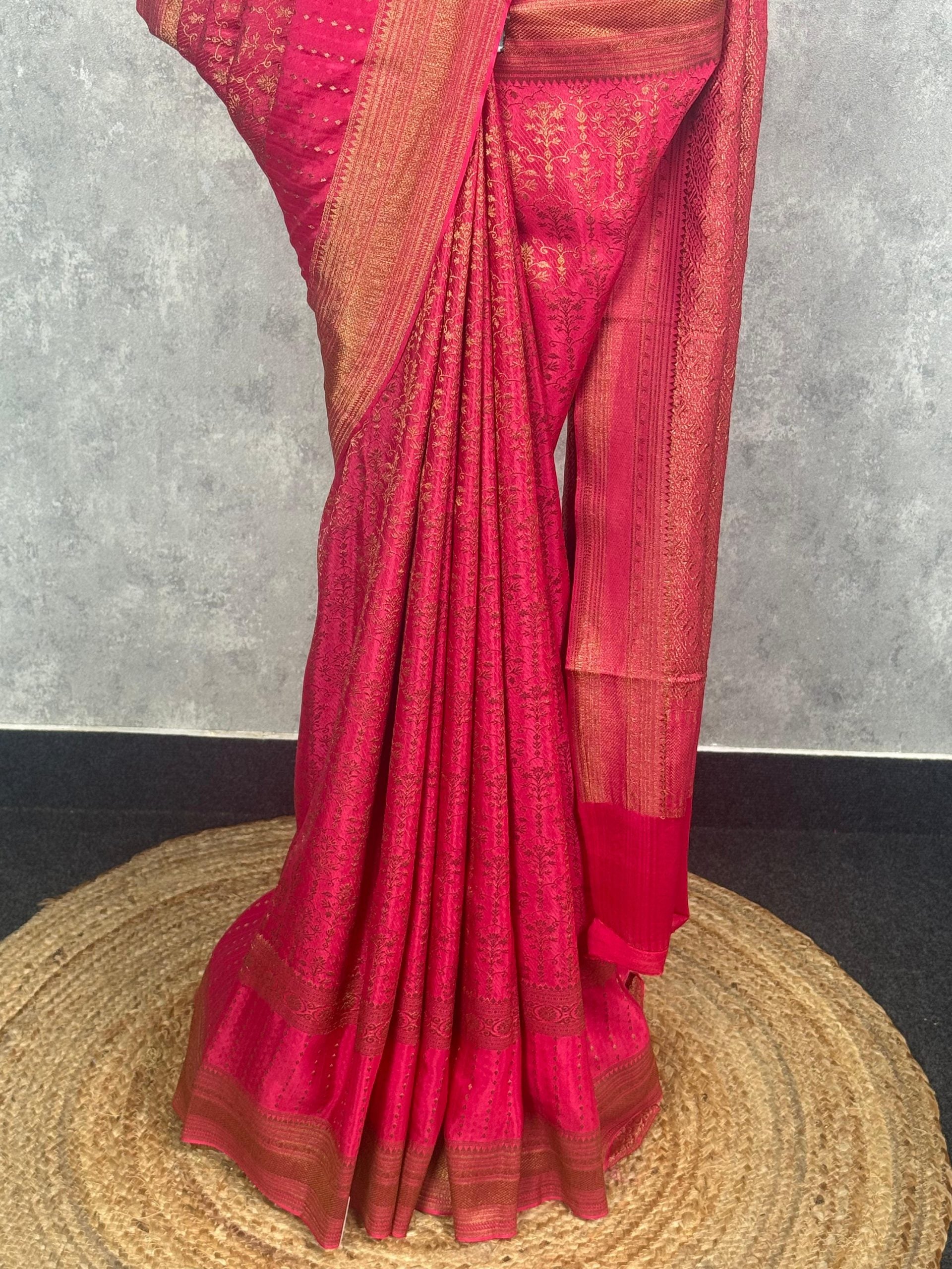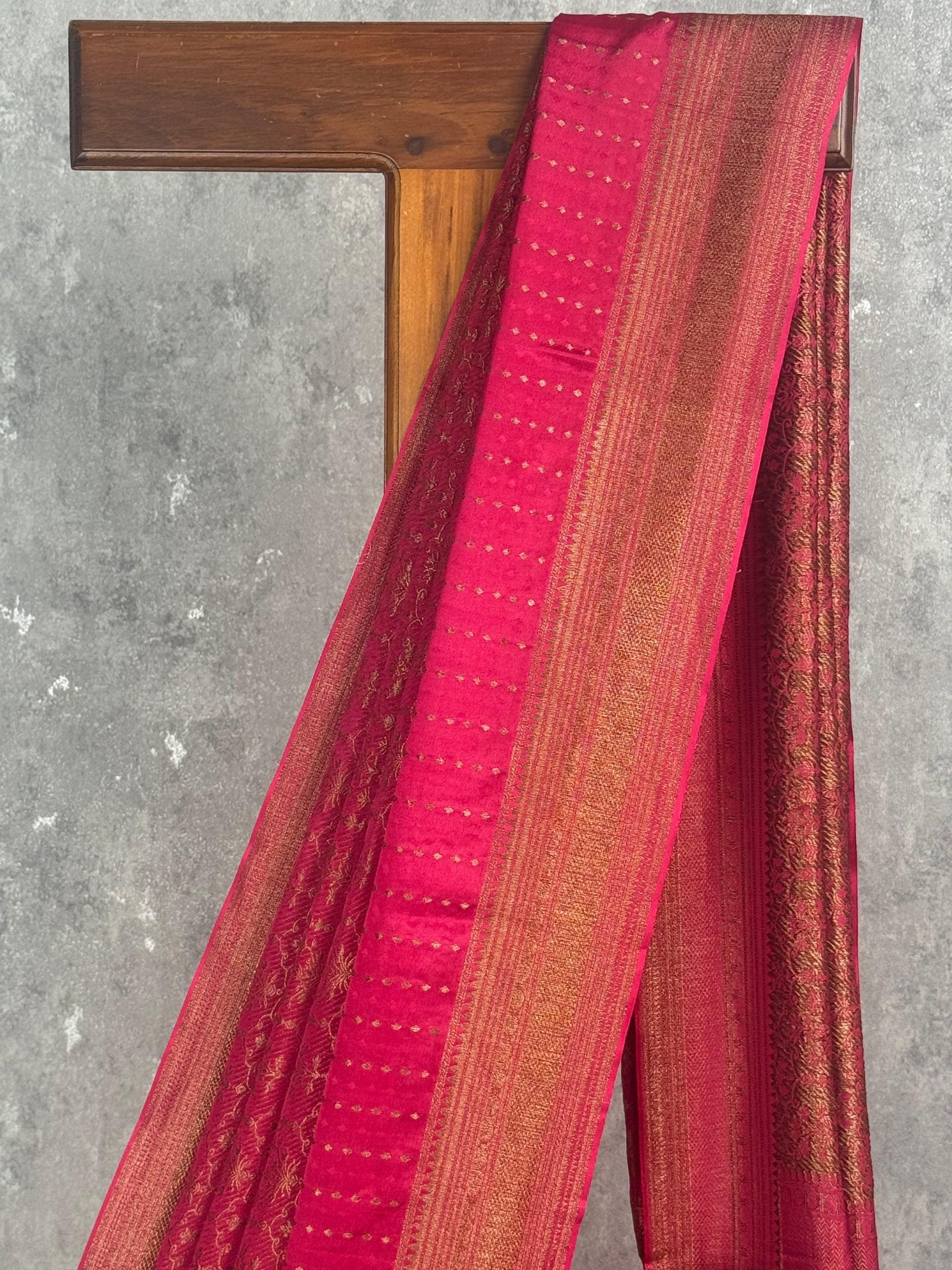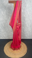 This saree glows with a vibrant rani pink hue, beautifully enriched by intricate gold zari weaving along the body and borders. The subtle dotted detailing on the pallu adds a touch of elegance, creating a perfect blend of tradition and festive charm. Ideal for weddings and celebrations, it offers a striking and timeless Banarasi appeal.