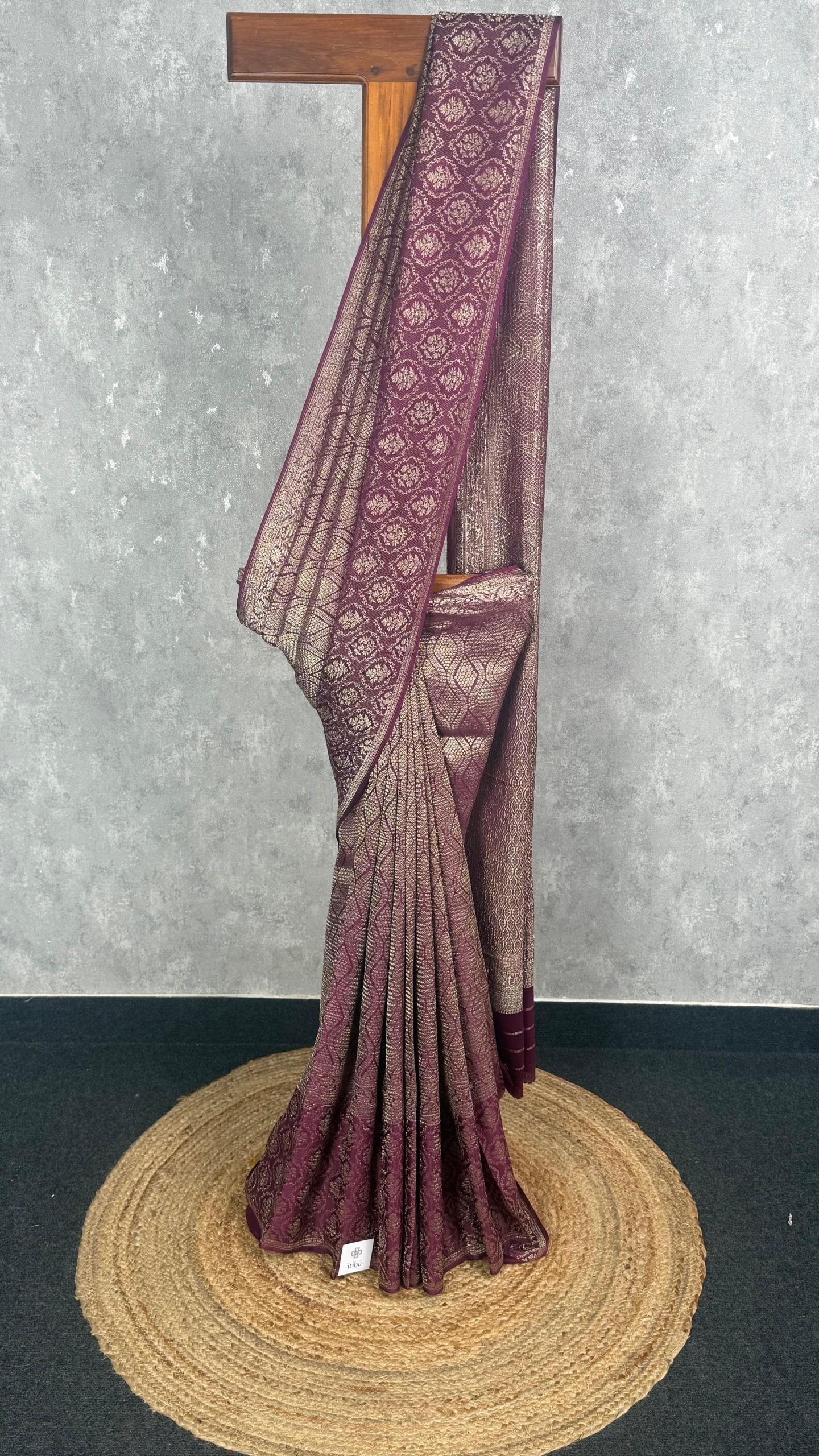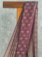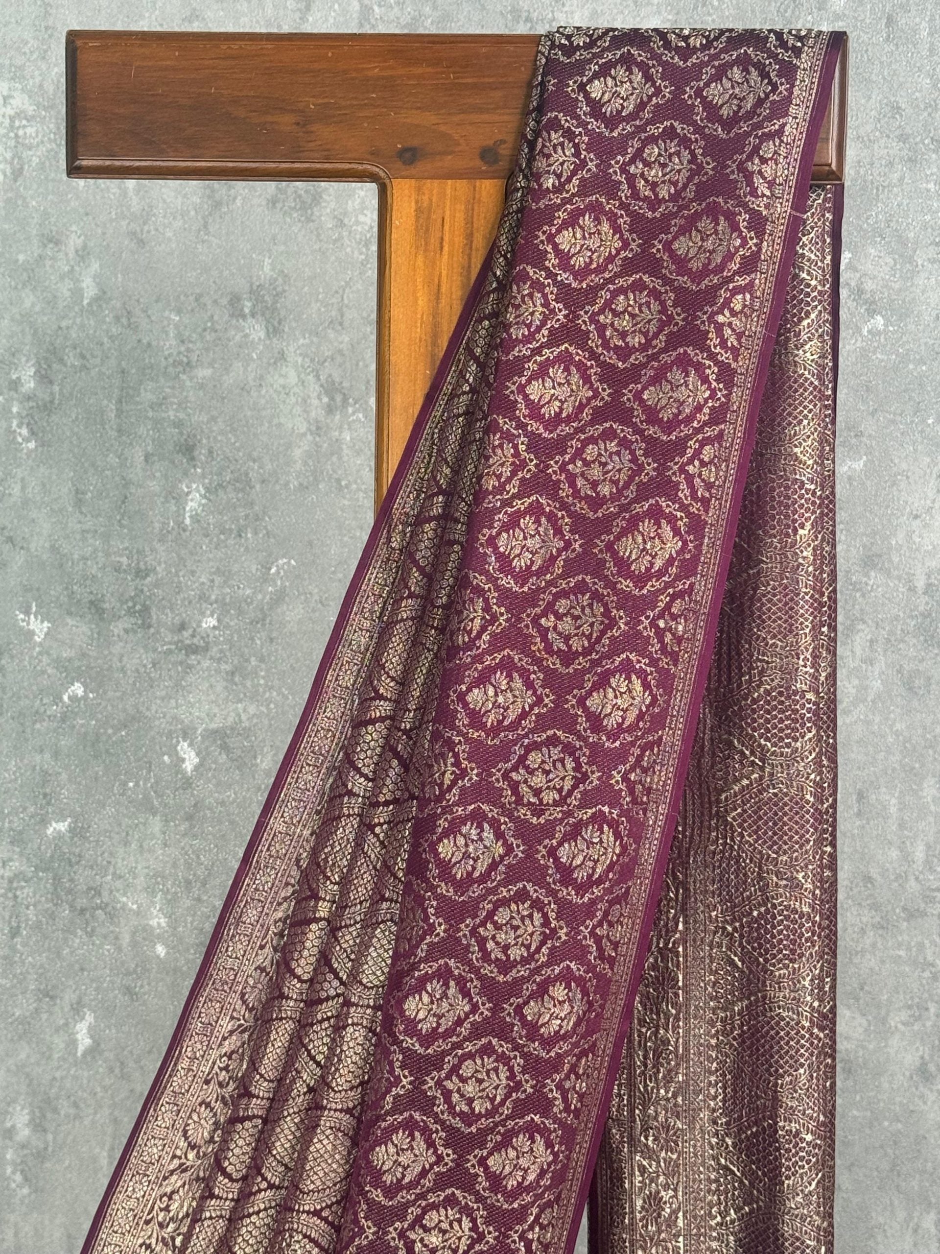This saree showcases a luxurious plum-wine shade beautifully paired with intricate gold zari weaving. The all-over patterns create rich texture and depth, while the contrasting pallu enhances its traditional elegance. Perfect for weddings and festive occasions, it exudes refined, timeless Banarasi charm.