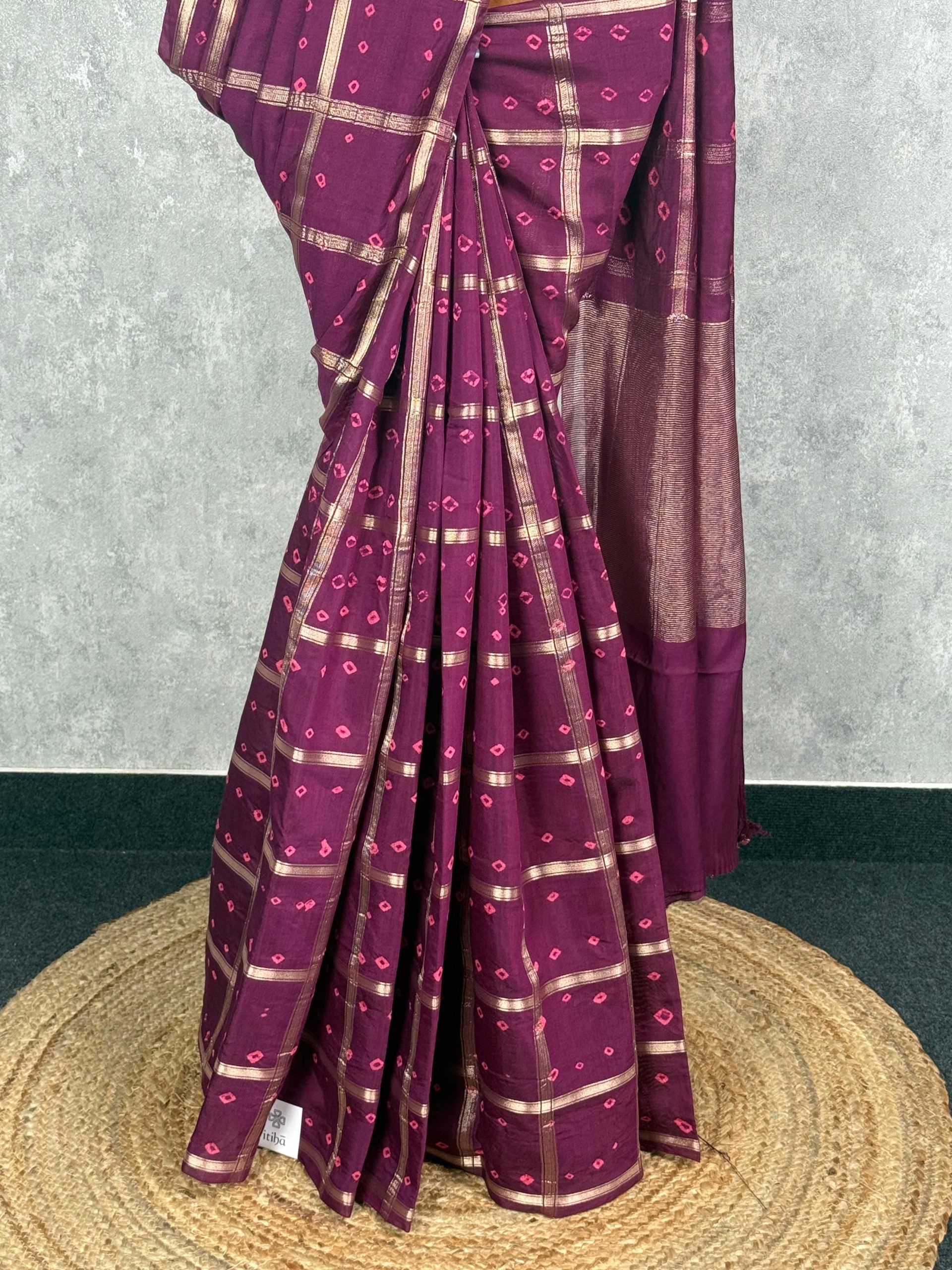 This saree exudes timeless elegance with its rich plum hue, enhanced by delicate golden checks and charming small motifs. The combination of vibrant colour and traditional detailing creates a sophisticated, festive look. Its graceful drape makes it perfect for celebrations and special occasions.