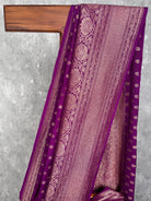 This stunning Semi Georgette Antique Zari Banarasi Saree comes in a vibrant purple shade, admired with intricate antique gold zari weavings. The saree comes with attached self color blouse piece.
