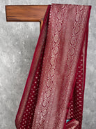 This stunning Semi Georgette Antique Zari Banarasi Saree comes in a vibrant Dark Red shade, admired with intricate antique gold zari weavings. The saree comes with attached self color blouse piece.
