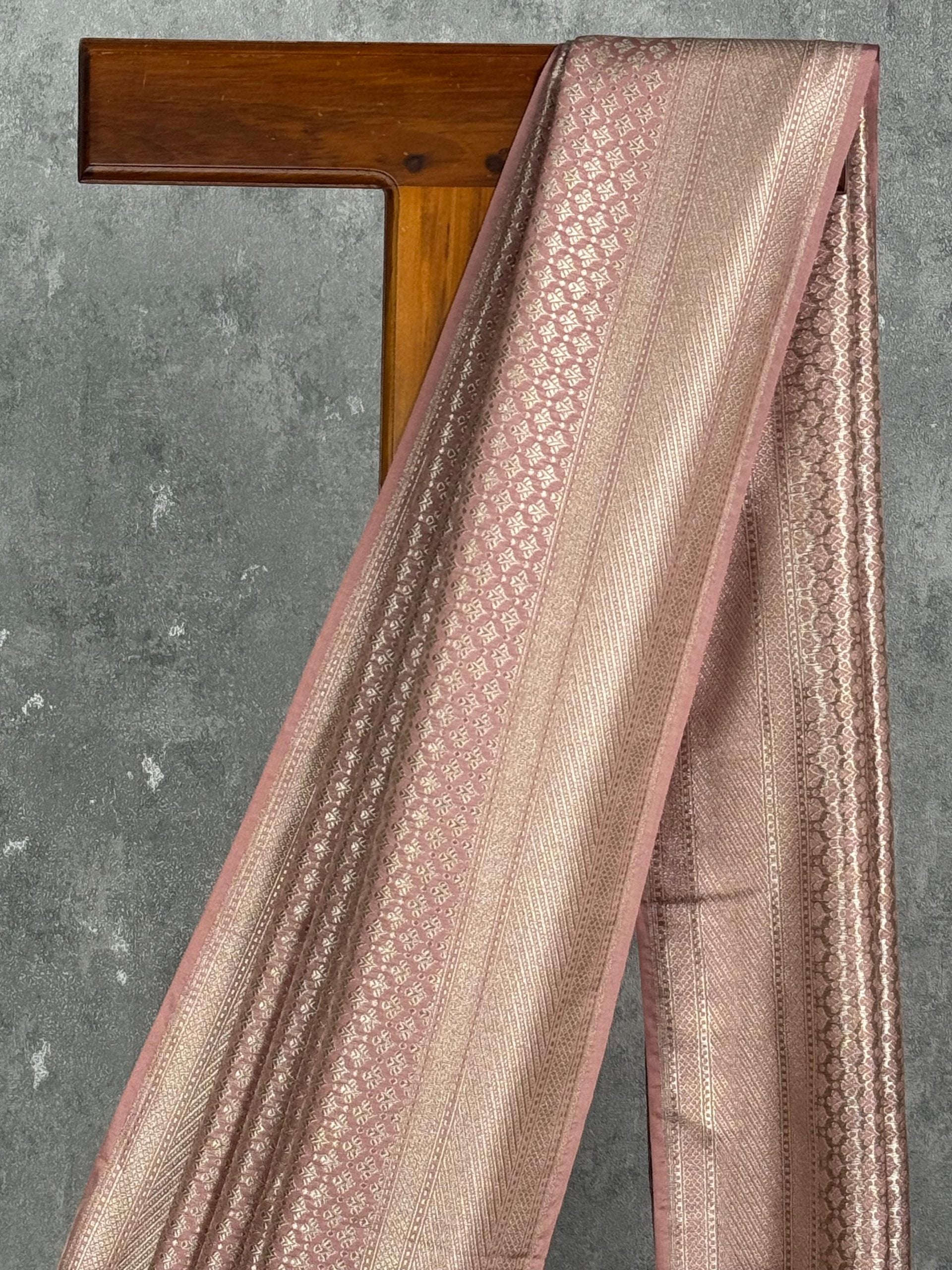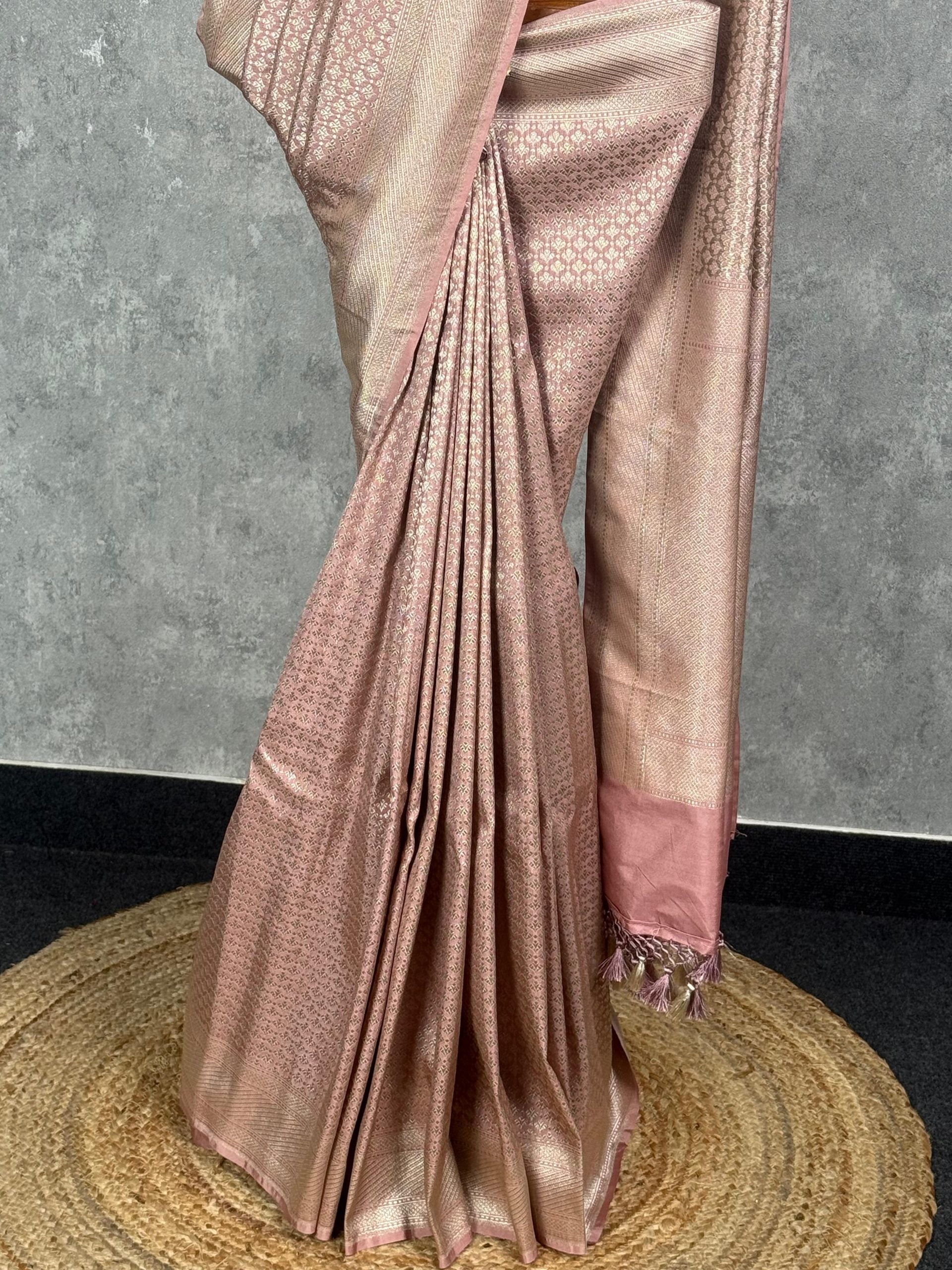 This saree radiates subtle luxury with its muted rose-gold tone and intricate all-over weaving. The fine patterns lend it a rich traditional appeal, while the soft sheen adds a graceful, modern touch. Elegant and timeless, it’s perfect for occasions that call for understated sophistication.