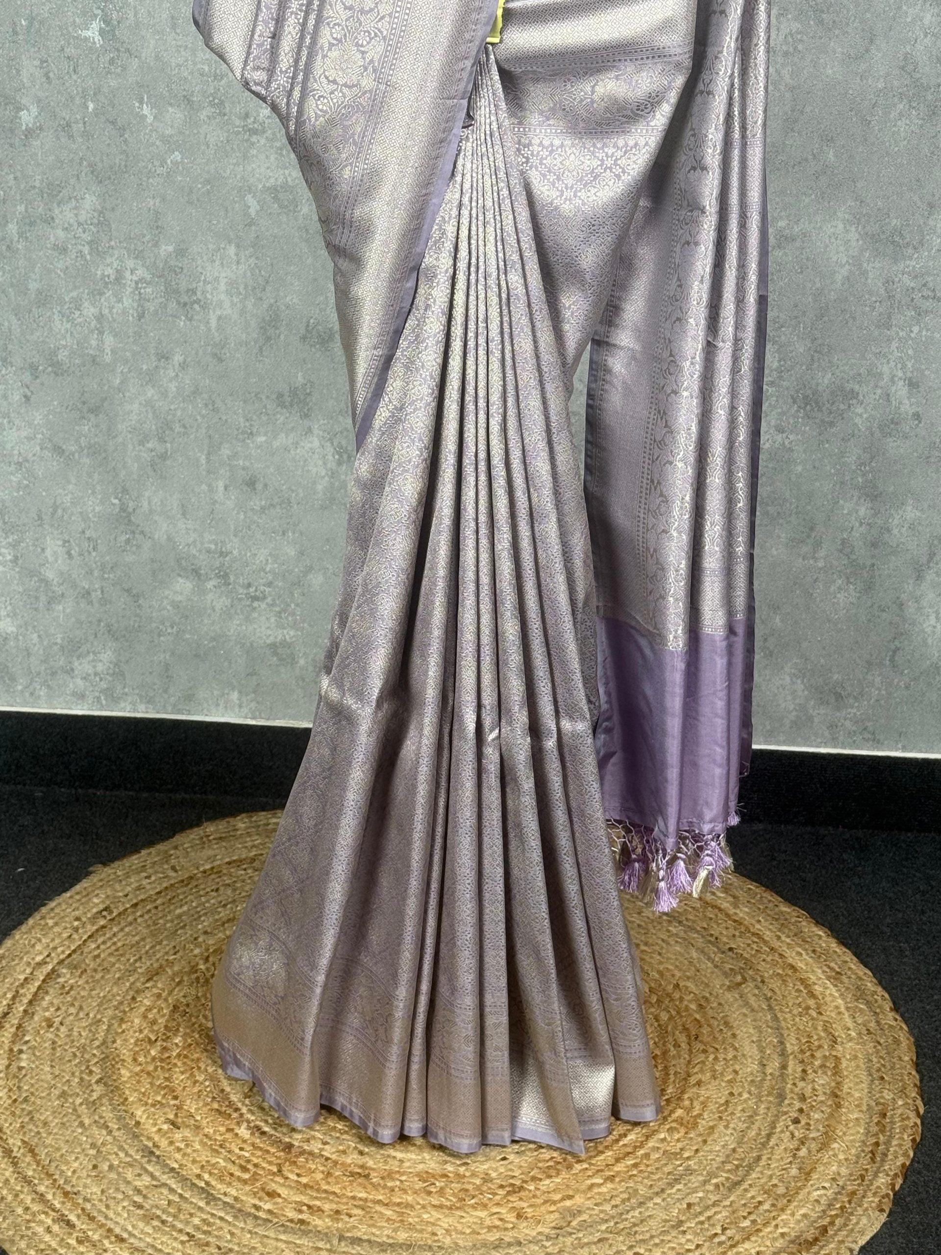This saree showcases a beautiful blend of soft blush and rose-gold tones, creating an elegant and refined look. Its delicate woven motifs enhance its richness while maintaining a subtle, graceful charm. Perfect for special occasions, it embodies timeless sophistication with a modern touch.