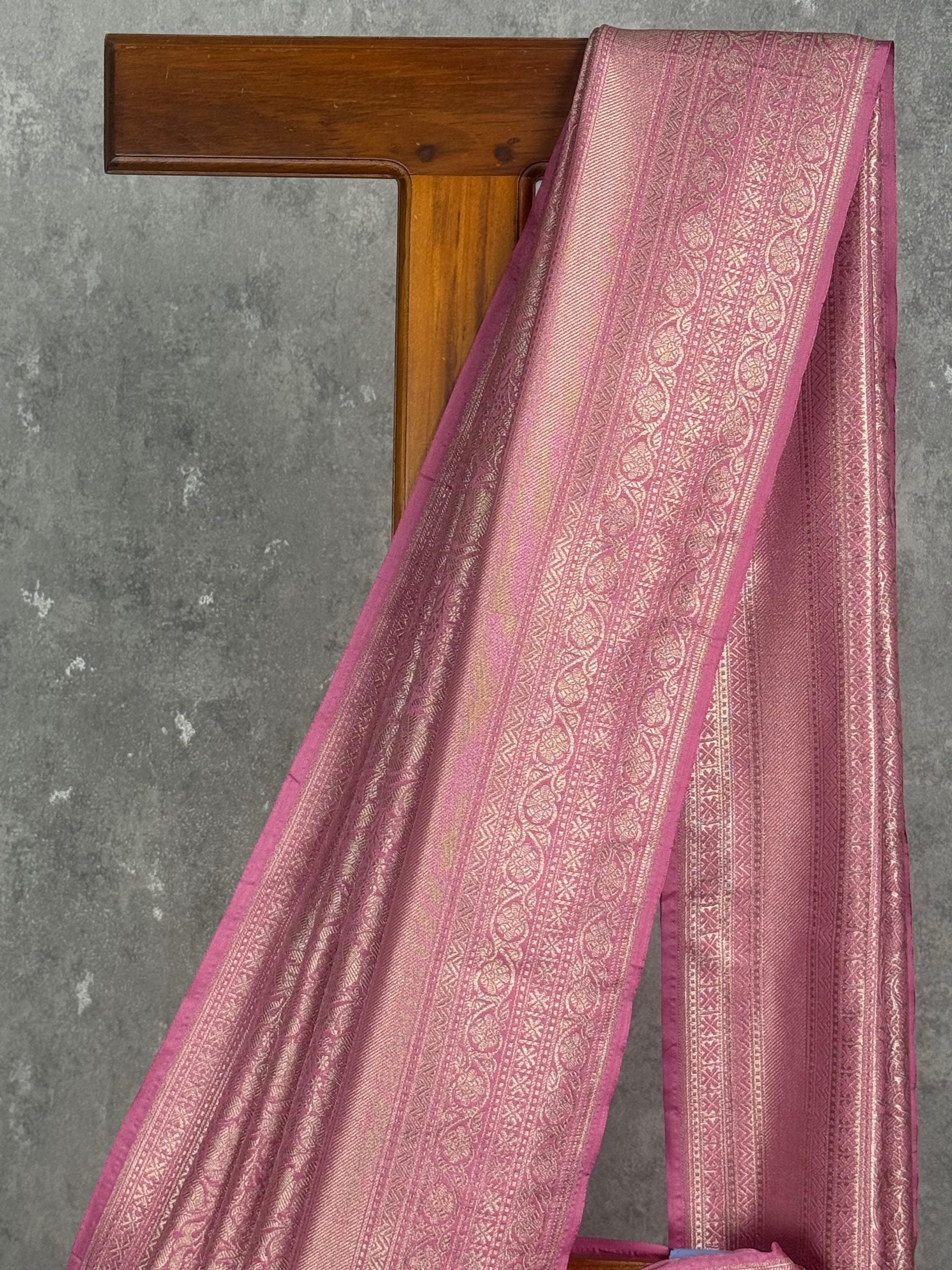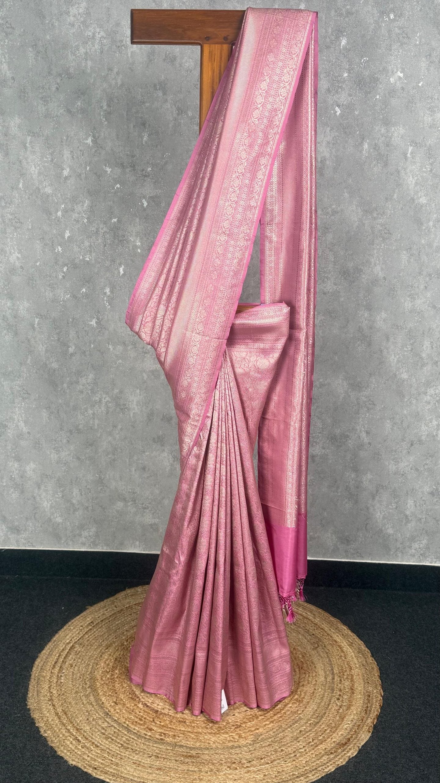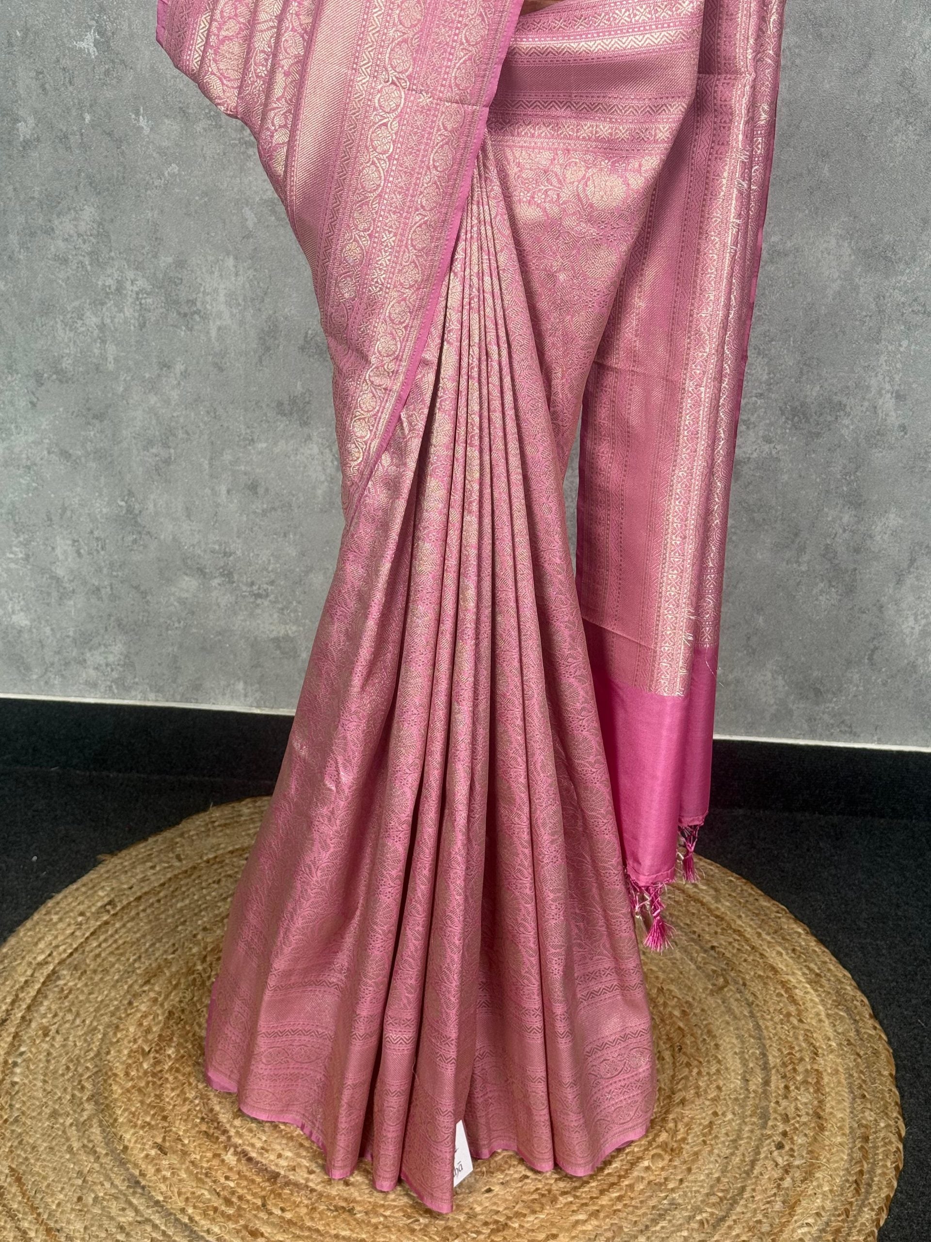 This saree shines in a radiant pink hue with a soft, lustrous finish that beautifully enhances its woven detailing. The intricate patterns add richness and depth, giving it a perfect balance of tradition and elegance. Ideal for festive and celebratory occasions, it creates a graceful and captivating look.