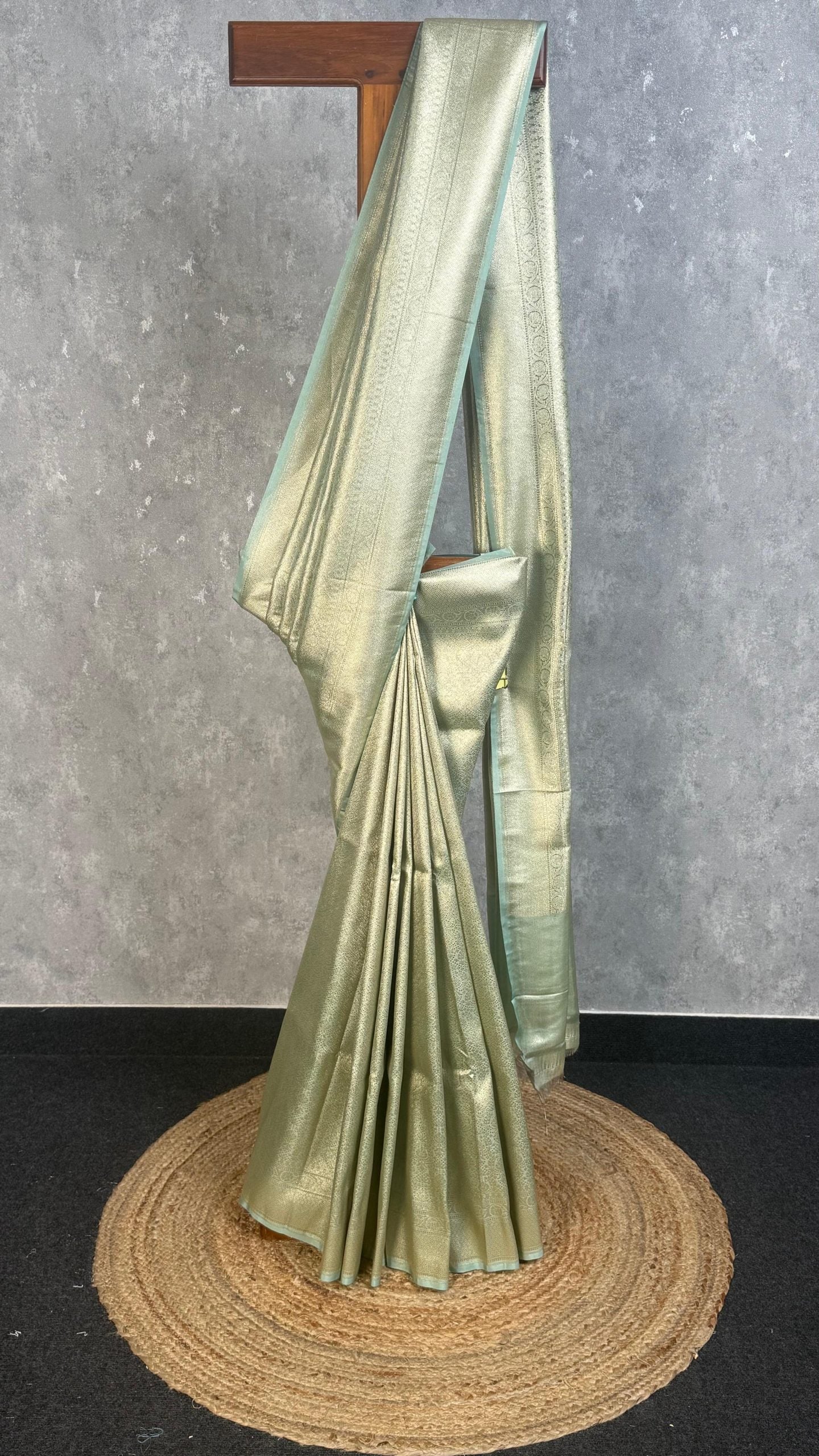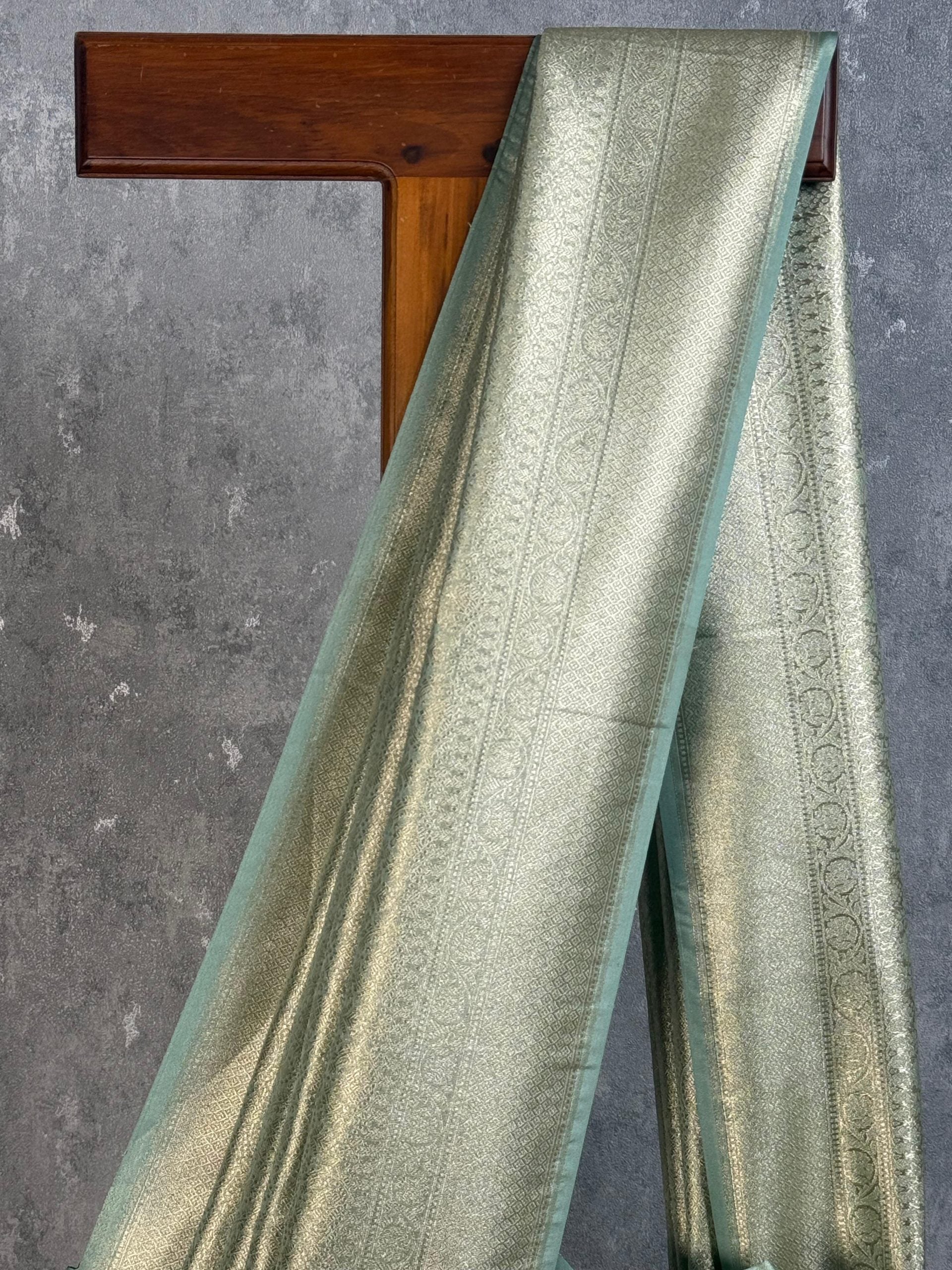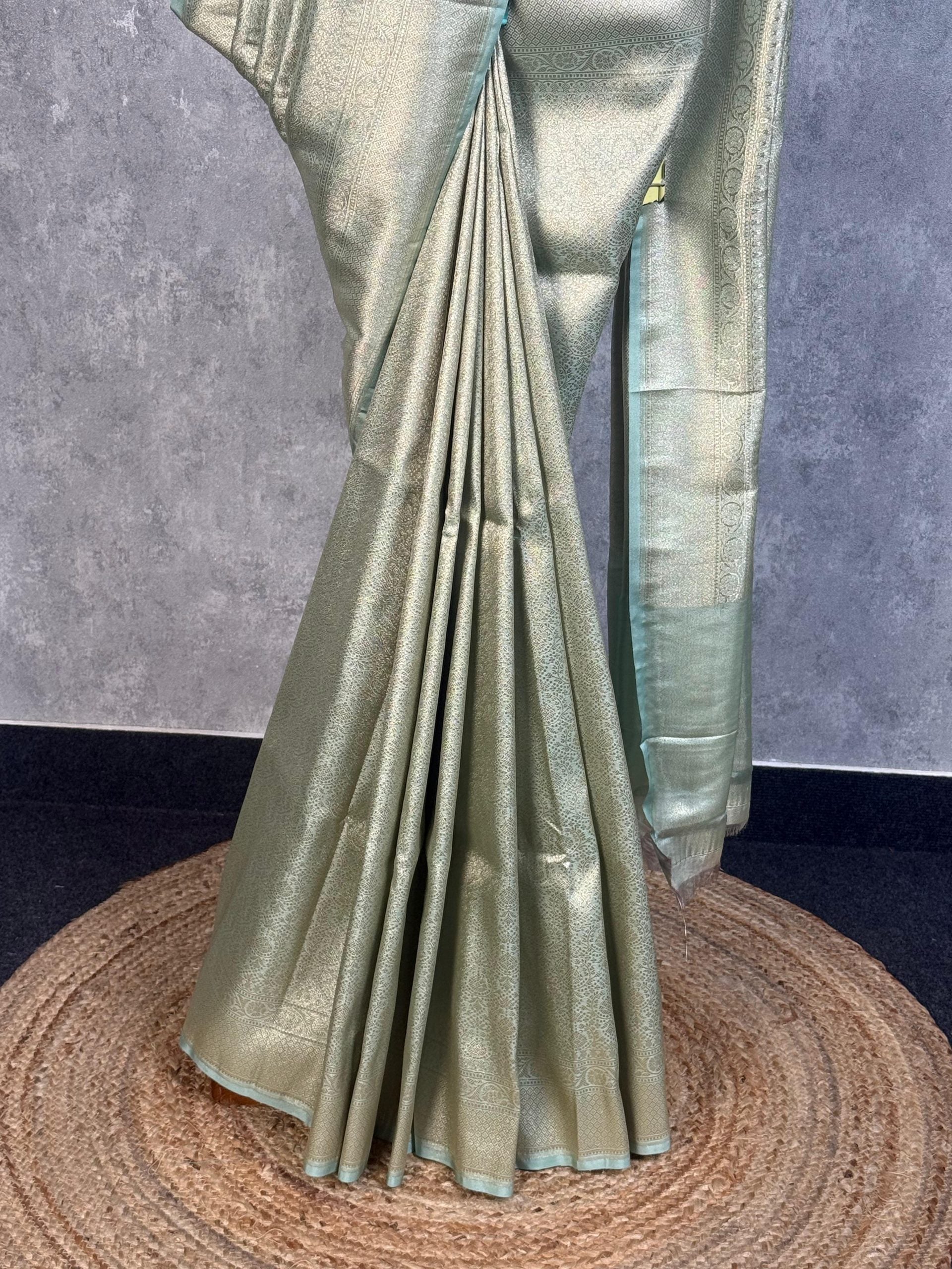 This elegant saree features a soft pastel green shade with a subtle golden sheen, giving it a serene yet luxurious appeal. The intricate woven detailing enhances its richness without overwhelming the design. Perfect for weddings, receptions, and festive occasions, it offers a graceful and timeless look.