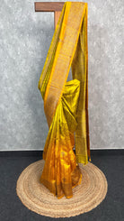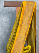 Pure handloom tussar raw silk saree with antique zari weave. This is shaded and dyed in shades of Lime green and mustard yellow. The saree has attached self color blouse piece with zari border on sleeve ends.