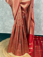 This saree radiates traditional grandeur with its rich red hue paired beautifully with intricate gold zari work. The detailed floral and geometric motifs add depth and luxury, while the bold pallu featuring elegant stripes enhances its regal charm. Perfect for weddings and festive occasions, it captures timeless elegance in every detail.