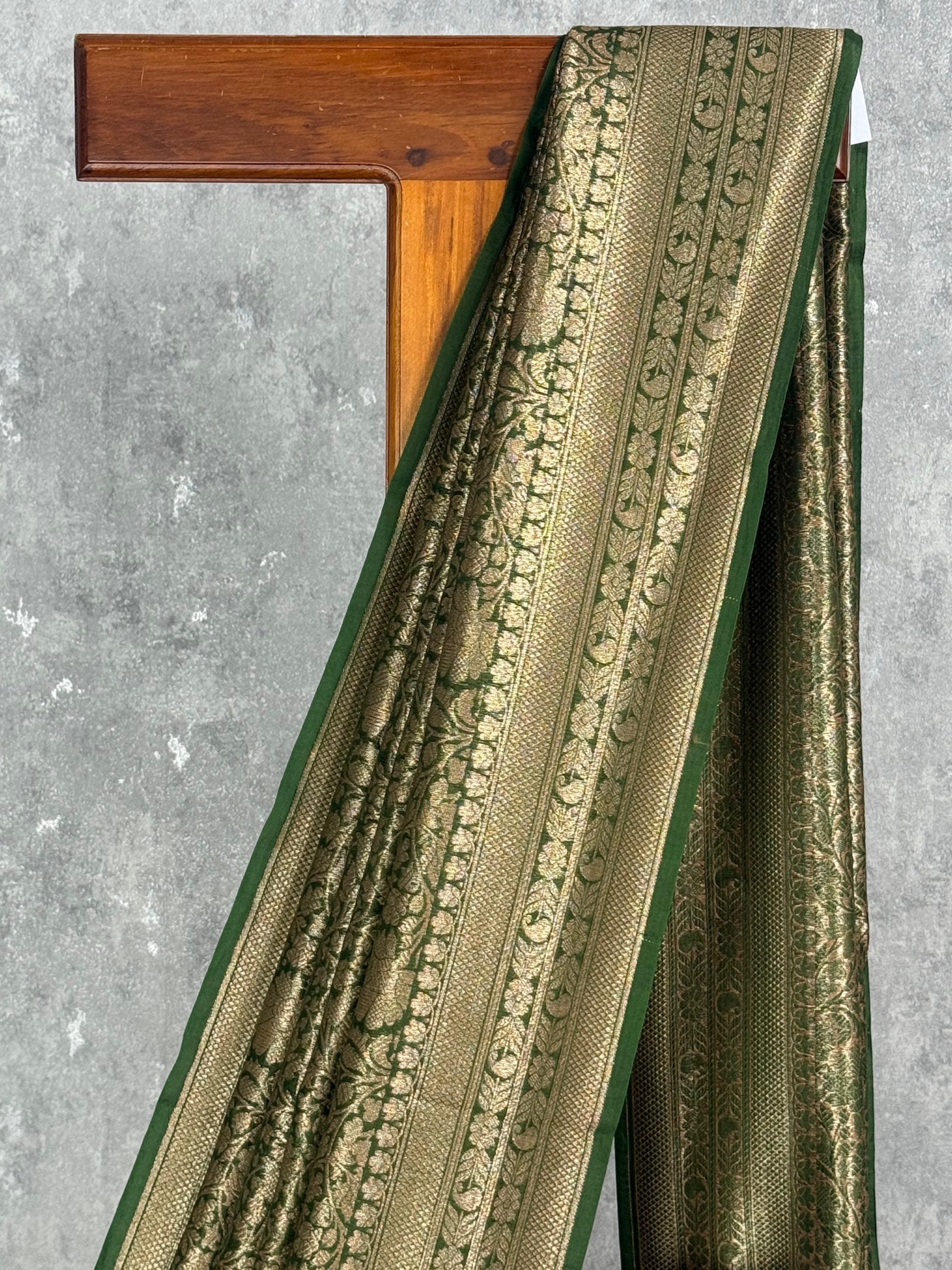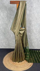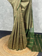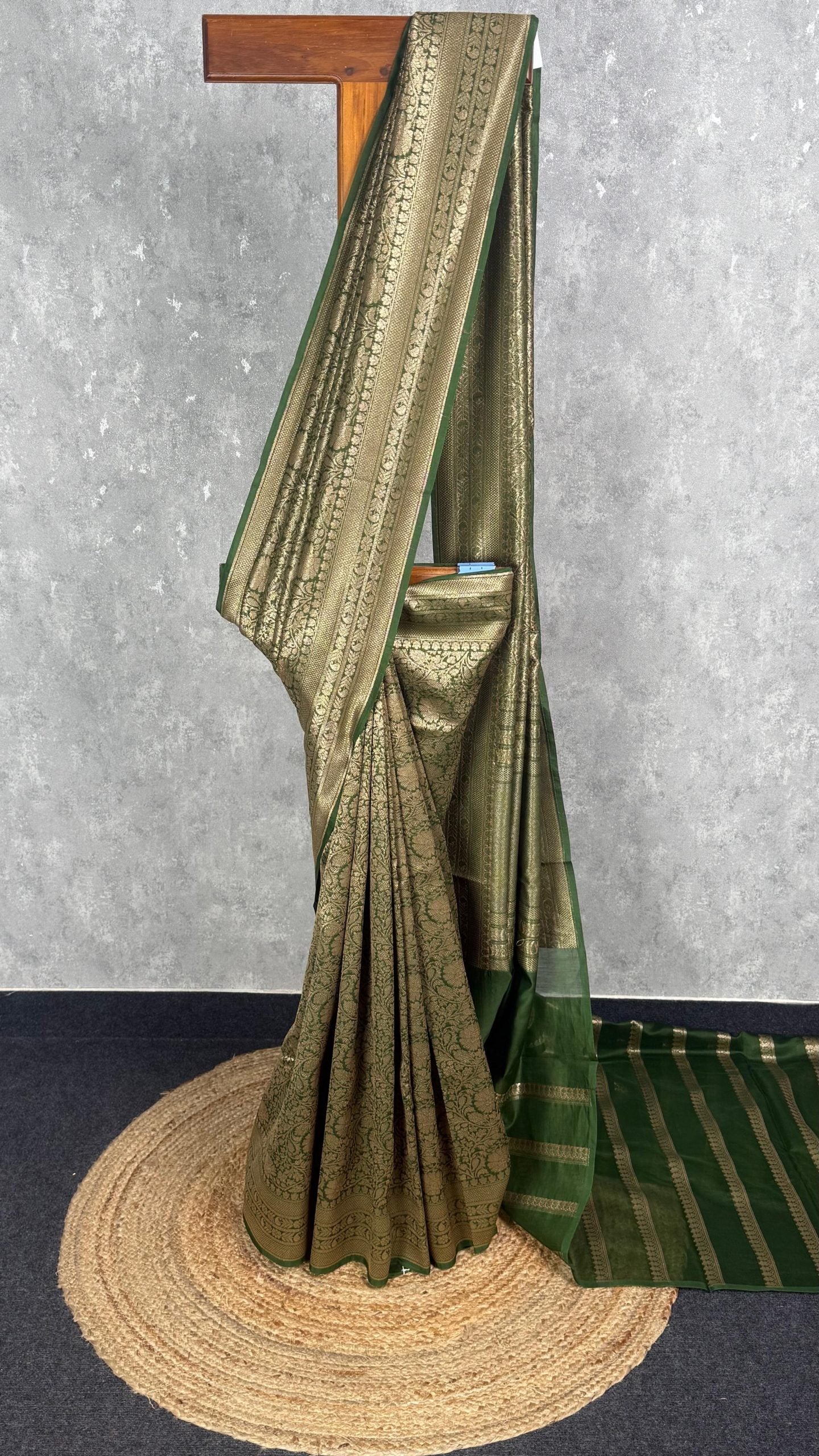 This saree beautifully blends deep forest green with antique gold zari, creating a look of classic richness and sophistication. The intricate floral and geometric motifs add depth, while the ornate borders and striped pallu enhance its regal appeal. Perfect for weddings and festive occasions, it exudes timeless traditional charm.