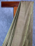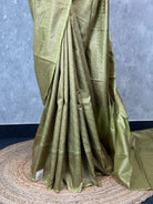 This Elegant Semi Chanderi Banarasi Saree comes in a pistachio green shade, beautifully woven with fine brocade detailing throughout the body. The saree comes with attached self color blouse piece.