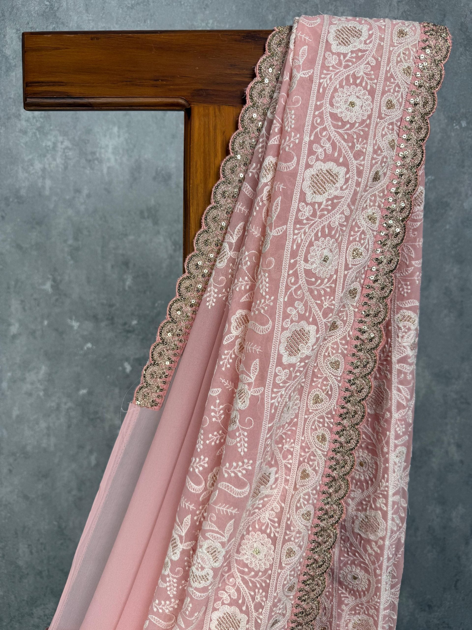 This elegant pink georgette saree features intricate Chikankari hand embroidery throughout. Adorned with delicate floral patterns and sequins, it offers a graceful blend of tradition and charm. The saree has attached self color blouse piece.