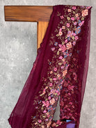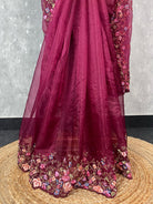 Organza with multicolored thread embroidery and hand detailing along the border. The saree has attached self color blouse piece.