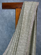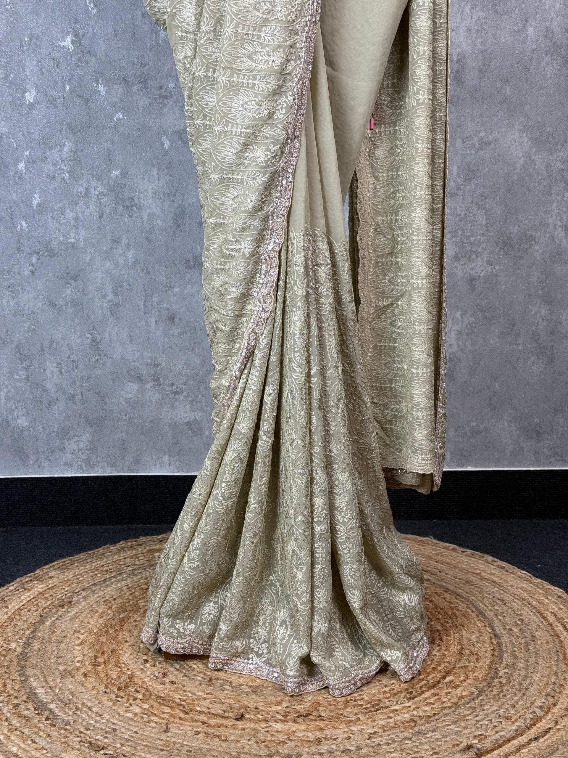 This elegant sage green georgette saree features intricate Chikankari embroidery throughout. Adorned with delicate floral patterns and sequins, it offers a graceful blend of tradition and charm. The saree has attached self color blouse piece.