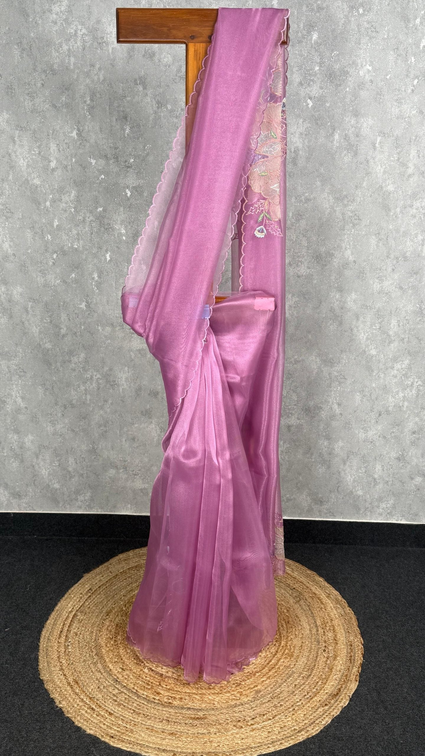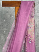 This saree exudes a soft, feminine charm with its delicate mauve-pink hue and sheer, glossy texture. The scalloped edges and subtle floral detailing on the pallu add an elegant touch, making it perfect for graceful, understated occasions. Its lightweight drape enhances both sophistication and comfort.