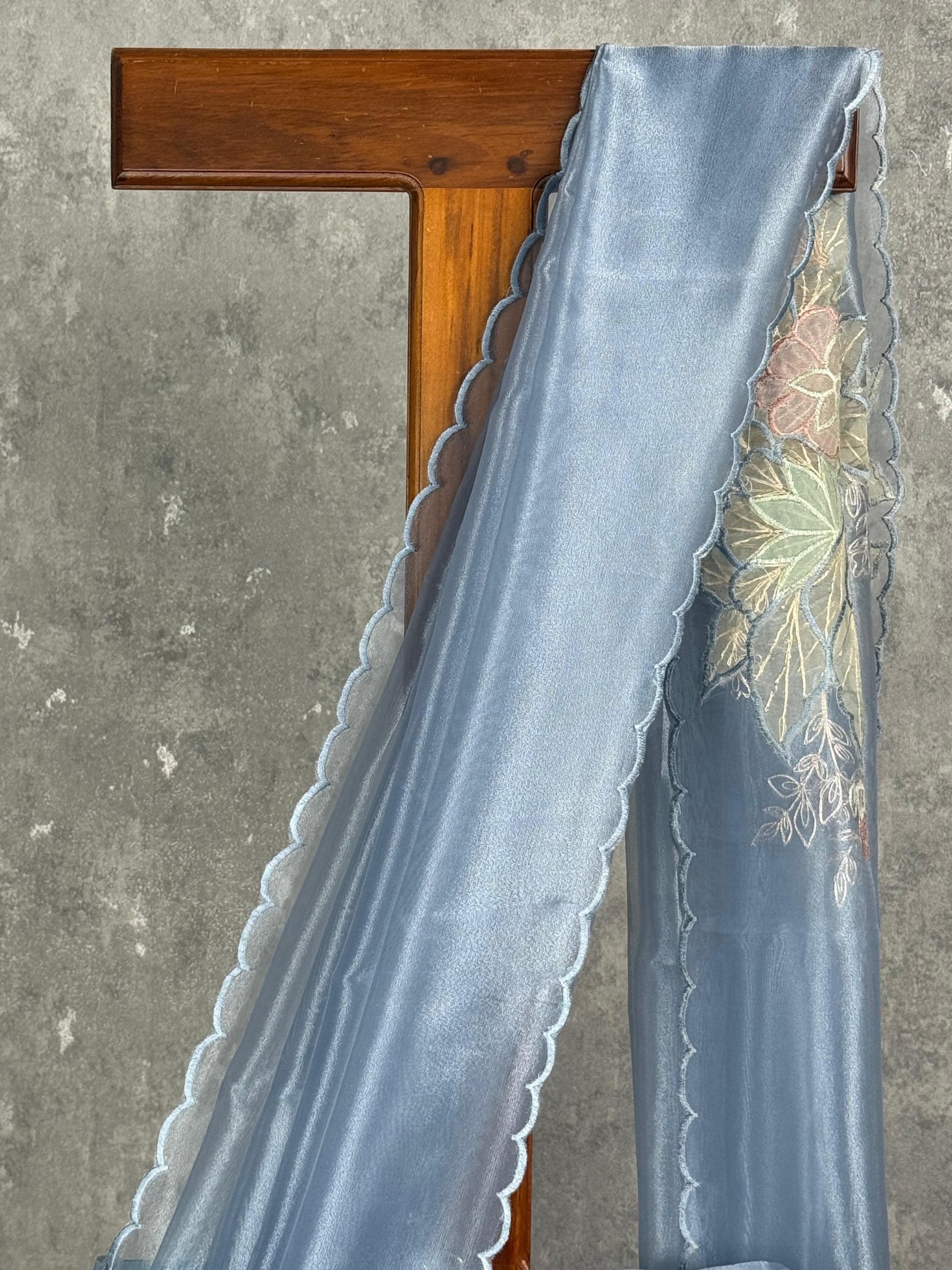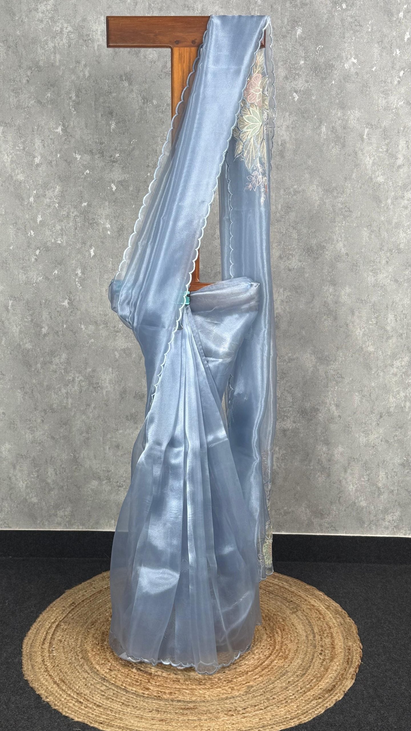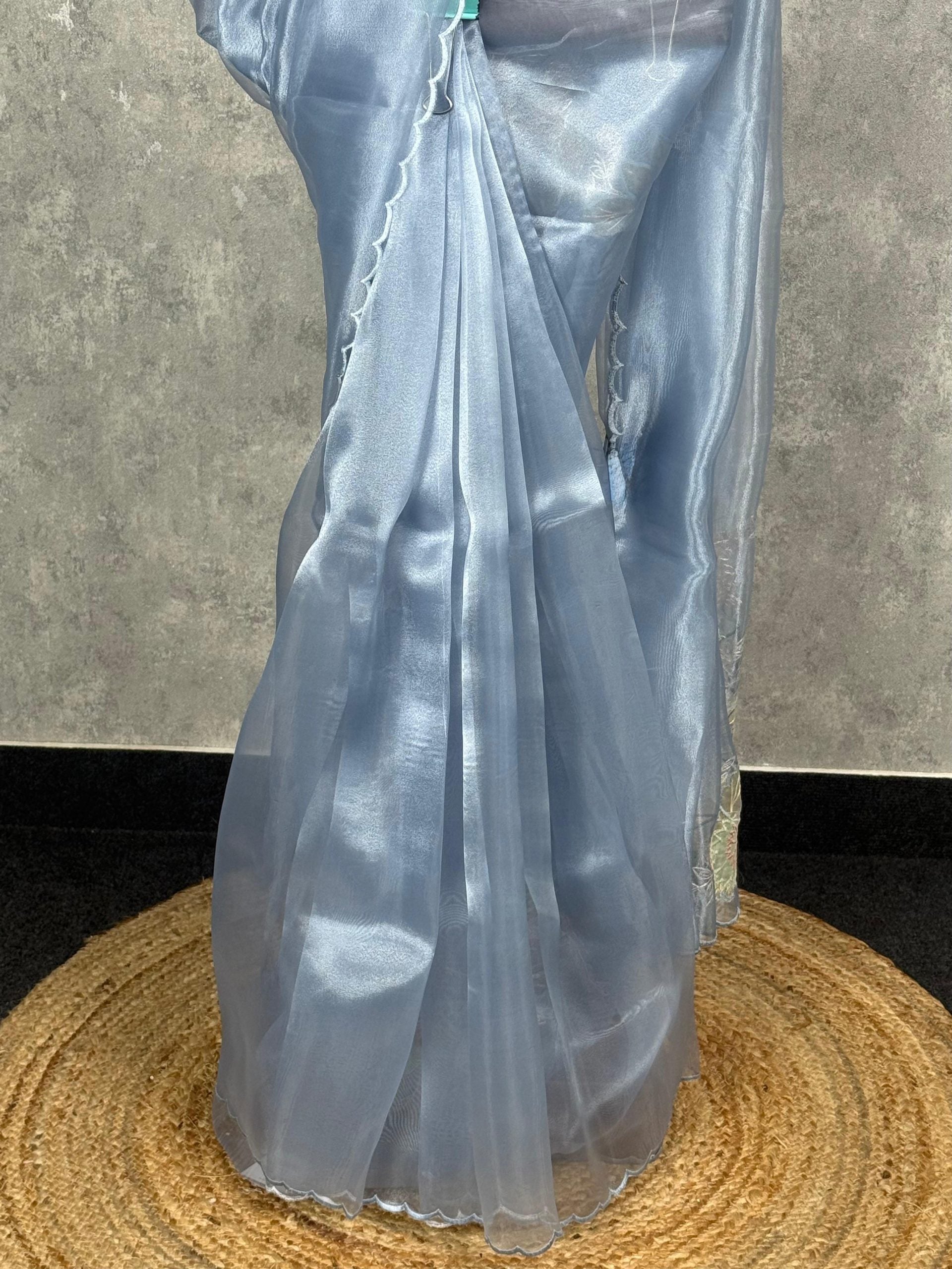 This saree showcases a serene ice-blue hue with a soft, glossy finish that adds an effortless touch of elegance. The scalloped edges and delicate floral embroidery on the pallu enhance its graceful, feminine appeal. Perfect for subtle yet sophisticated occasions, it drapes beautifully with a lightweight charm.