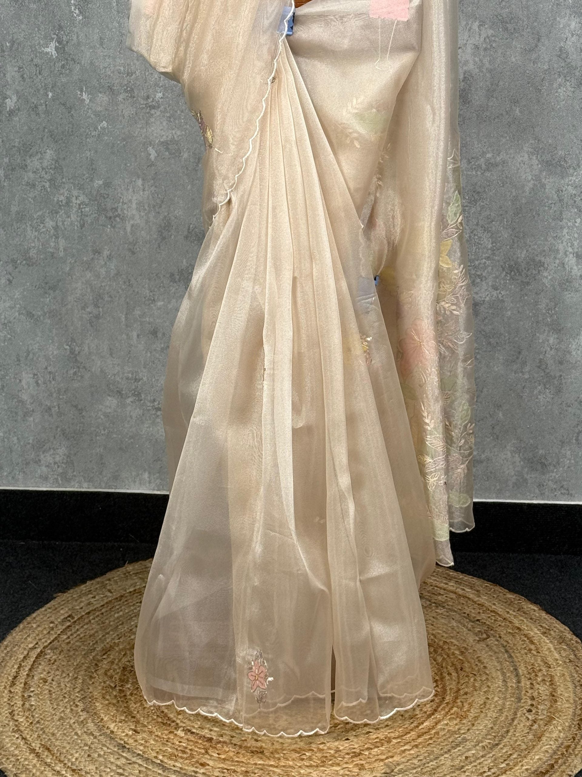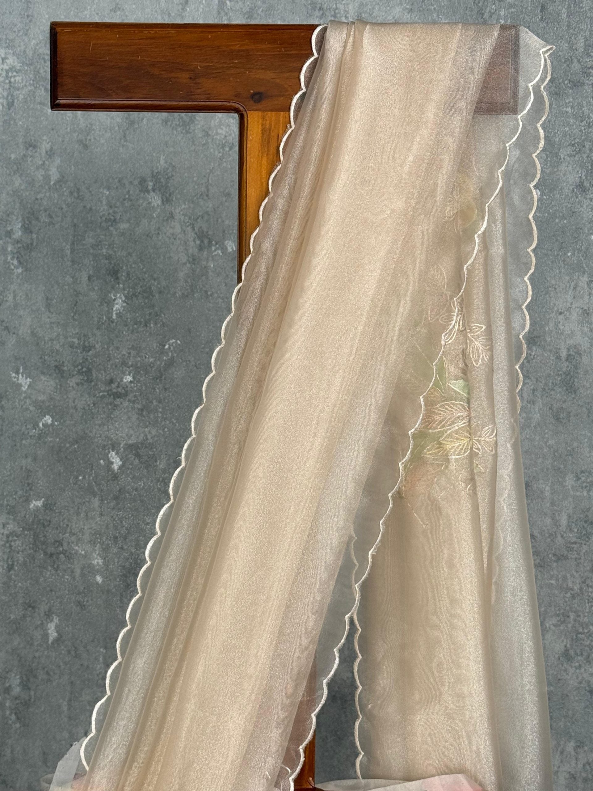 This saree showcases a soft beige-gold tone with a sheer, luminous finish that gives it a delicate and elegant appeal. The scalloped borders add a refined touch, while the subtle floral detailing enhances its graceful charm. Perfect for light festive occasions and daytime celebrations, it offers a beautifully understated, sophisticated look.