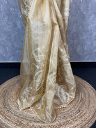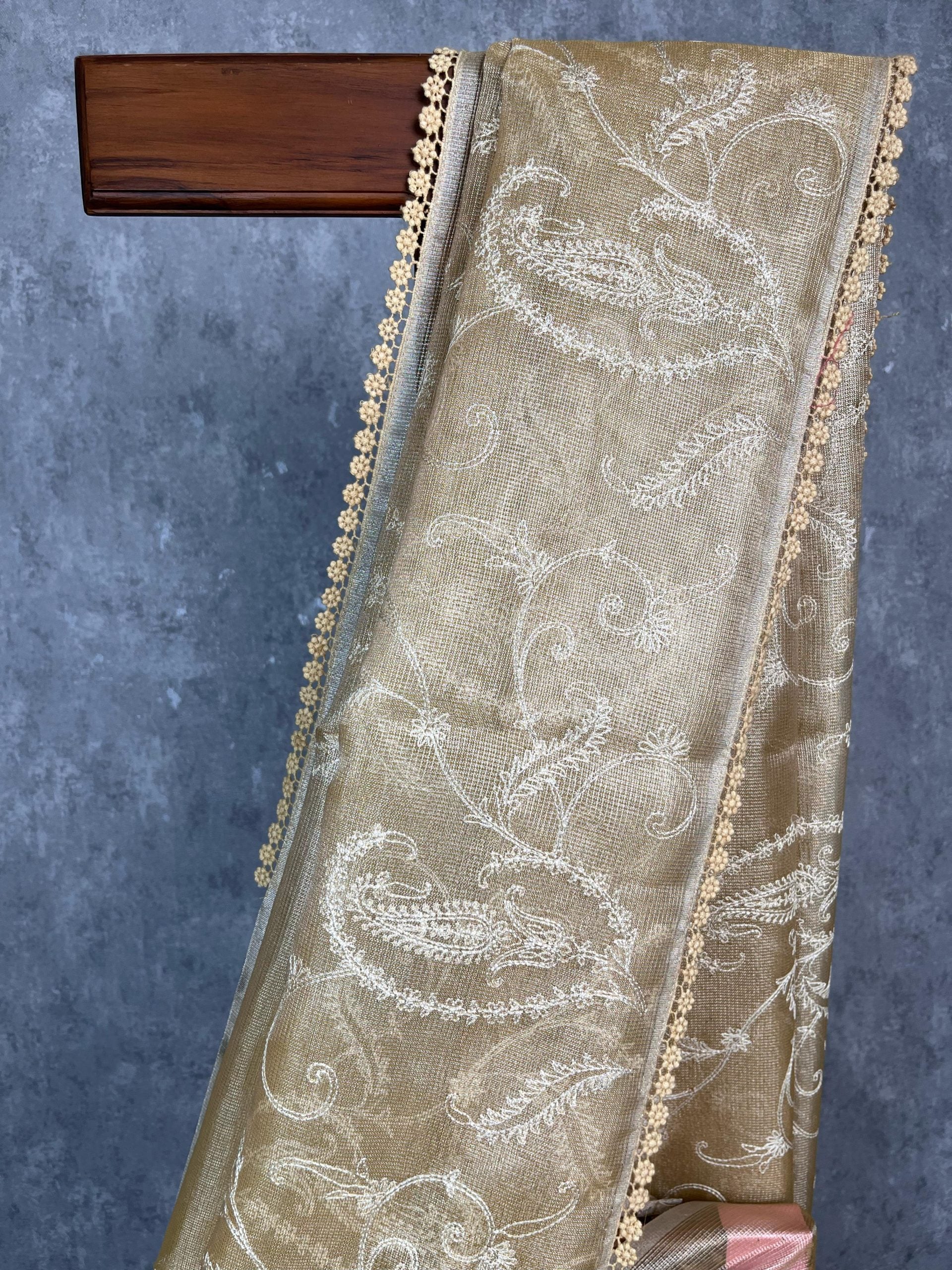 Tissue kota saree with beautiful thread embroidery all over the body. The saree has attached tissue kota fabric with embroidery along the sleeve edges.