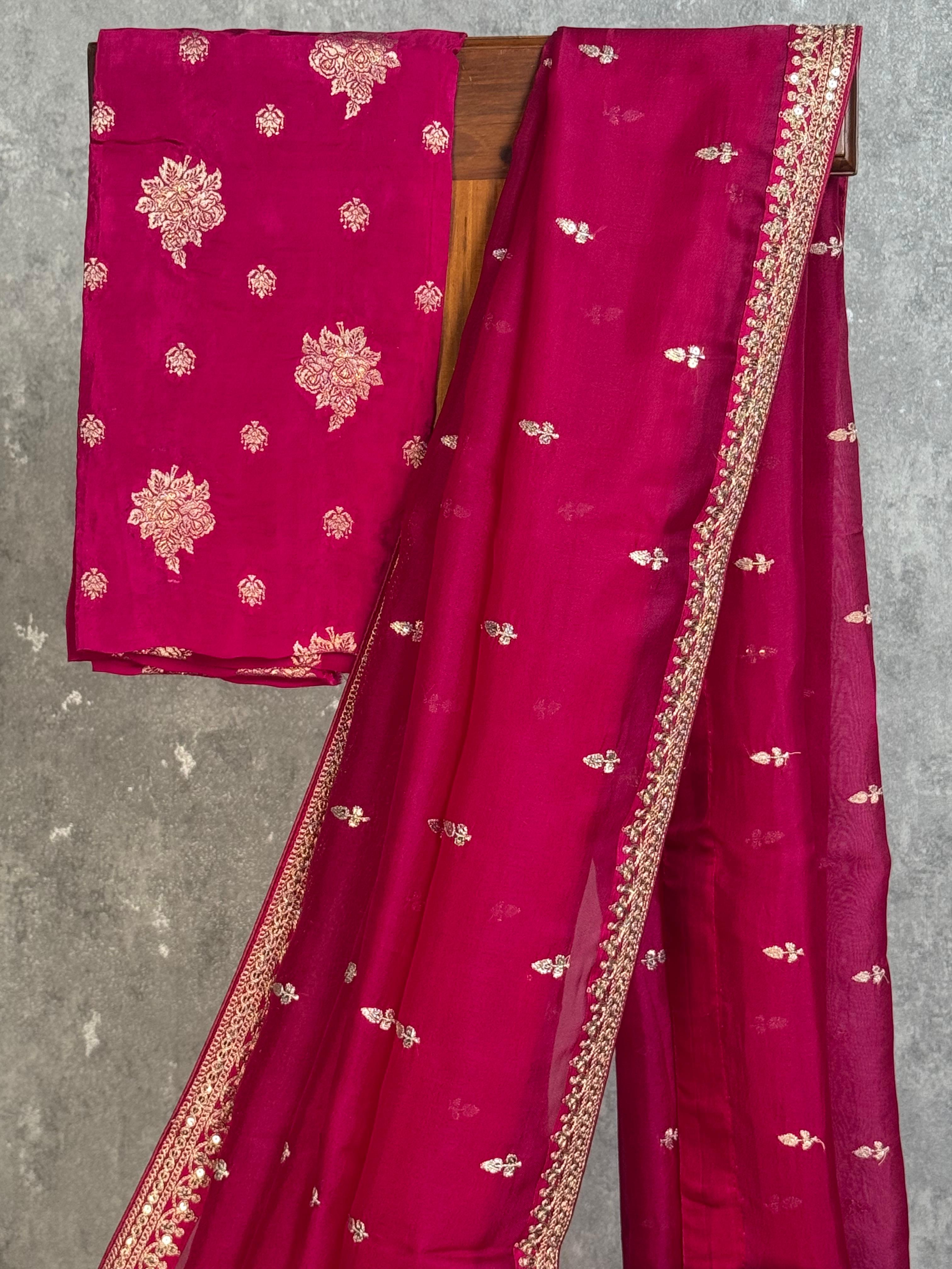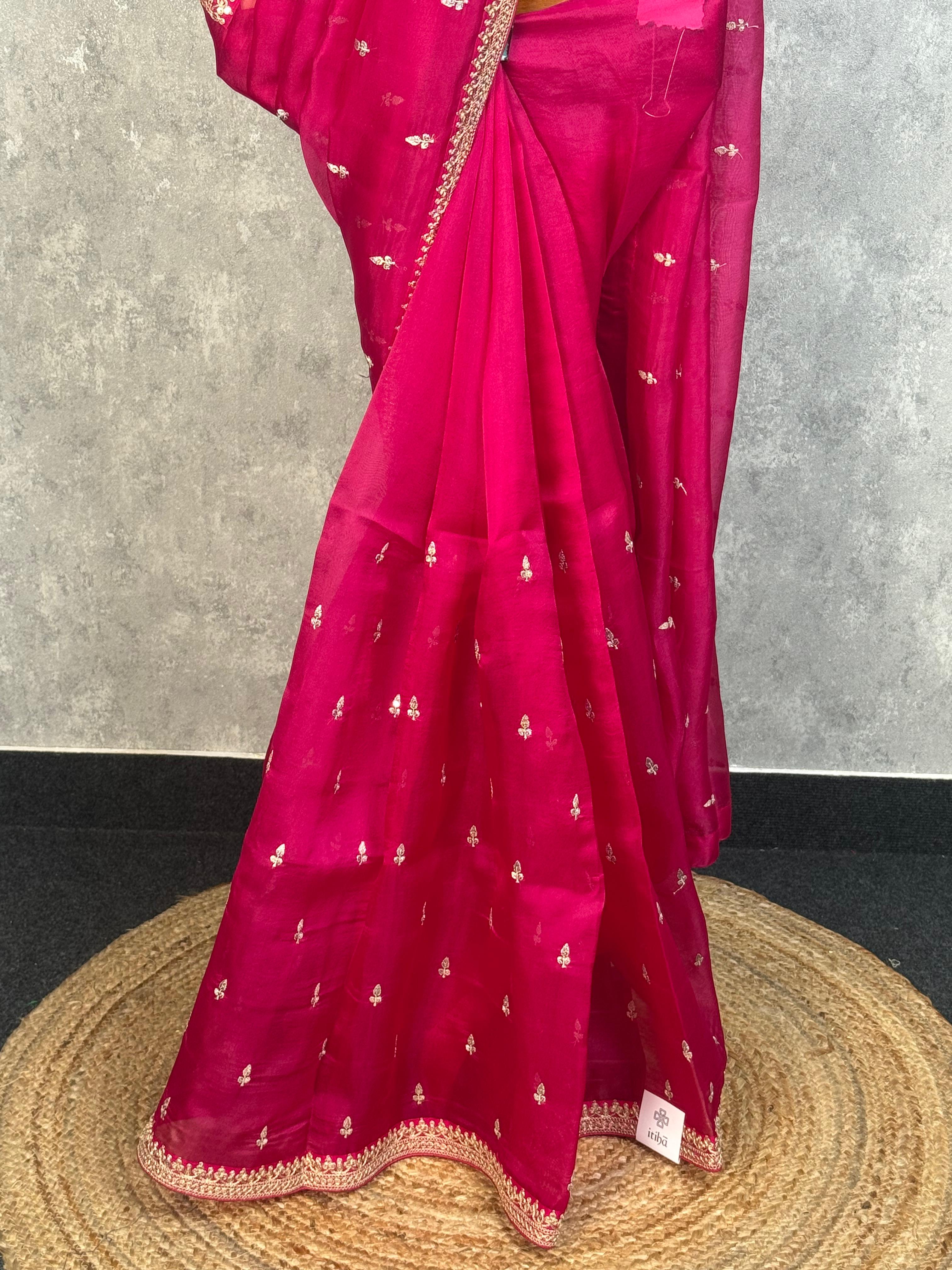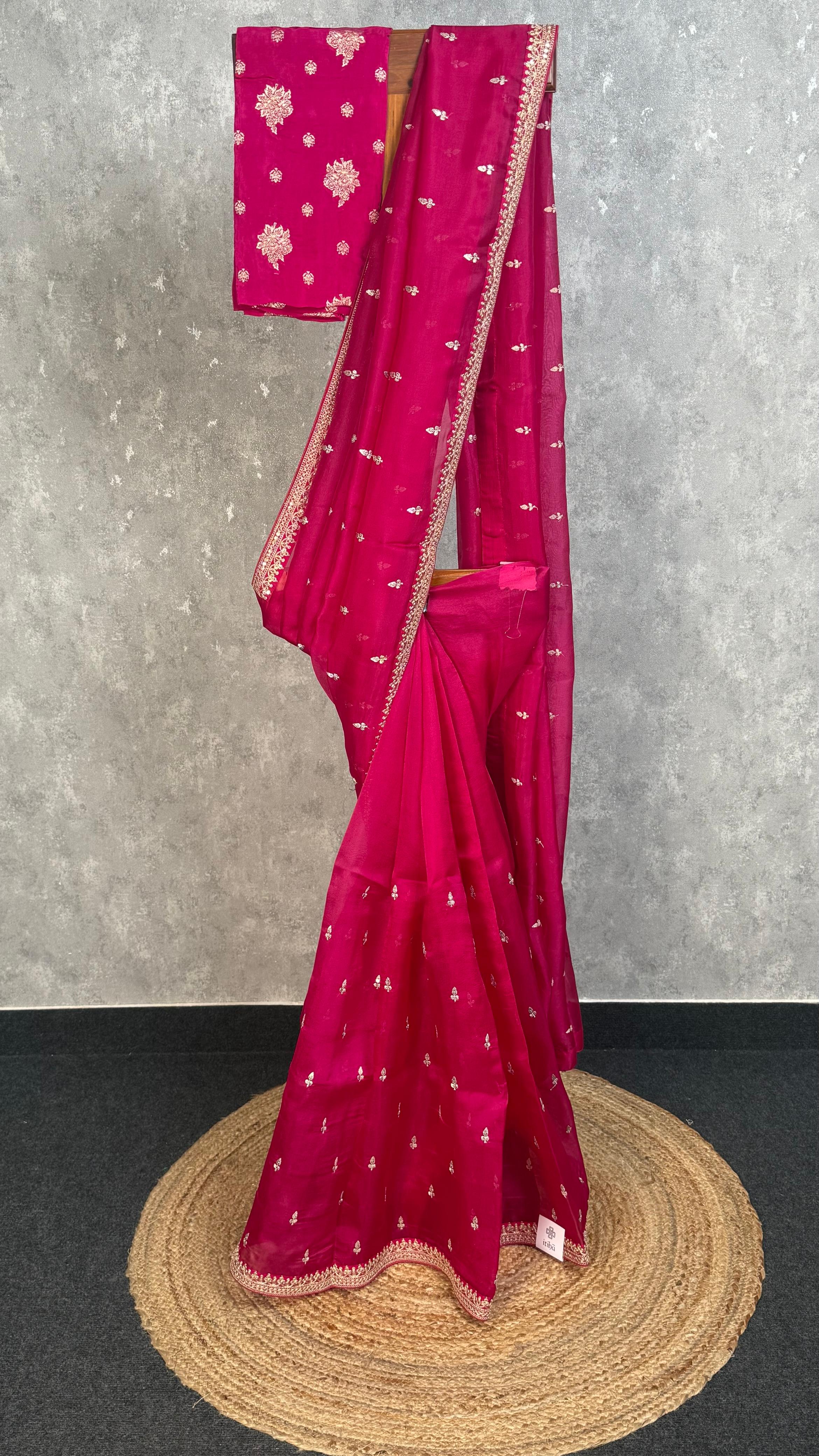 Discover refined elegance in this silk organza embroidery saree, where premium fabric meets masterful needlework. The delicate organza weave creates a luminous drape while intricate embroidery details add sophisticated dimension to every wear. Crafted for those who appreciate authentic artisanal quality and timeless design, this saree seamlessly transitions from celebrations to formal gatherings.