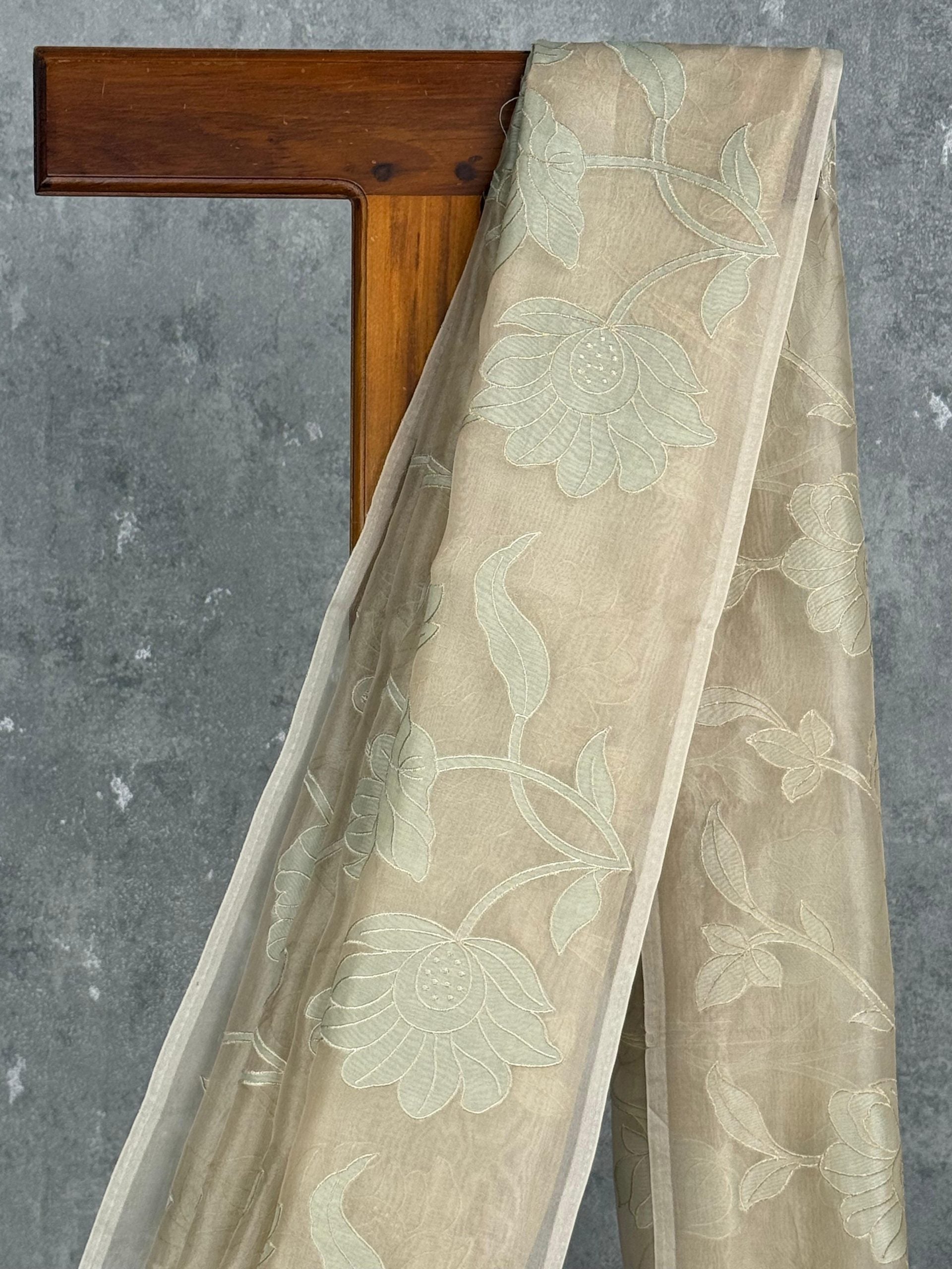 This saree features a soothing blend of mint green and beige, giving it a soft and elegant appeal. The sheer pallu is adorned with delicate floral embroidery that enhances its graceful and refined look. Perfect for daytime events and subtle celebrations, it offers timeless charm with a contemporary touch.