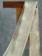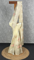 This elegant saree in a soft cream shade exudes timeless sophistication. Adorned with delicate floral embroidery in pastel tones and intricate golden detailing, it beautifully combines grace with subtle glamour. Perfect for festive celebrations or special occasions, it adds a refined charm to any ensemble.