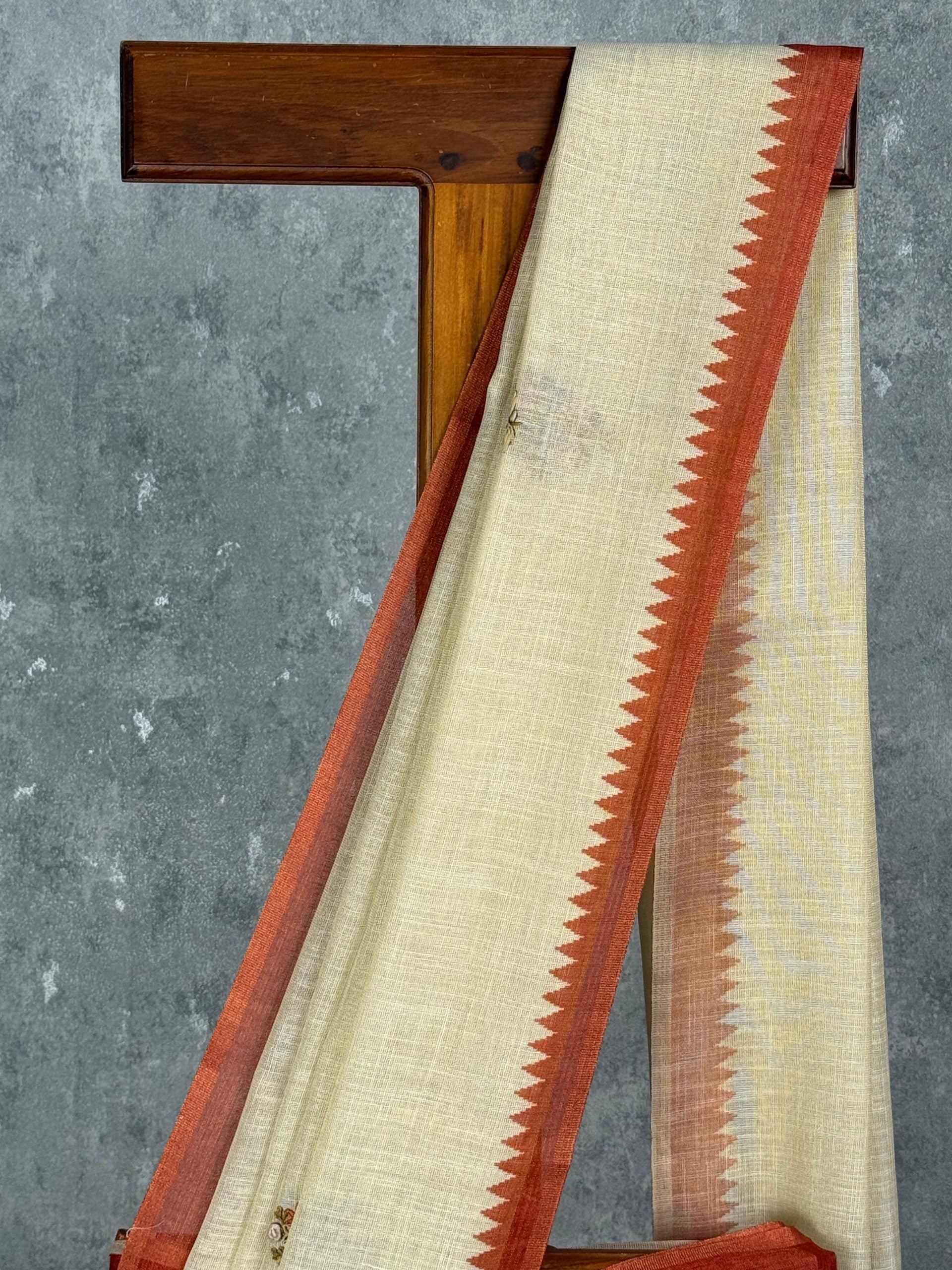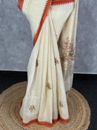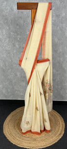 This elegant cream saree features a striking rust-orange border that adds warmth and vibrancy to its subtle tone. Adorned with delicate floral embroidery, it beautifully balances tradition and grace, making it perfect for festive or cultural occasions.