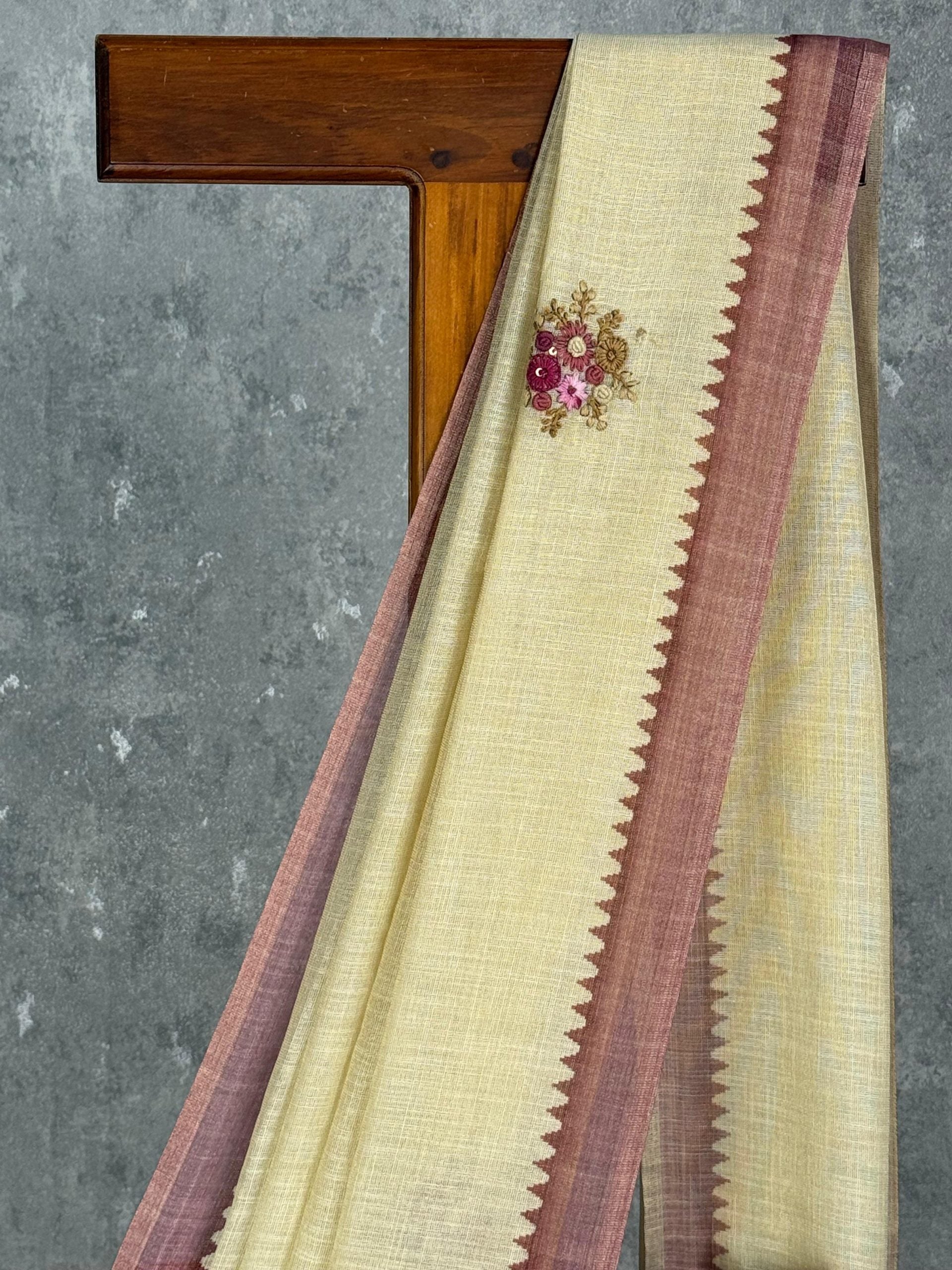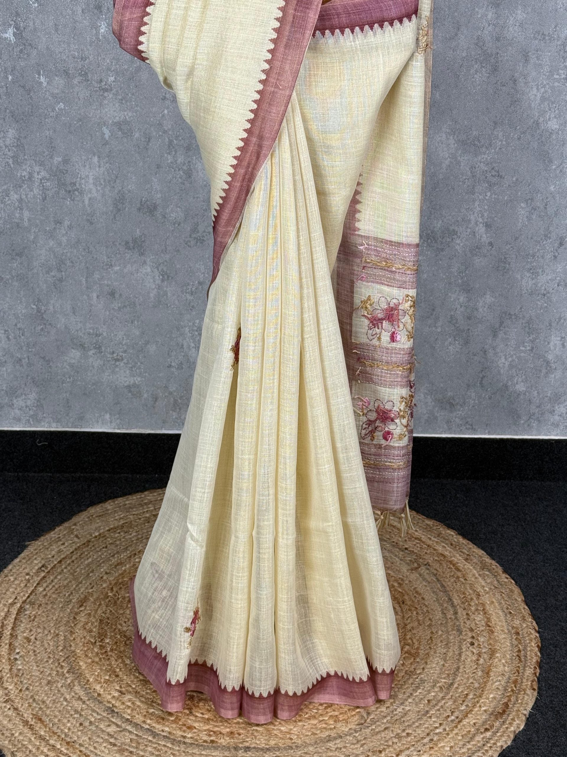 This graceful cream saree features a soft mauve border that adds a touch of refined elegance. Adorned with delicate floral embroidery, it beautifully blends subtle charm with timeless sophistication, perfect for festive and traditional occasions.