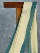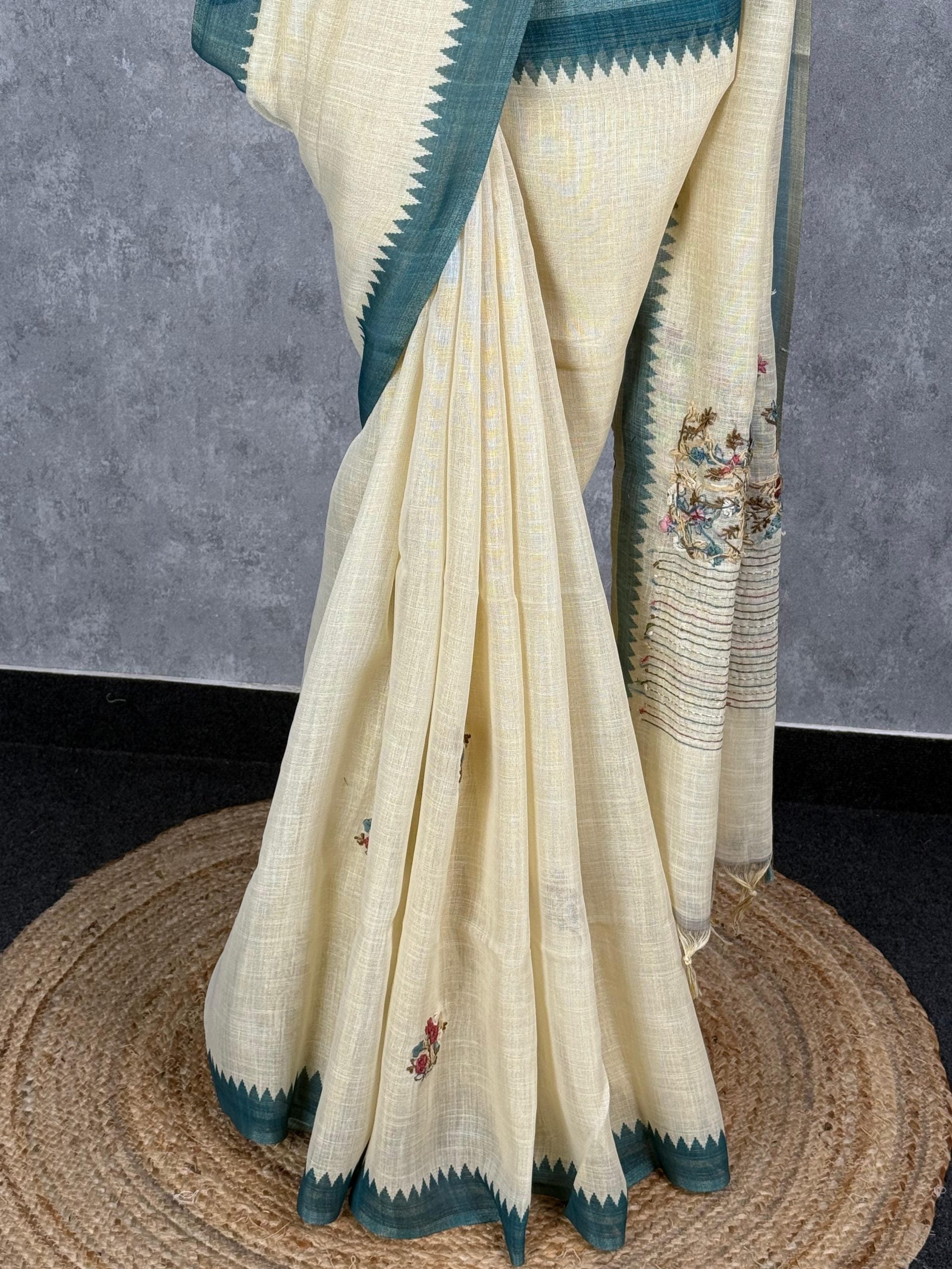 This elegant saree features a soft cream base adorned with a striking teal border that adds a refined contrast. The minimal floral embroidery enhances its understated charm, making it perfect for both casual and semi-formal occasions. Its lightweight texture exudes comfort and timeless sophistication.