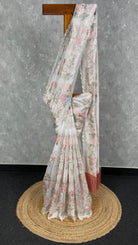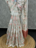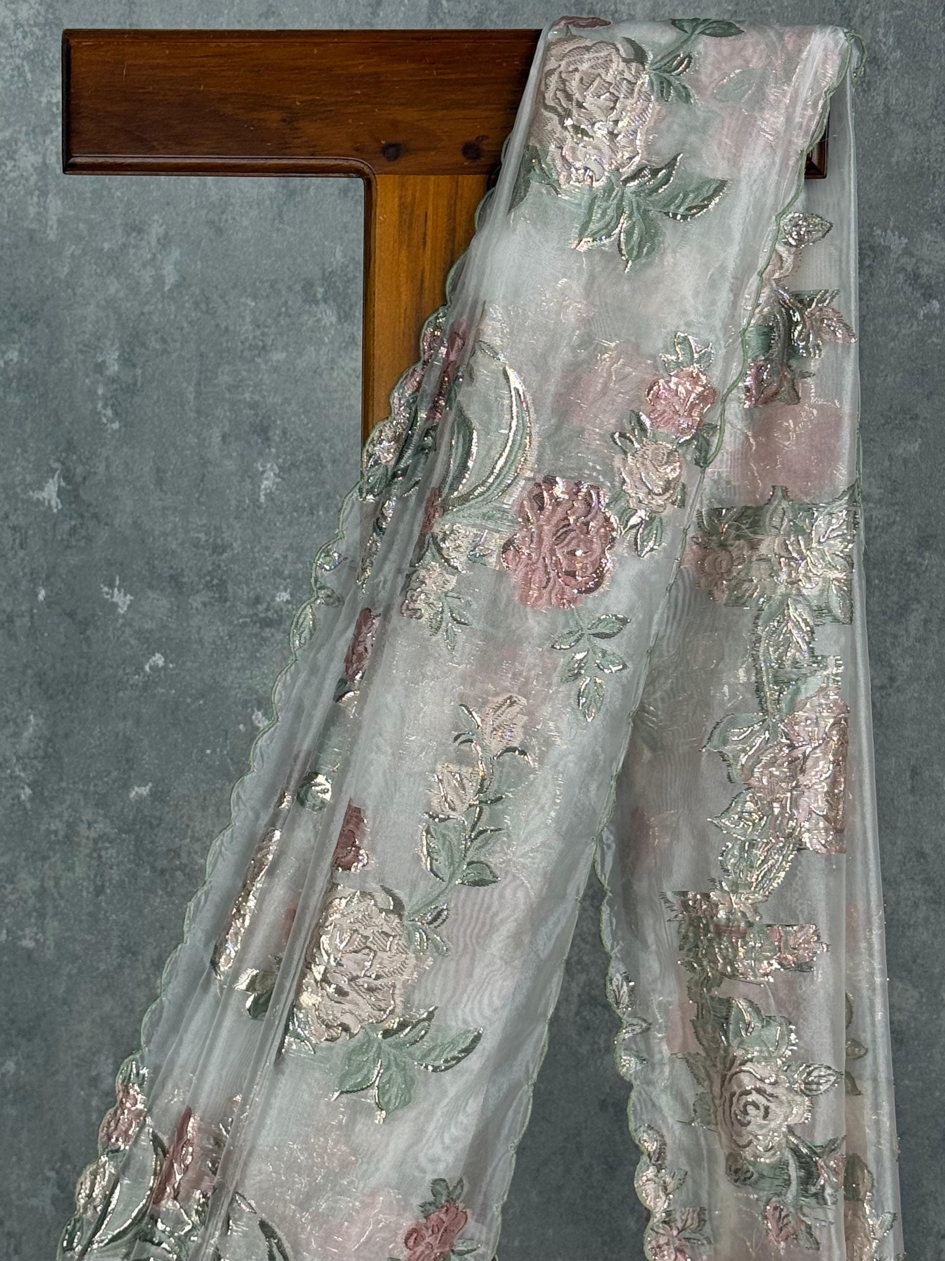 This saree showcases an elegant blend of pastel hues and delicate floral embroidery, creating a graceful and timeless look. The subtle shimmer and fine detailing add a touch of sophistication, making it perfect for festive and special occasions.