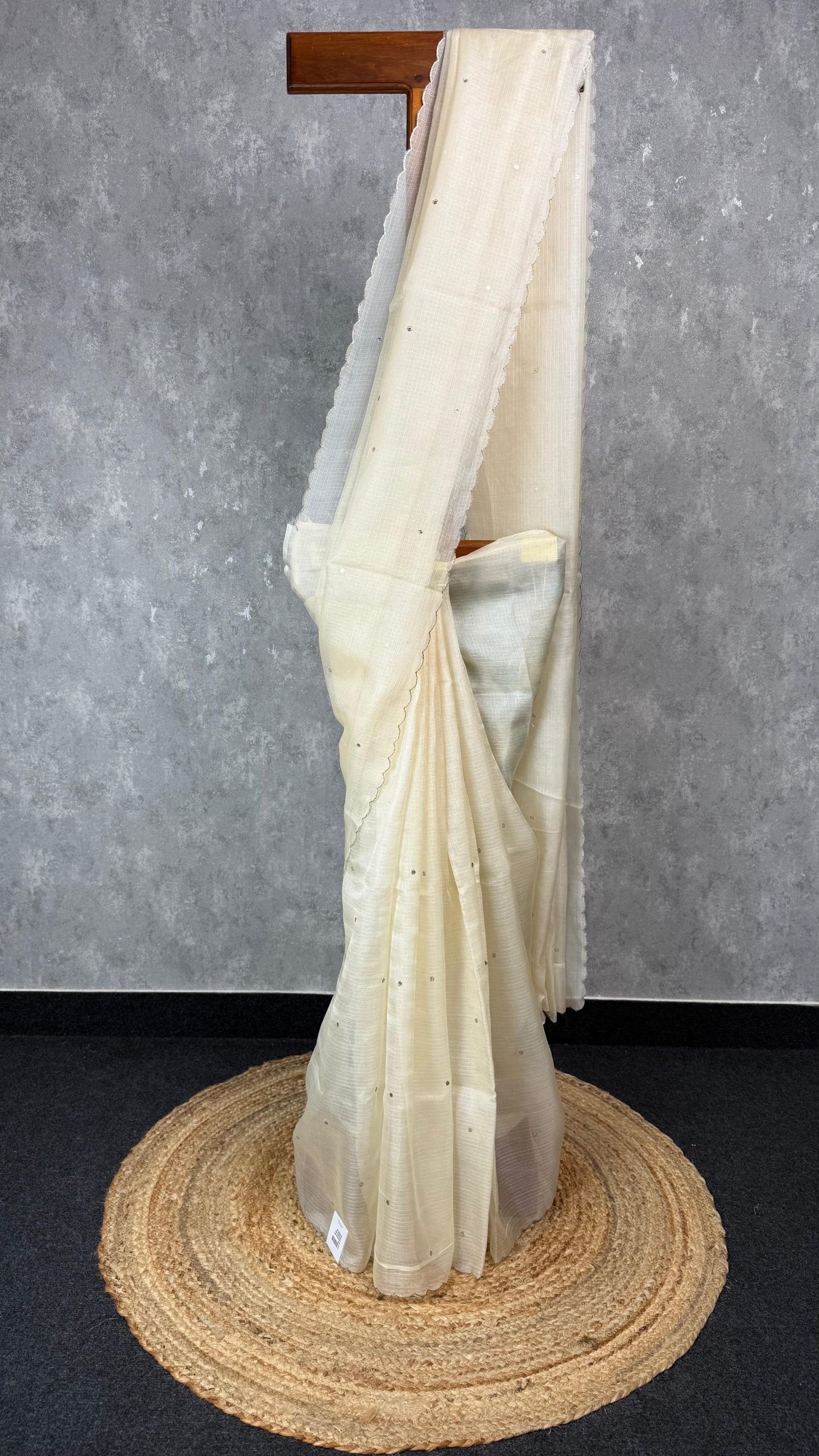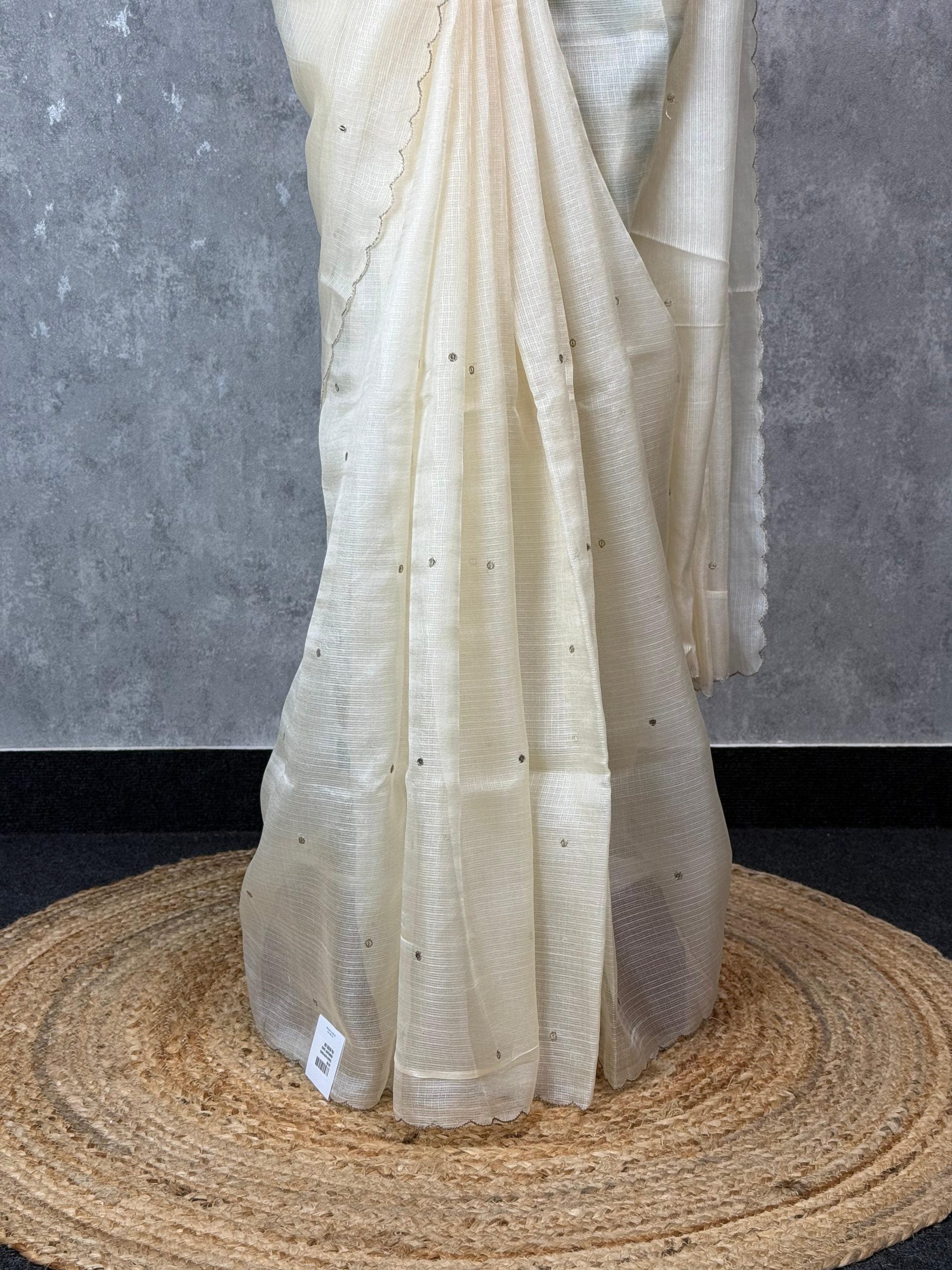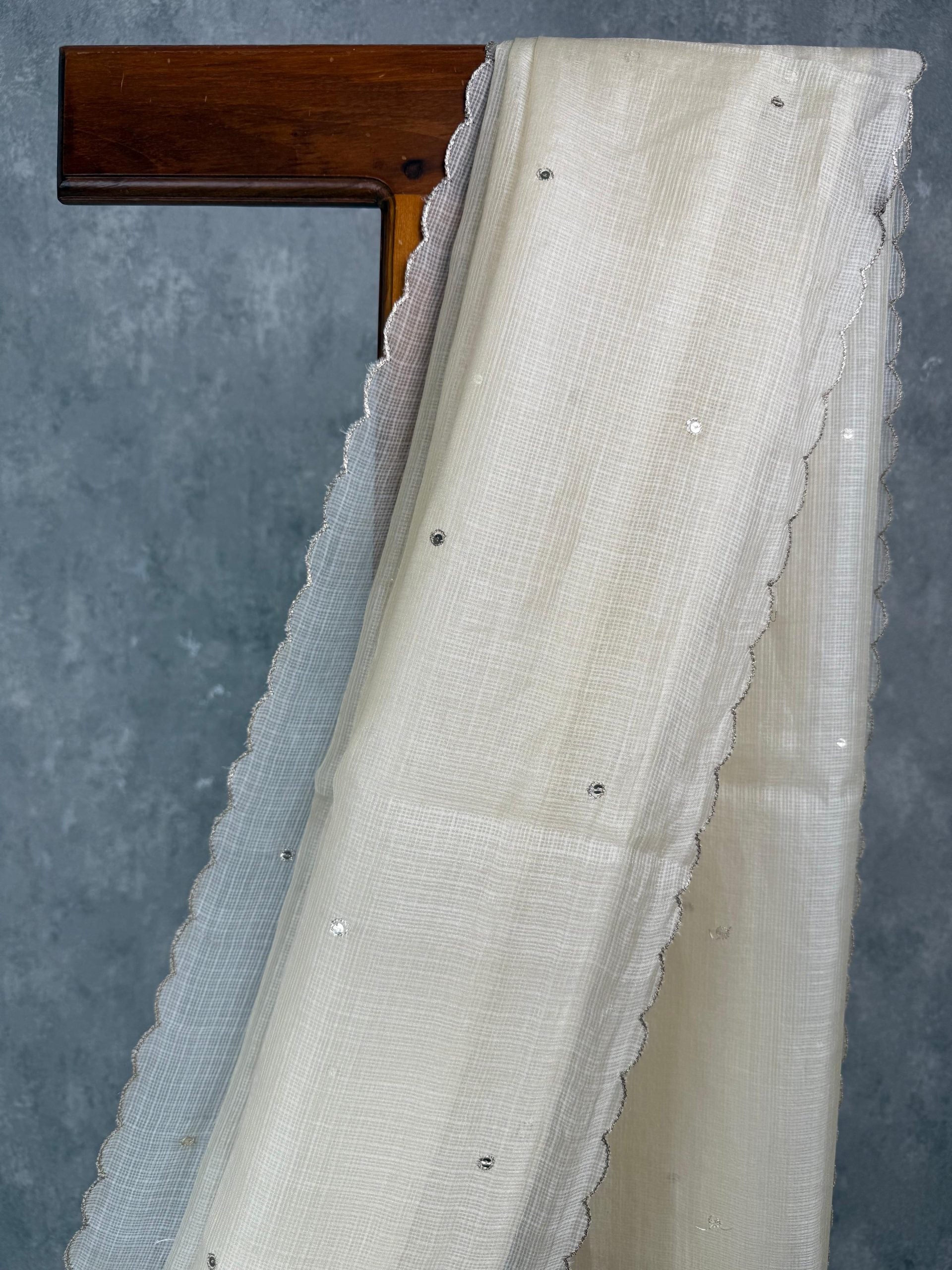 This elegant saree is crafted from lightweight Tussar Kota fabric in an off-white shade. It features subtle embroidery accents with a delicate scalloped border. Paired with a floral handprinted blouse piece.