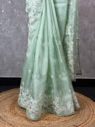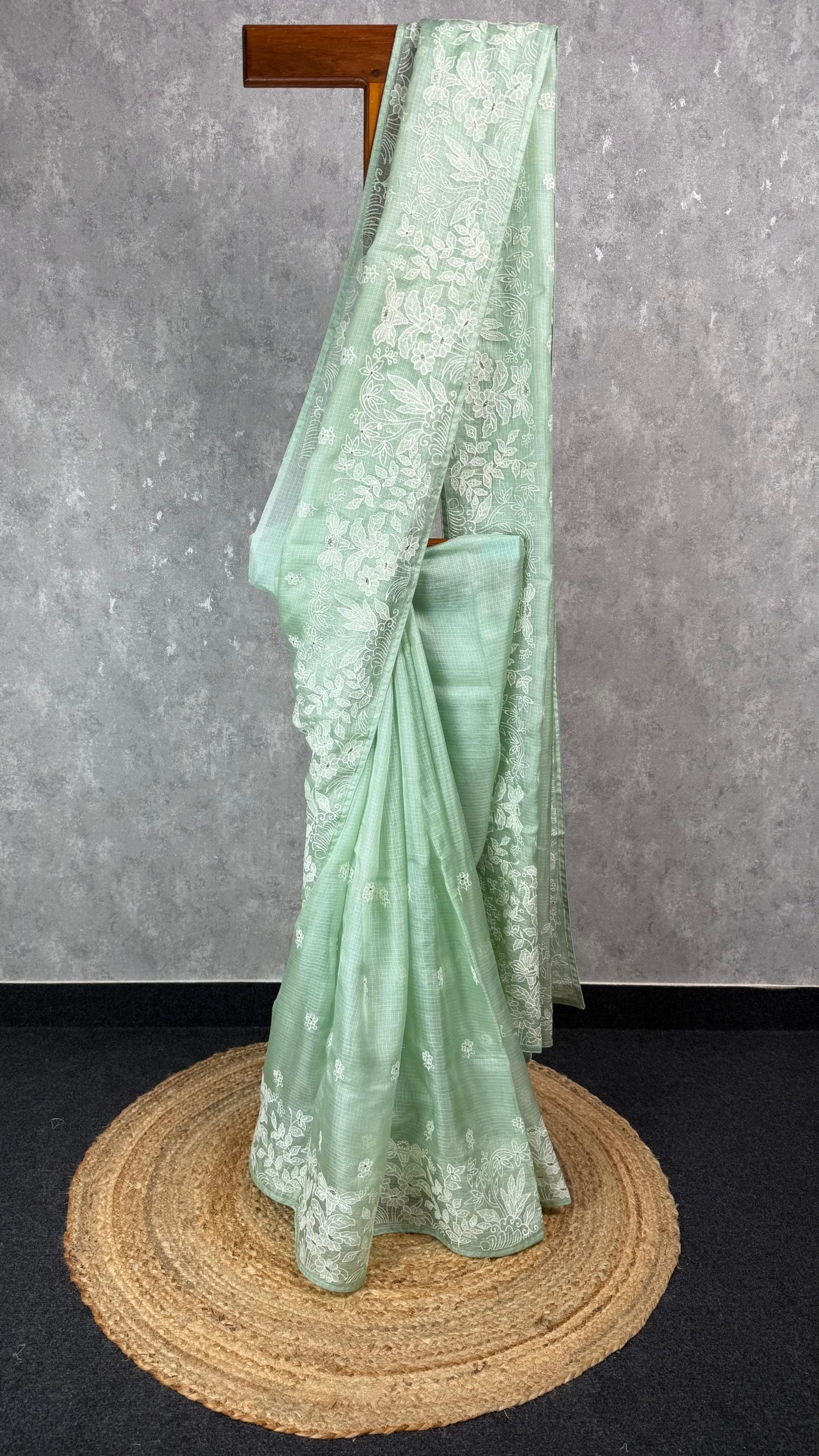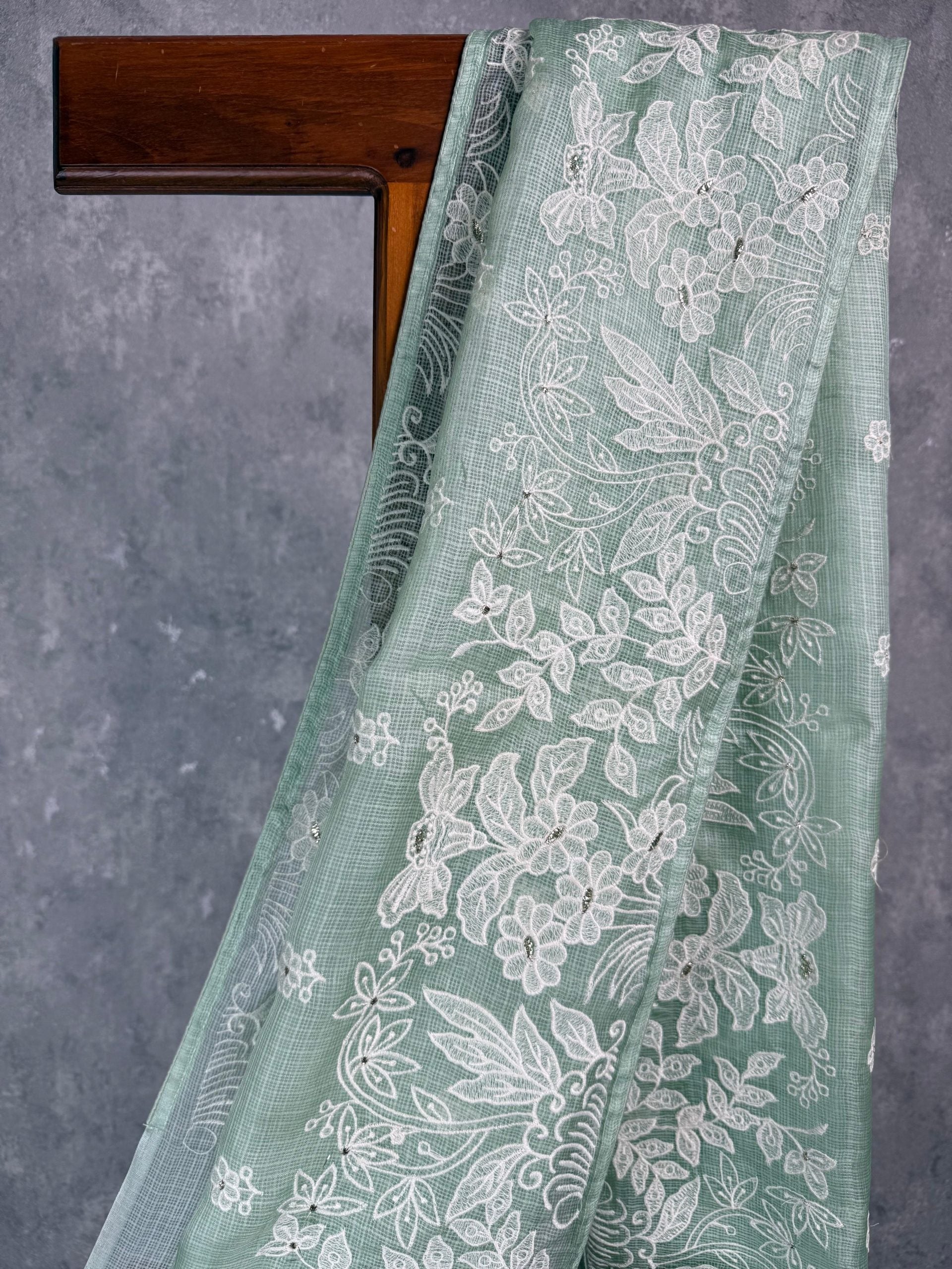 This graceful saree is crafted in a soft pastel sea green shade on a lightweight Tussar Kota base. It features intricate white thread floral embroidery beautifully arranged along the borders and pallu, with delicate motifs scattered across the body. The saree comes with attached blouse piece.