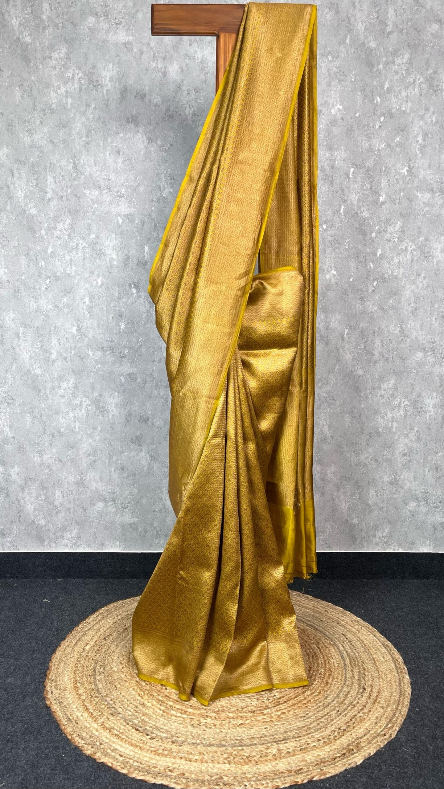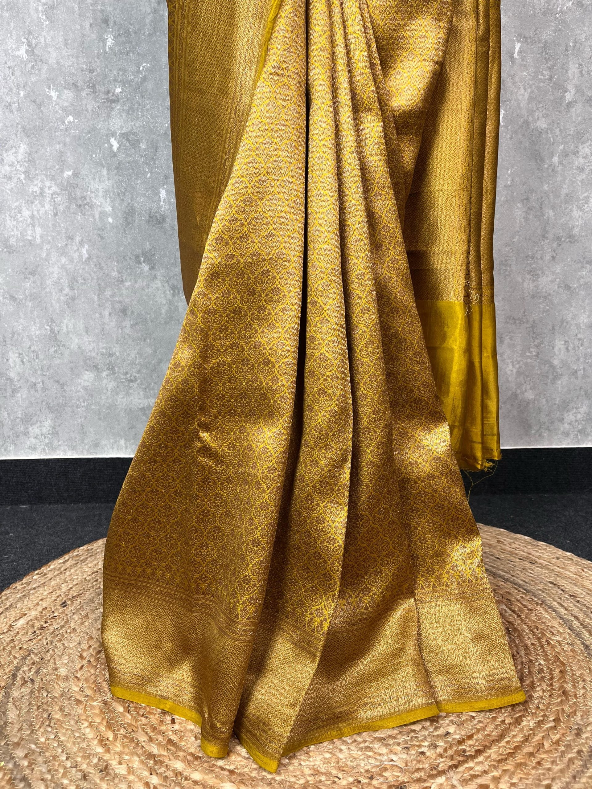 Pure katan silk saree handloom saree with antique zari brocade weave all over the body. The saree has richly woven pallu and blouse piece.
