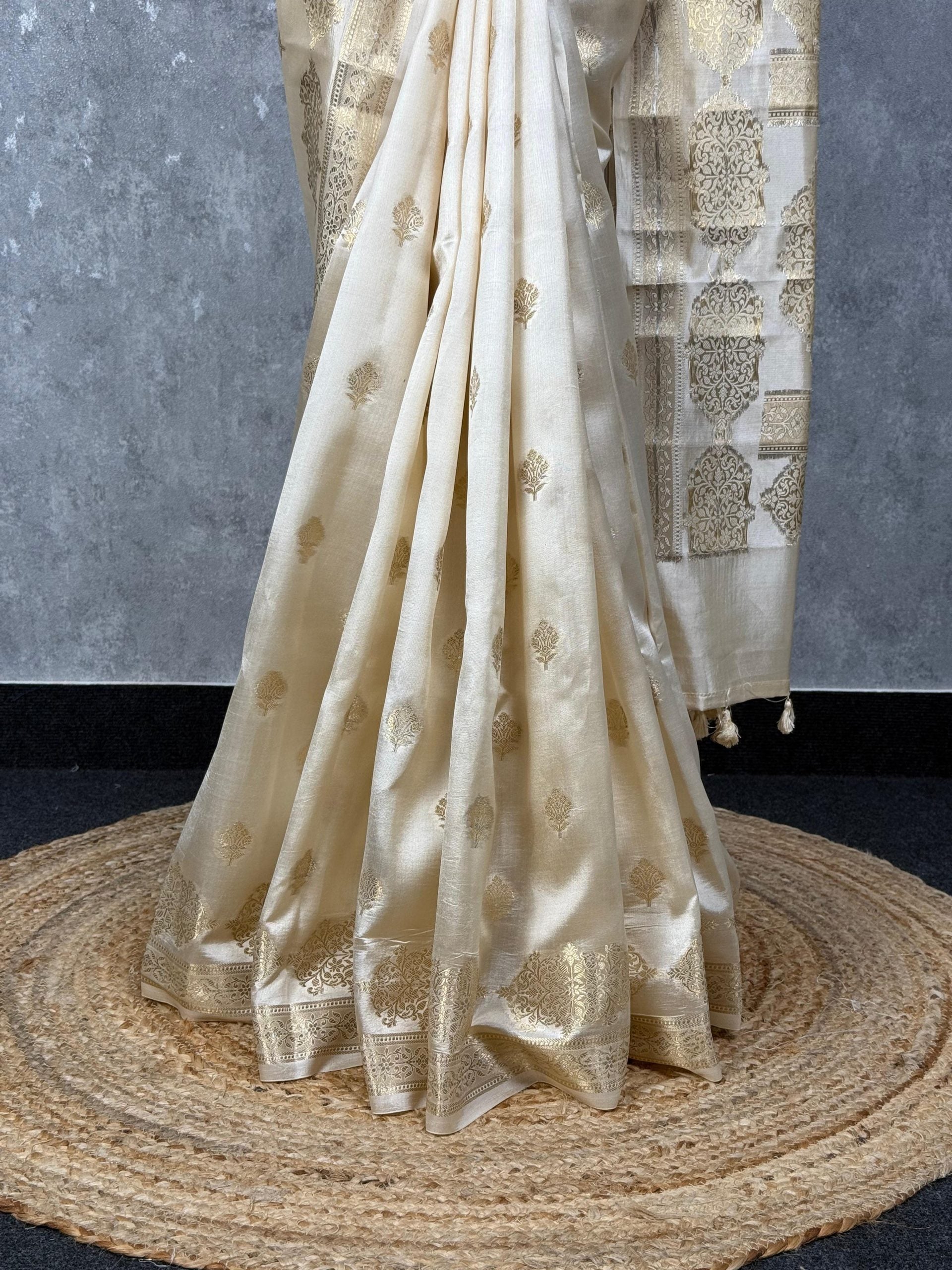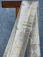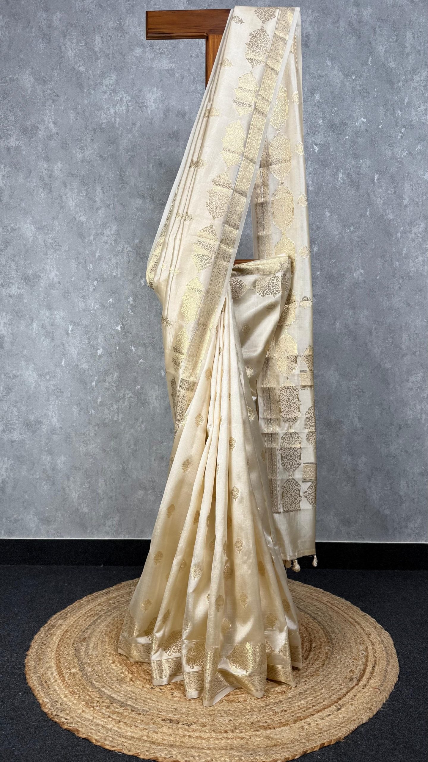 This is a soft Katan silk Banarasi saree featuring elegant zari weaving in traditional motifs. The rich ivory base is beautifully complemented by intricate golden zari work, adding a timeless and regal appeal. The saree comes with attached self color blouse piece.
