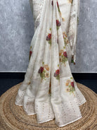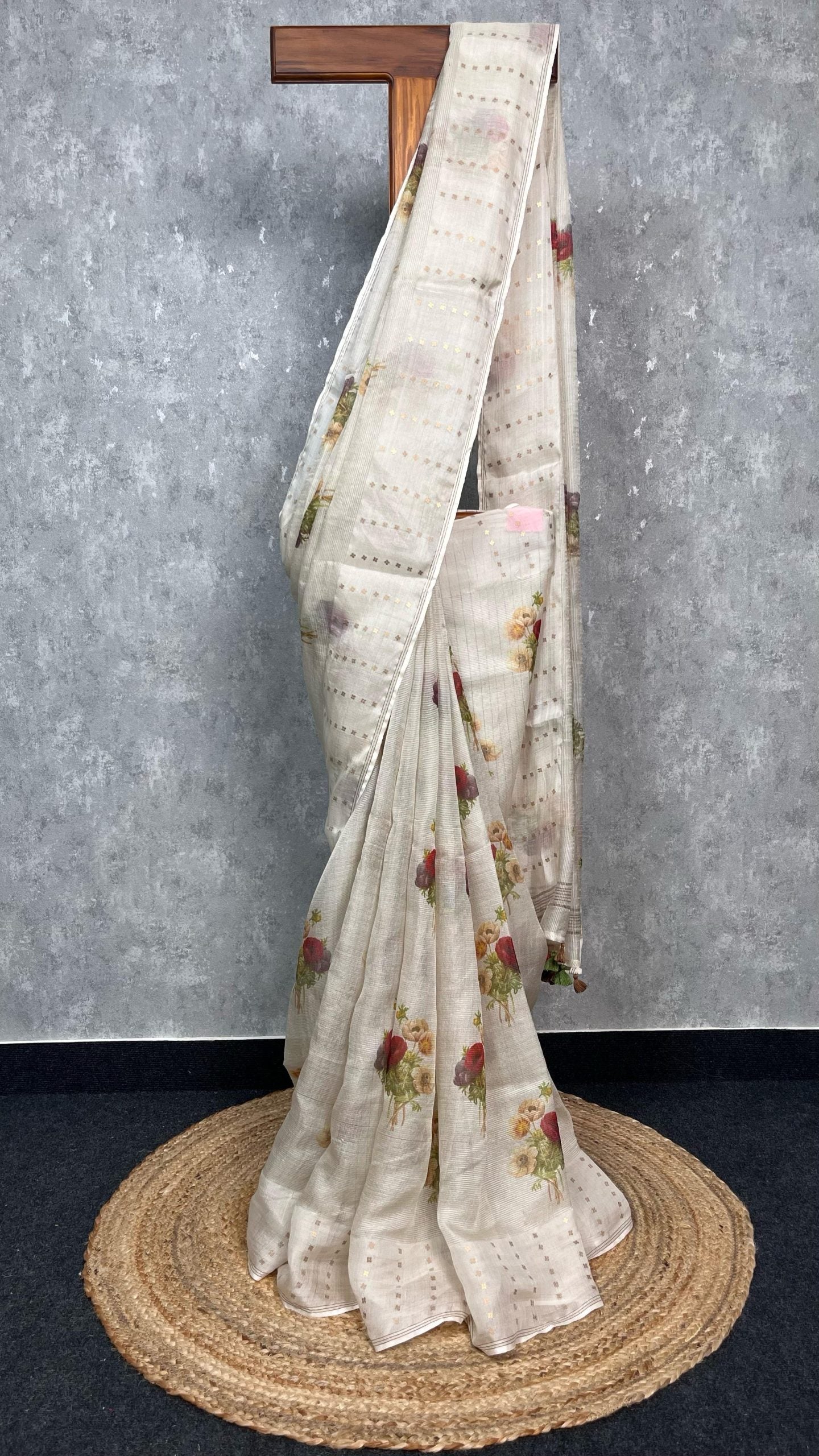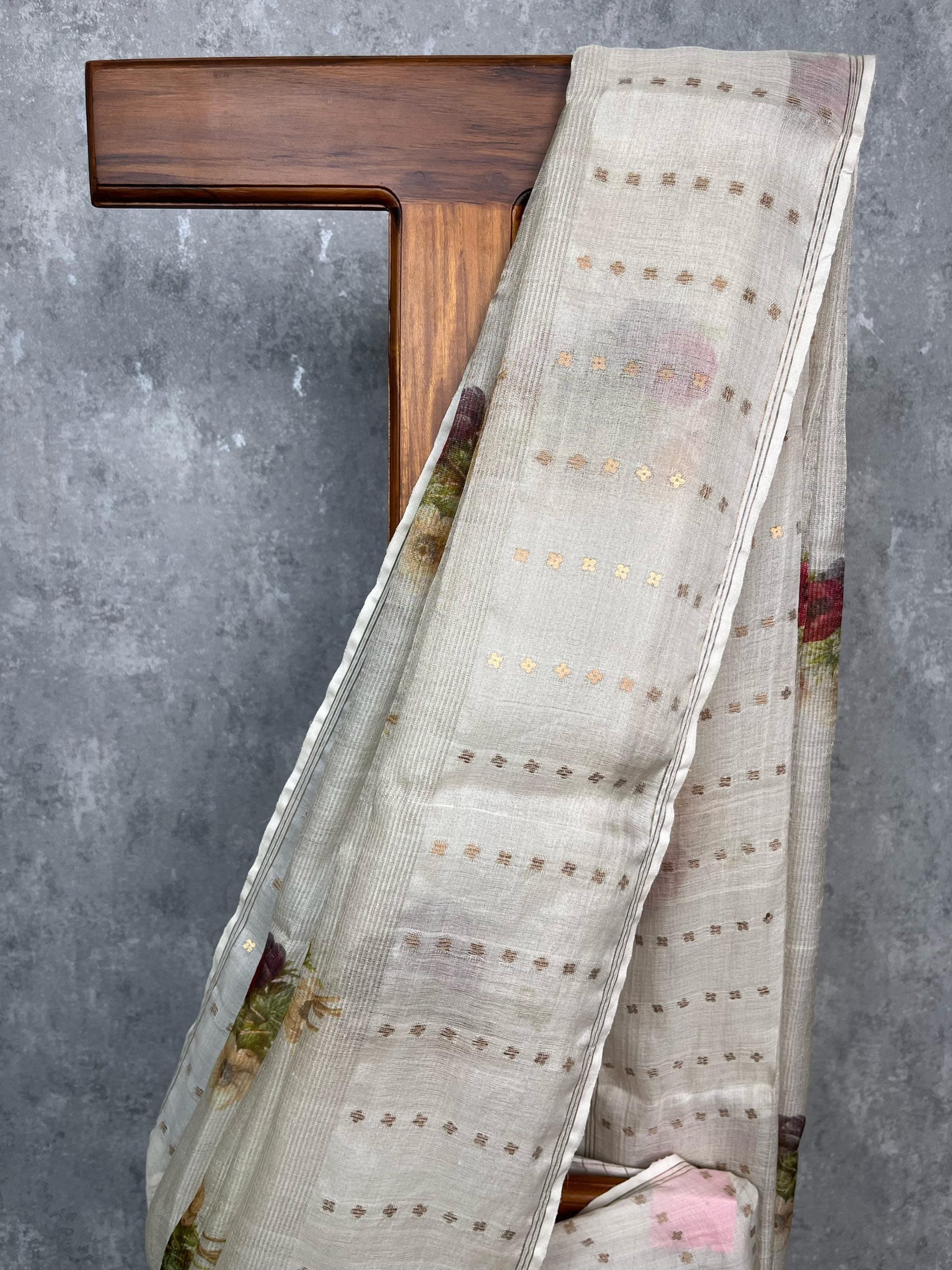 Kora muslin tissue woven saree with floral print all over the body and the saree has organza border with self woven antique color sequence. The saree is in beautiful ivory color and has attached silk based blouse piece.