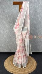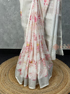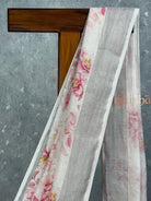 This silk linen printed saree is a beautiful and elegant piece of clothing. The saree is made from a blend of silk and linen, giving it a smooth and luxurious texture. The fabric is adorned with a delicate floral print in shades of pink, adding a touch of femininity and sophistication.The saree comes with attached blouse piece.