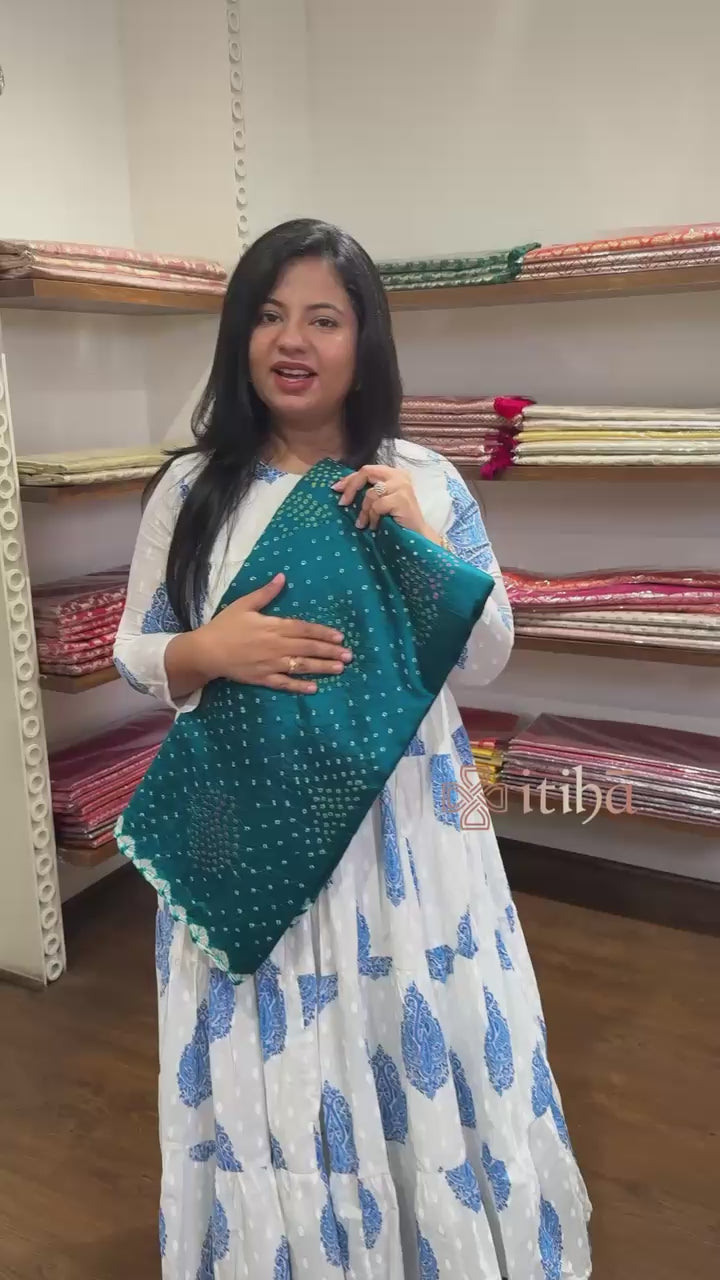 This elegant saree features a rich teal blue shade adorned with intricate Bandhani patterns that exude traditional charm. The beautifully woven zari border adds a touch of grandeur, enhancing its festive appeal. Perfect for special occasions, it offers a graceful blend of heritage and sophistication.