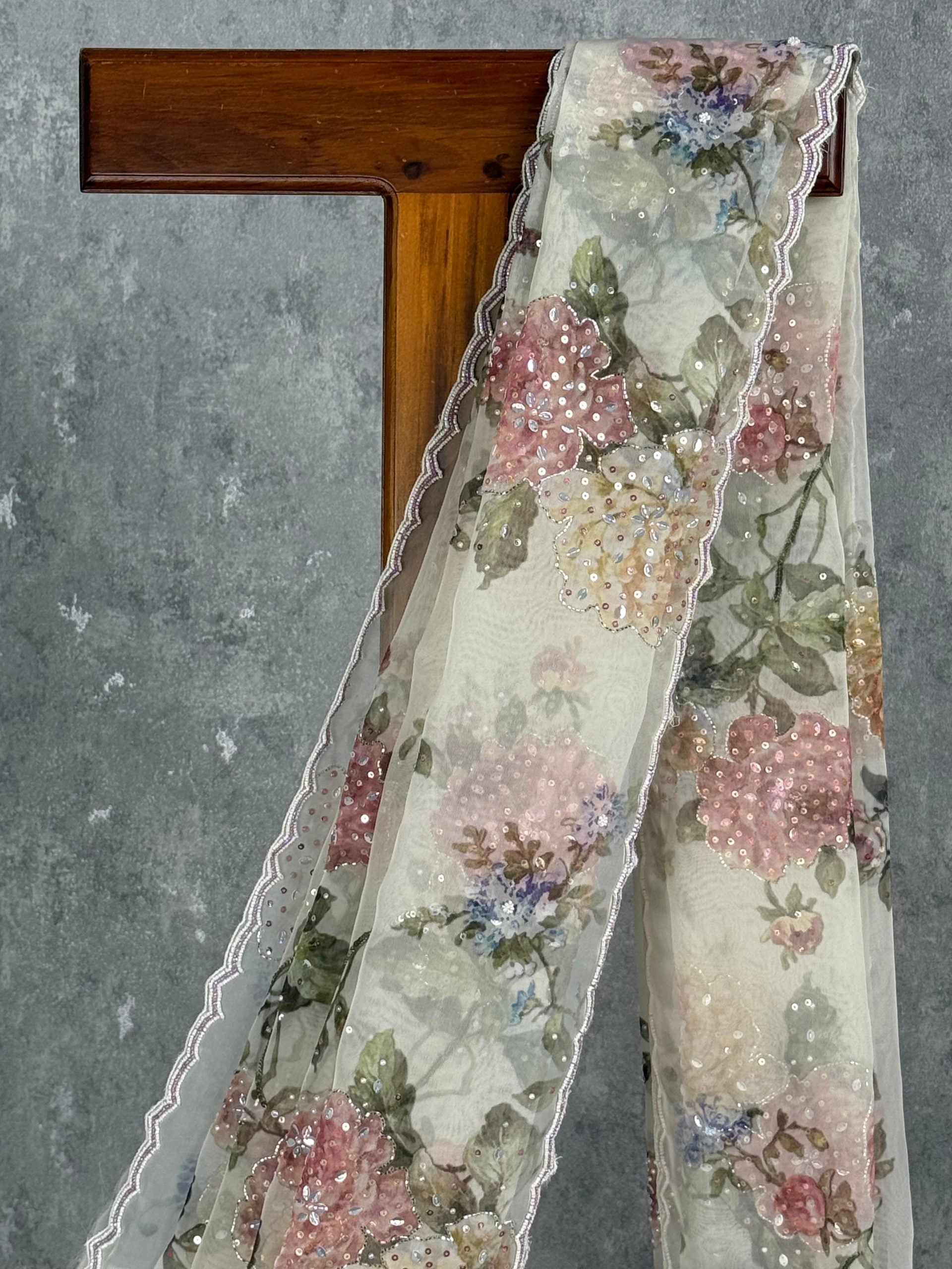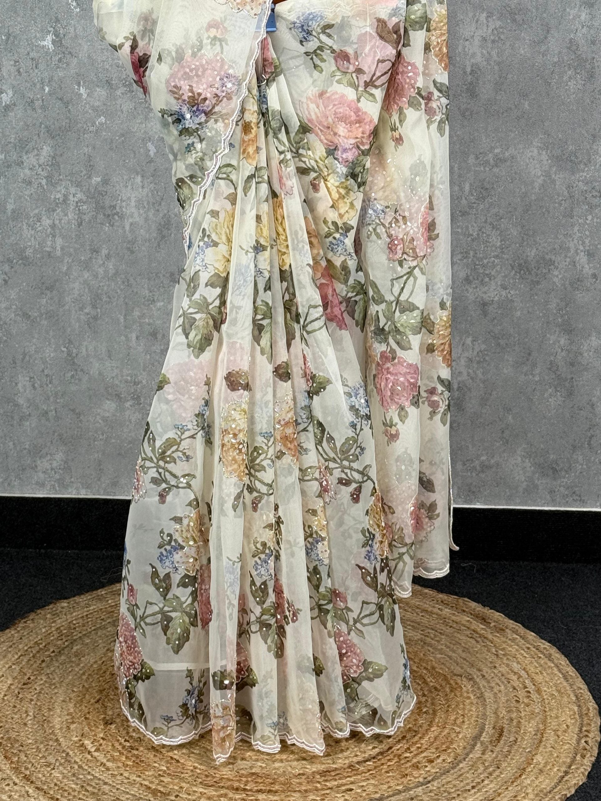 This saree showcases a soft cream base adorned with pastel floral prints and delicate sequin detailing, creating a romantic and timeless look. The blend of subtle hues and shimmering accents adds an elegant charm, perfect for both daytime celebrations and evening gatherings.