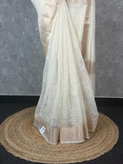 This Semi Kota Embroidery Banarasi Saree features a soft ivory-white base adorned with delicate white floral thread embroidery and the Banarasi woven border adds a traditional touch. The saree comes with attached blouse piece