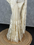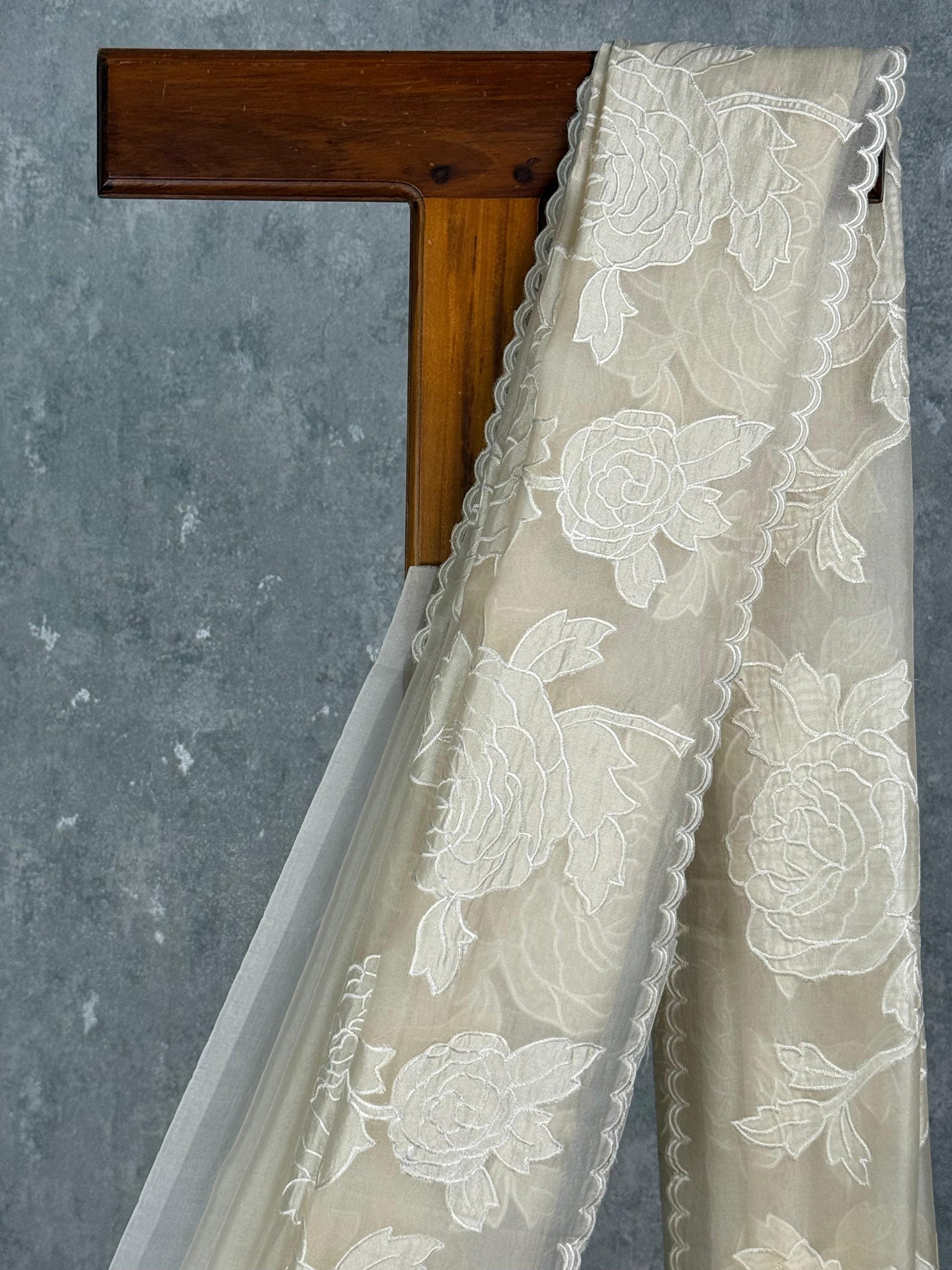 This exquisite off-white saree features intricate floral embroidery that radiates timeless elegance. The delicate scalloped border adds a refined charm, making it a perfect choice for weddings, festive gatherings, or graceful evening events.