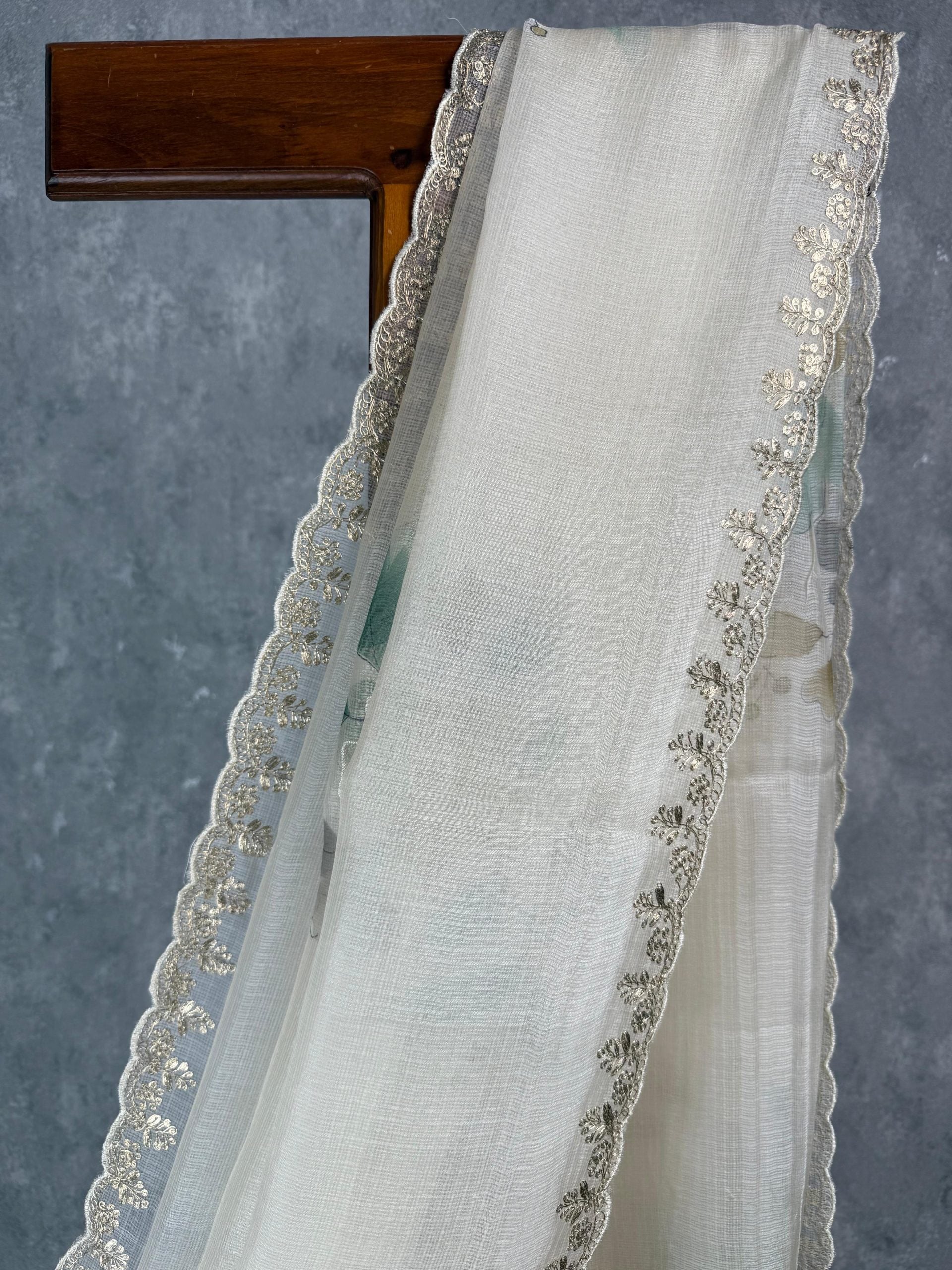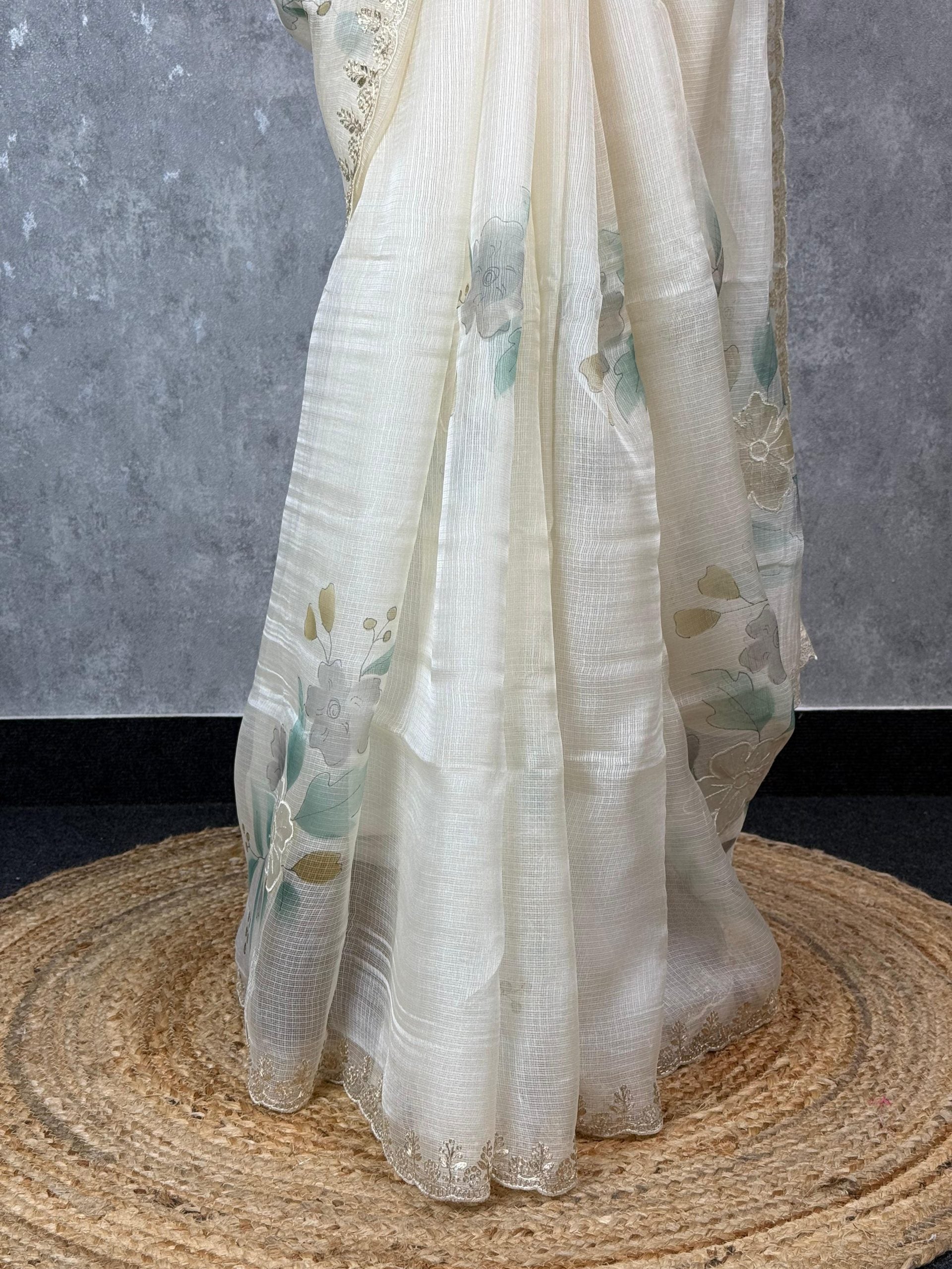 This graceful Tussar kota saree featuring a sheer, lightweight texture with elegant floral embroidery along the border. The soft off-white base with pastel floral accents adds a touch of grace. The saree comes with attached self coloured tussar kota blouse piece.