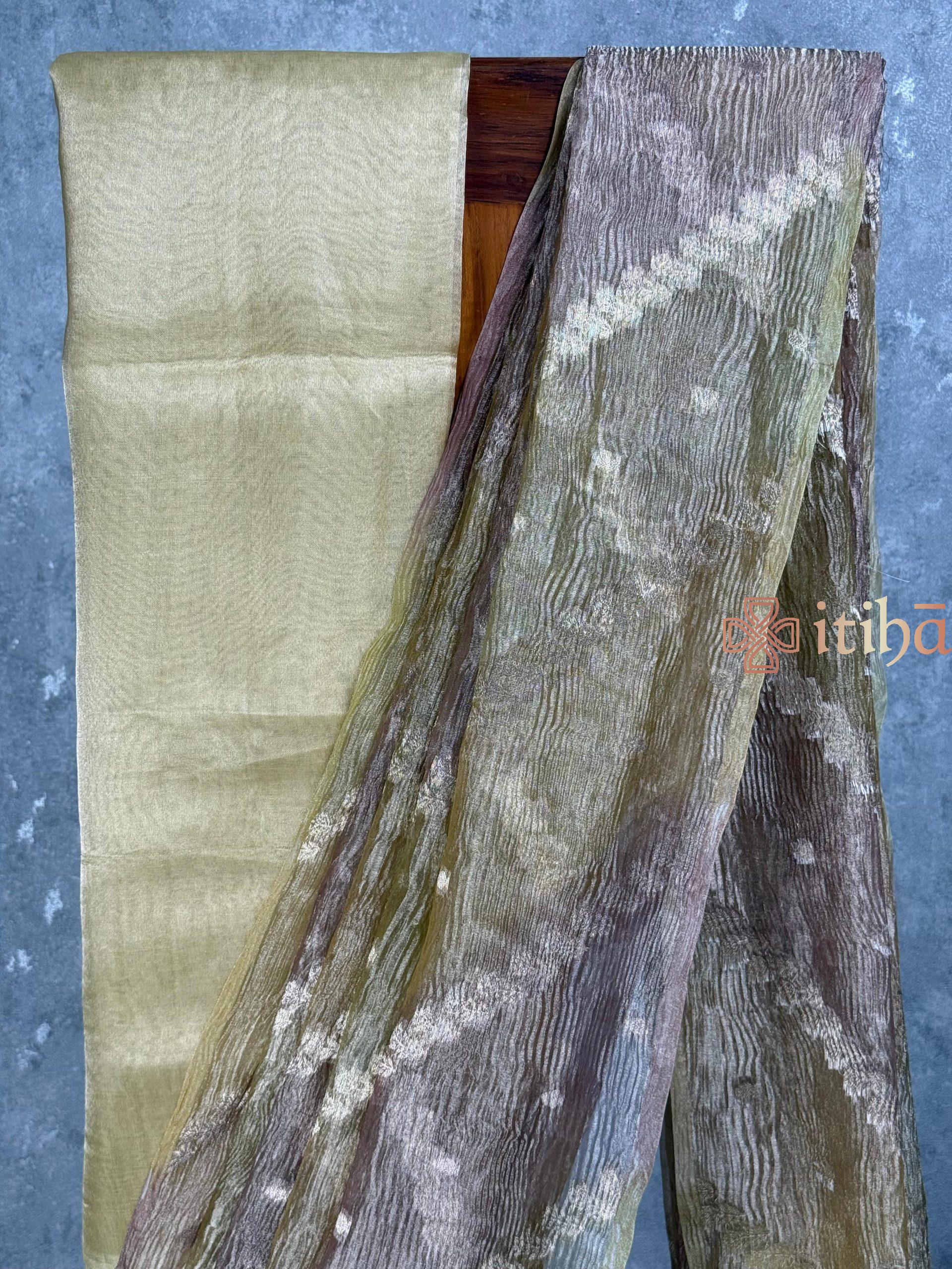 This elegant crushed tissue organza Banarasi saree comes in a beige shade with shimmering golden undertones.It is paired with a matching golden beige blouse that complements the textured drape beautifully.