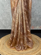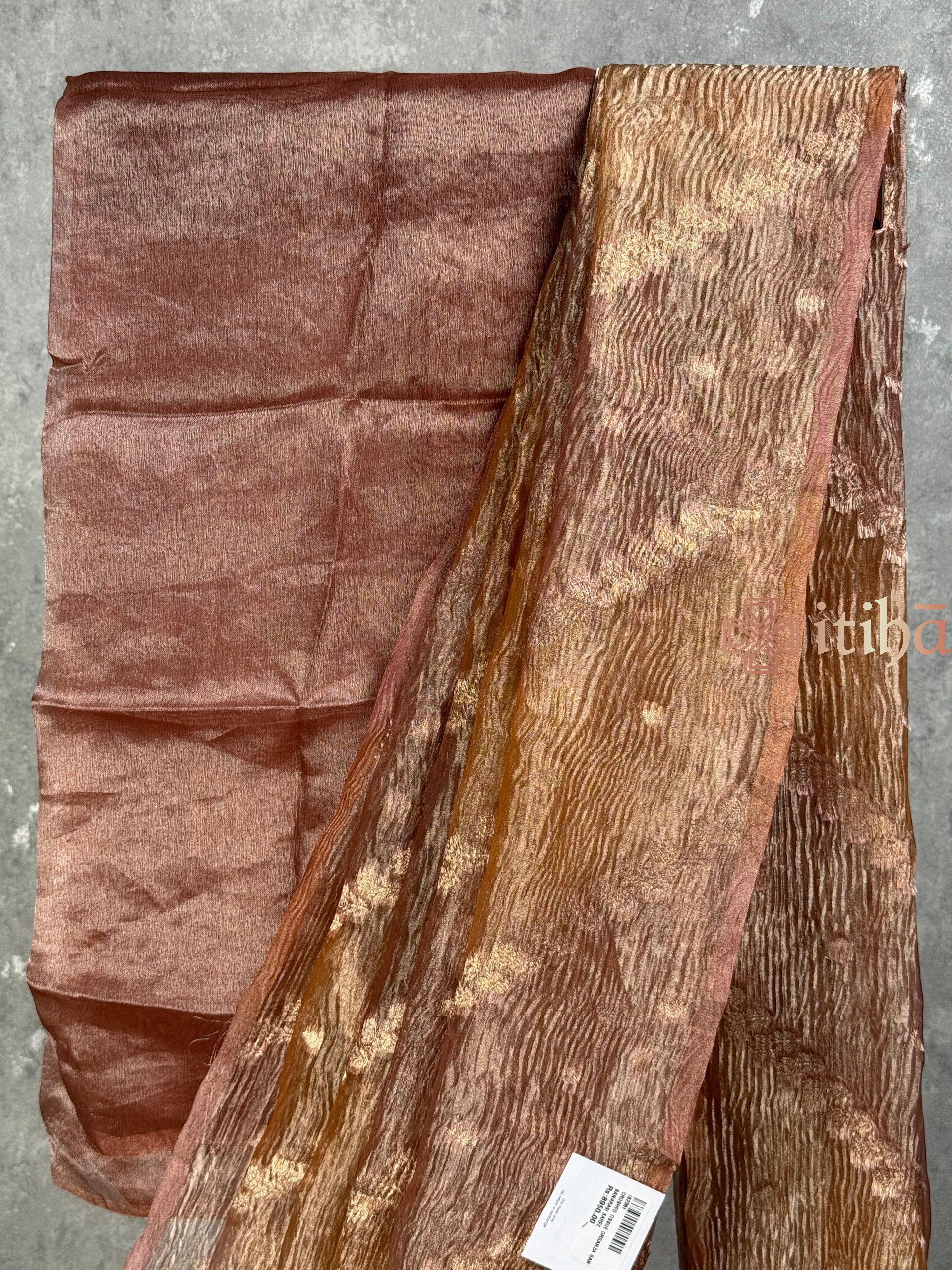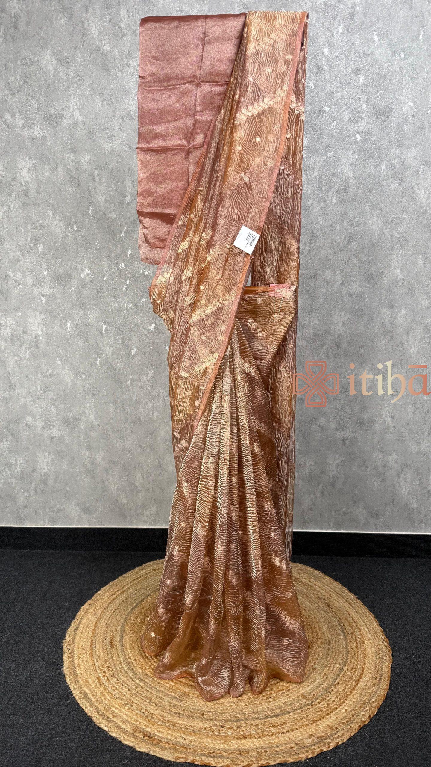 This elegant crushed tissue organza Banarasi saree comes in a rich copper brown shade with shimmering golden undertones.It is paired with a matching copper brown blouse that complements the textured drape beautifully.