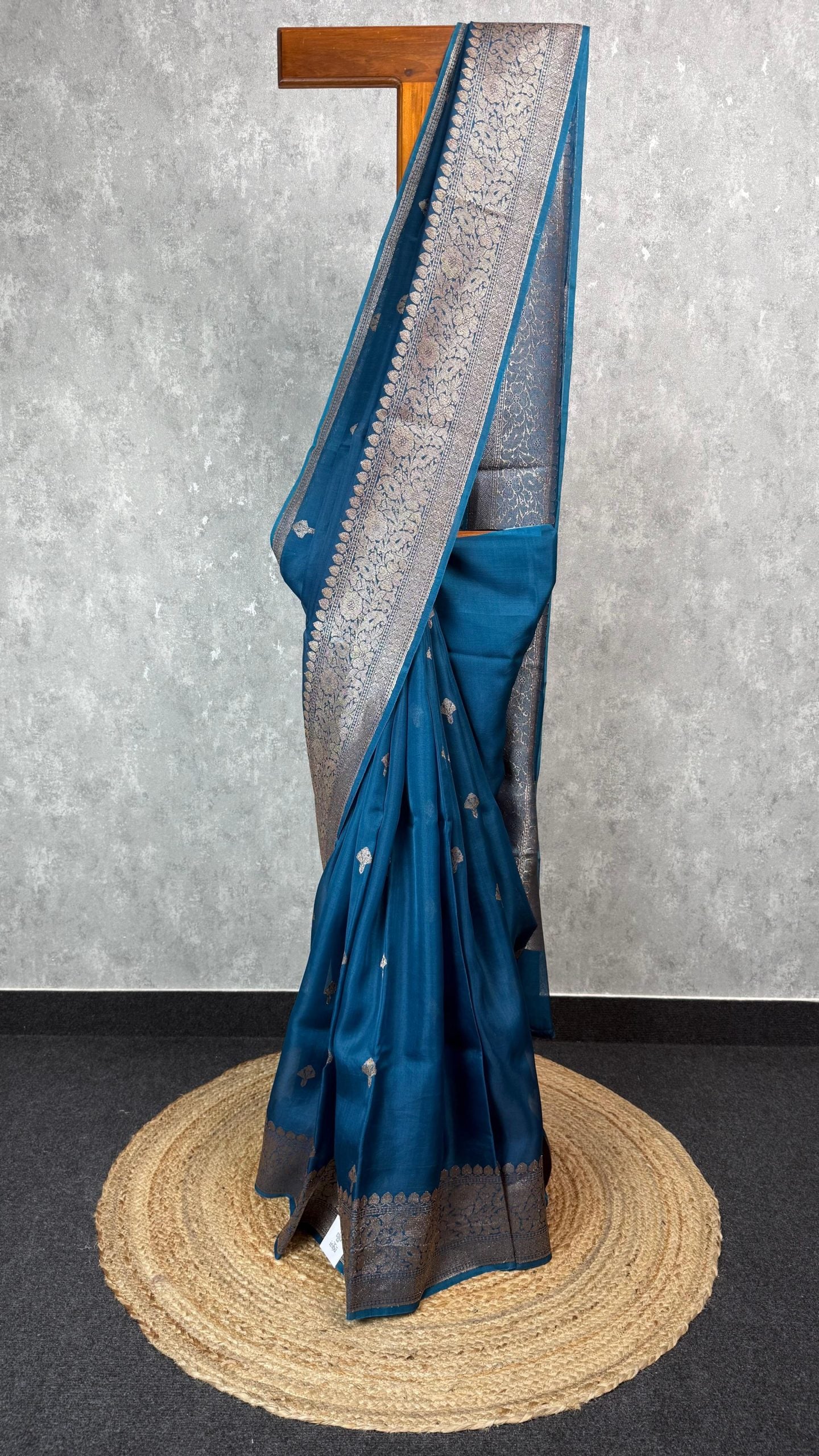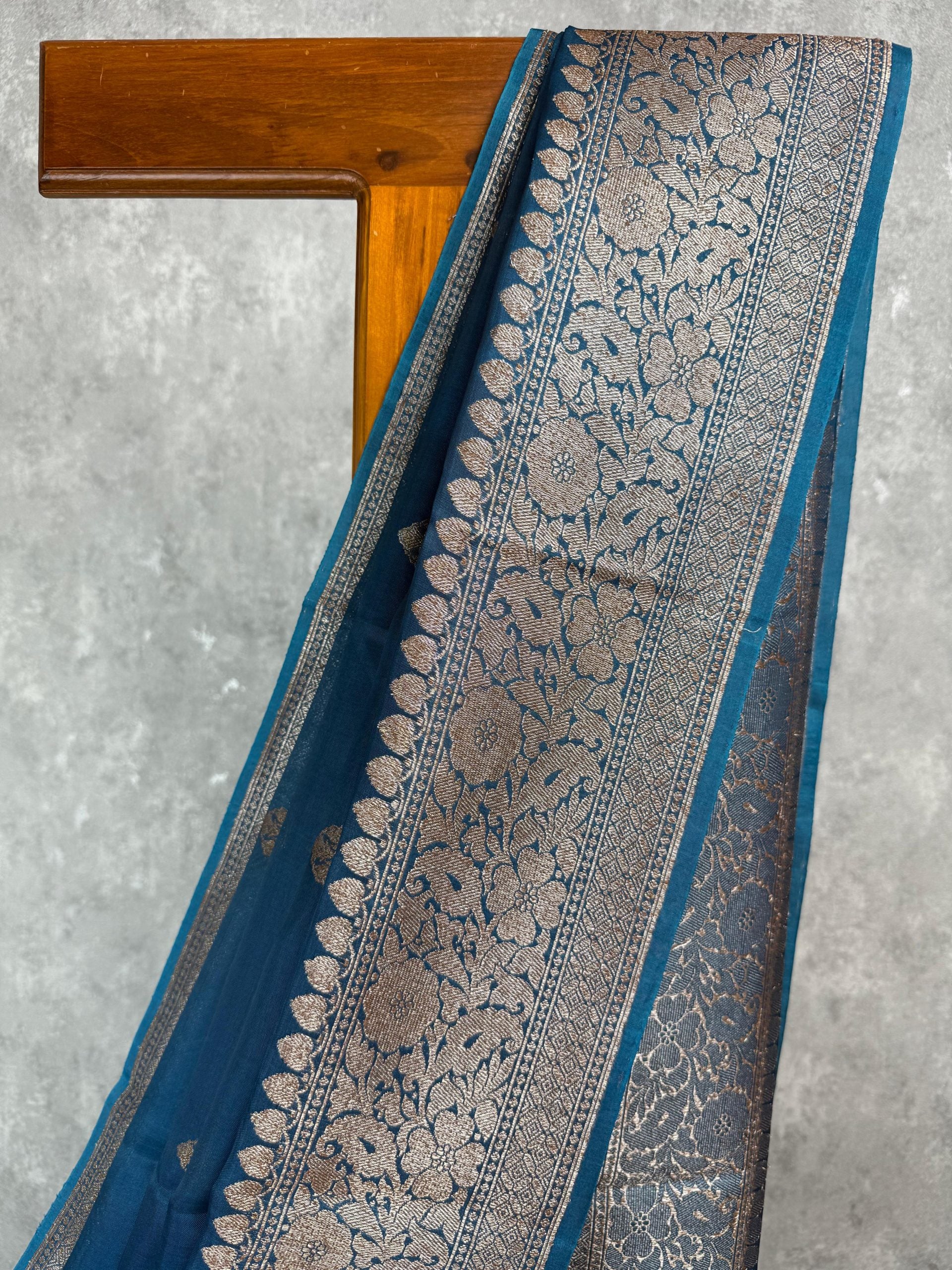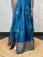 This stunning Banarasi saree is woven in teal blue kora silk, featuring rich antique gold zari across the border and pallu. The body is adorned with delicately spaced antique zari motifs. The saree is attached with self color blouse piece.