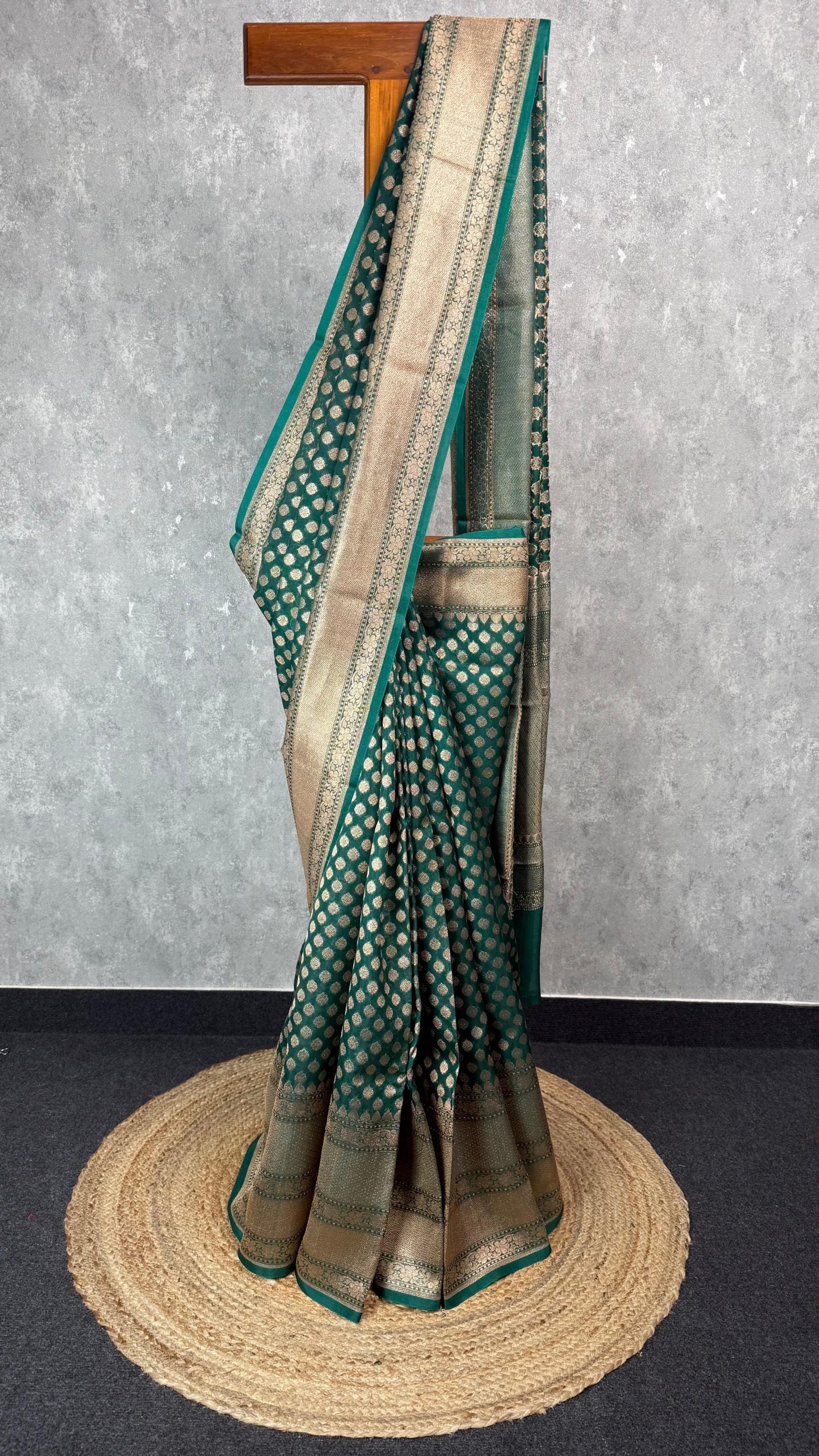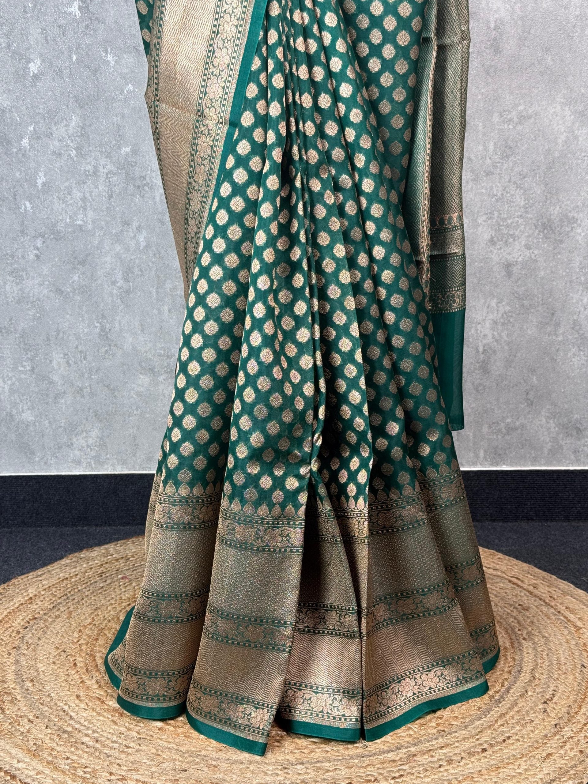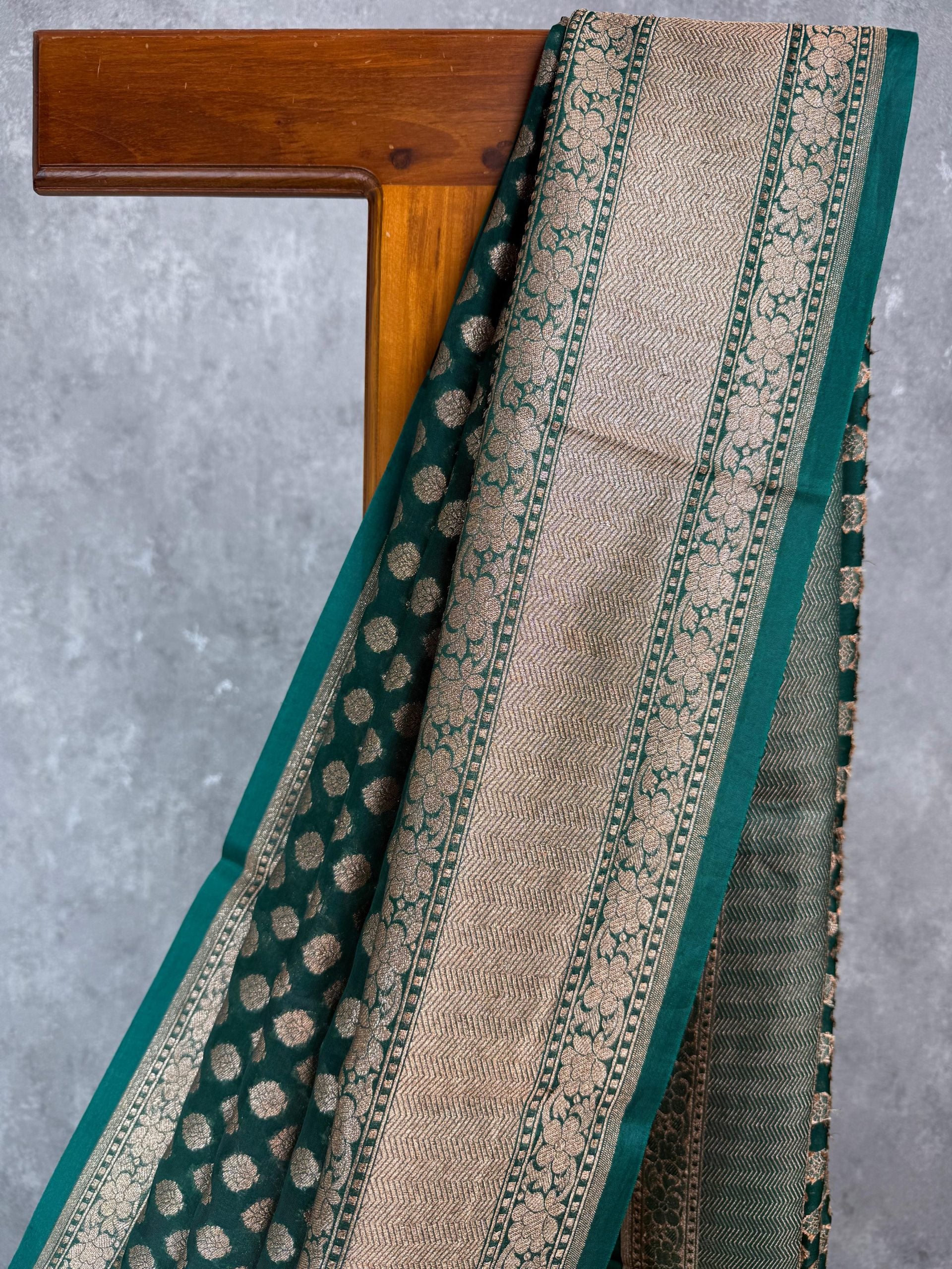 This graceful Banarasi saree is crafted from lightweight kora fabric in a rich bottle green shade. It features elegant water zari but a motifs spread across the body. The saree is beautifully complimented by a broad silver-gold zari border and an intricately woven pallu. The saree comes with attached blouse piece.
