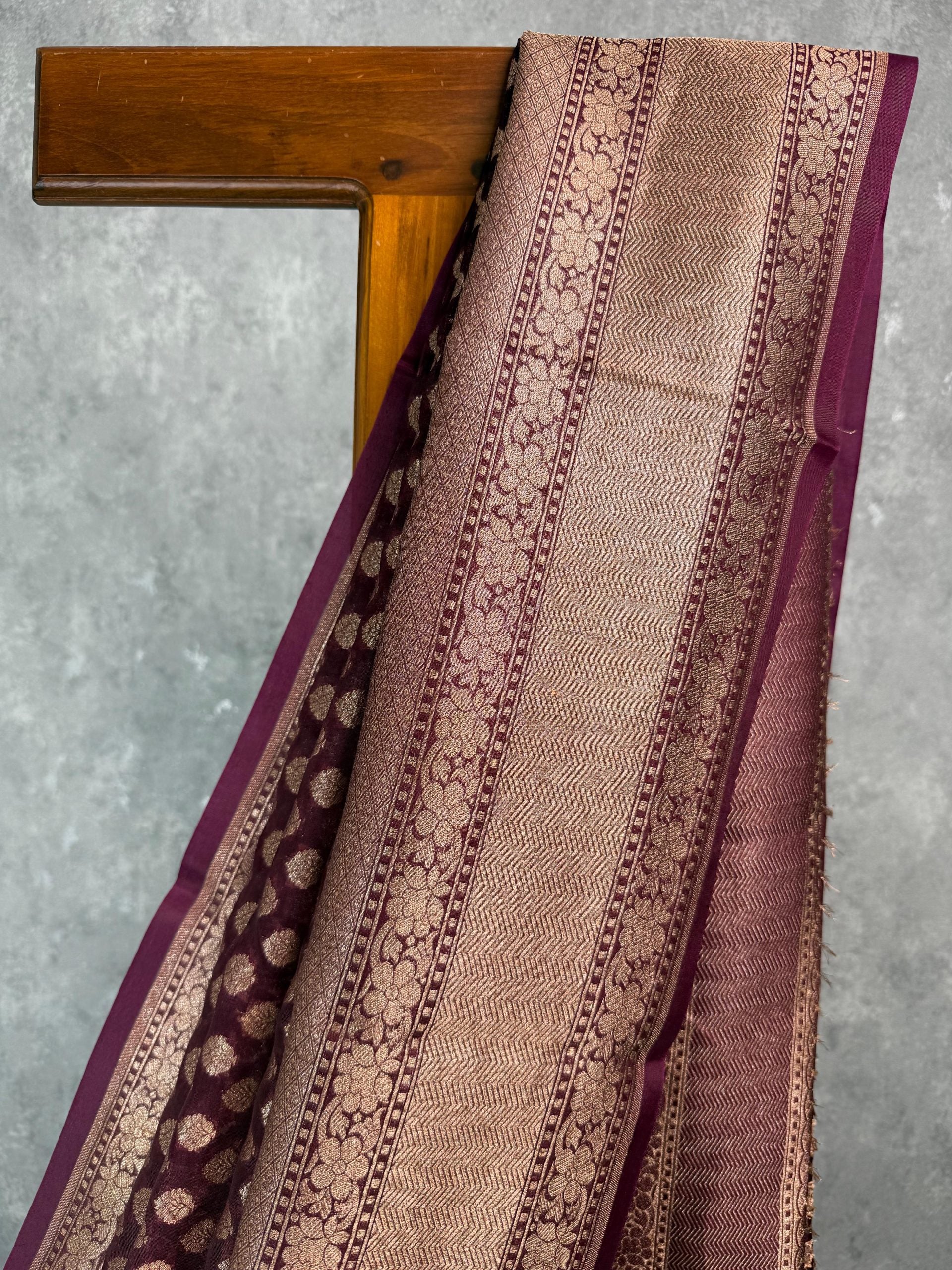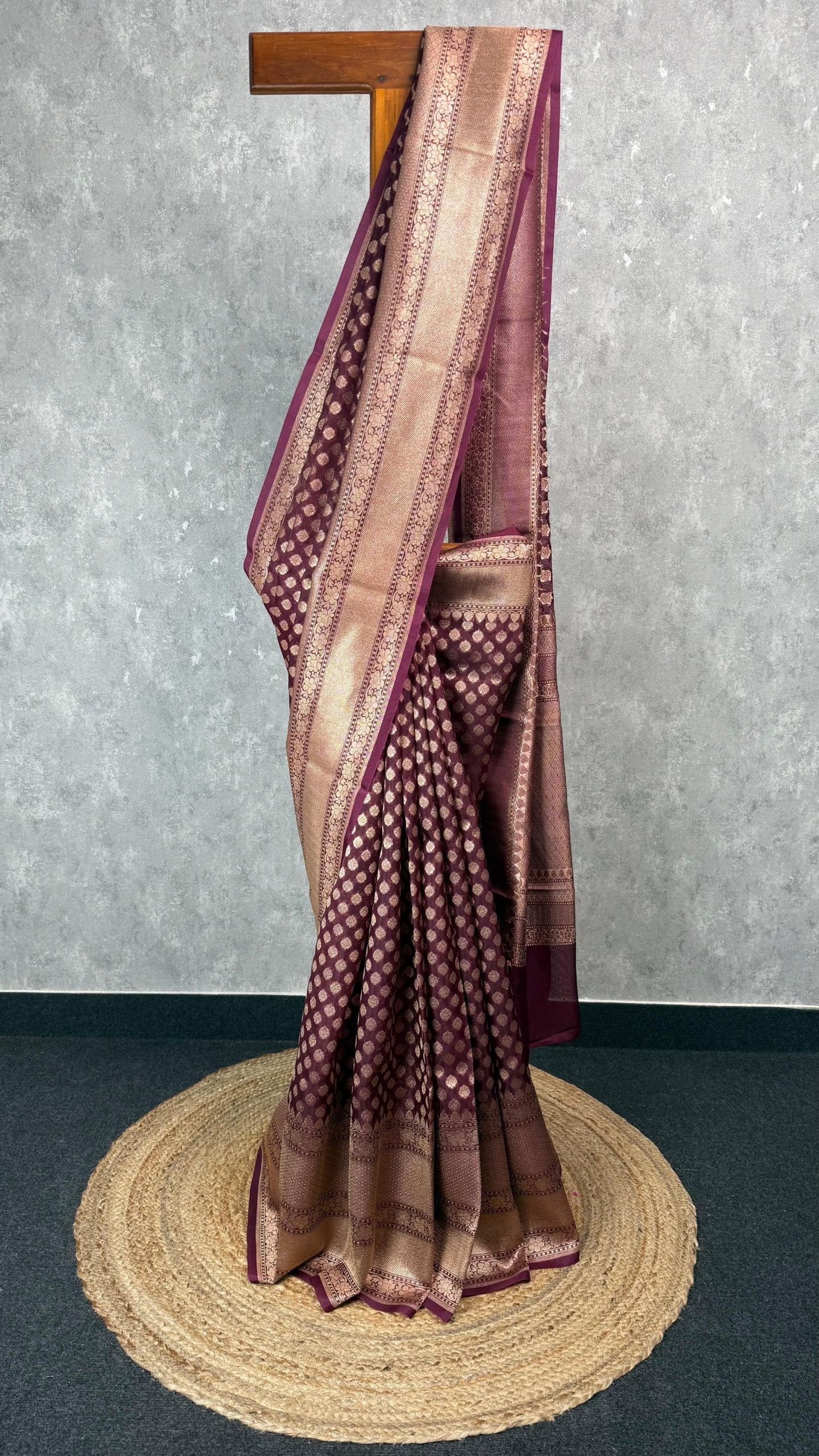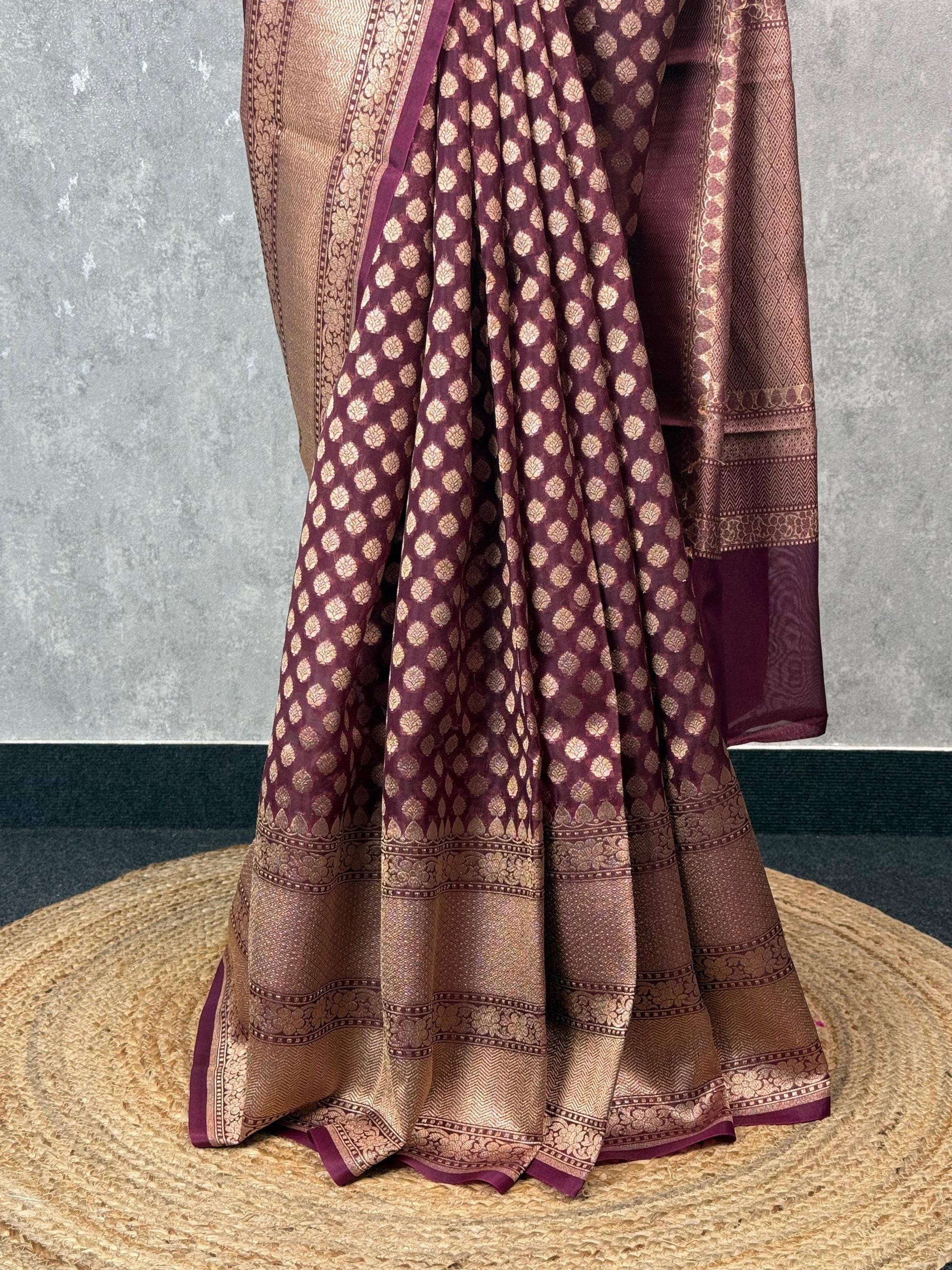 This graceful Banarasi saree is crafted from lightweight kora fabric in a rich grape wine shade. It features elegant water zari but a motifs spread across the body. The saree is beautifully complimented by a broad silver-gold zari border and an intricately woven pallu. The saree comes with attached blouse piece.