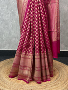 This graceful Banarasi saree is crafted from lightweight kora fabric in a rich rani pink shade. It features elegant water zari but a motifs spread across the body. The saree is beautifully complimented by a broad silver-gold zari border and an intricately woven pallu. The saree comes with attached blouse piece.