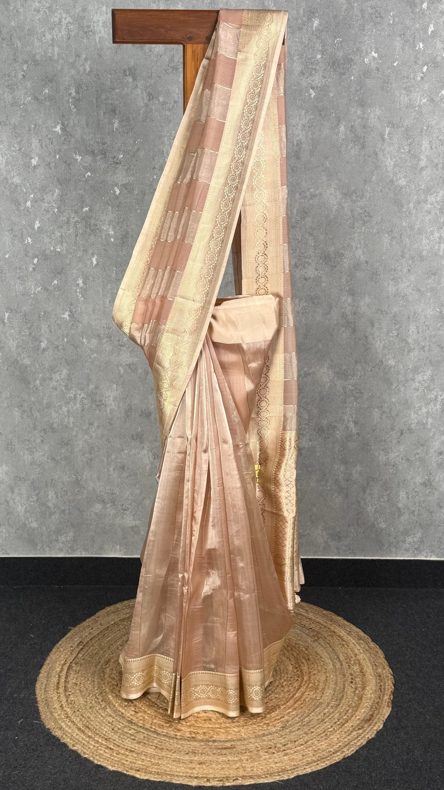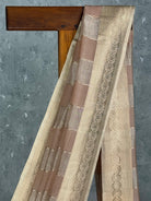 This elegant saree in a subtle beige-golden hue radiates sophistication and charm. Adorned with intricate zari work and a graceful checkered pattern, it reflects timeless craftsmanship. Perfect for festive occasions and celebrations, this saree adds a touch of understated luxury to your wardrobe.
